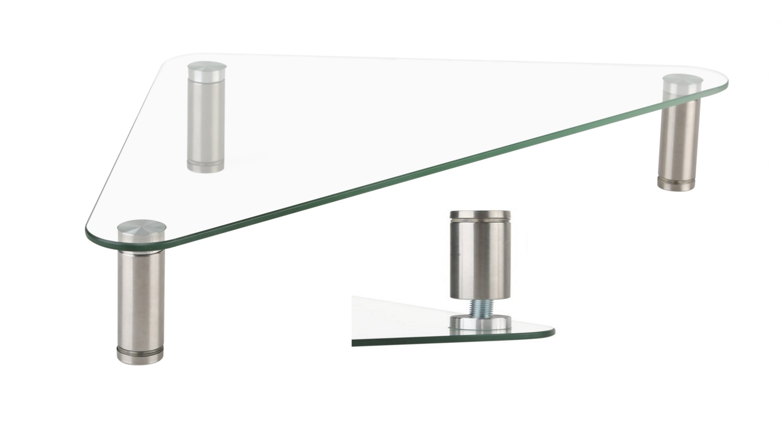 Een mooie stevige en functionele design hoekmodel monitorverhoger beeldschermverhoger in een driehoek uitgevoerd met aluminium pootjes in hoogte verstelbaar van 7.5 cm tot 9 cm en een blad van veilligheidsglas. Dit driehoeks model monitor beeldscherm verhoger past op elk bureau of tafel en is een blikvanger in elk interieur. Bespaar ruimte door het plaatsen van uw beeldscherm of monitor in de hoek. Maximaal belastbaar gewicht is 20 kilo. Afmetingen 50 cm breed x 28 cm diep x 7.5 cm tot 9 cm hoog.