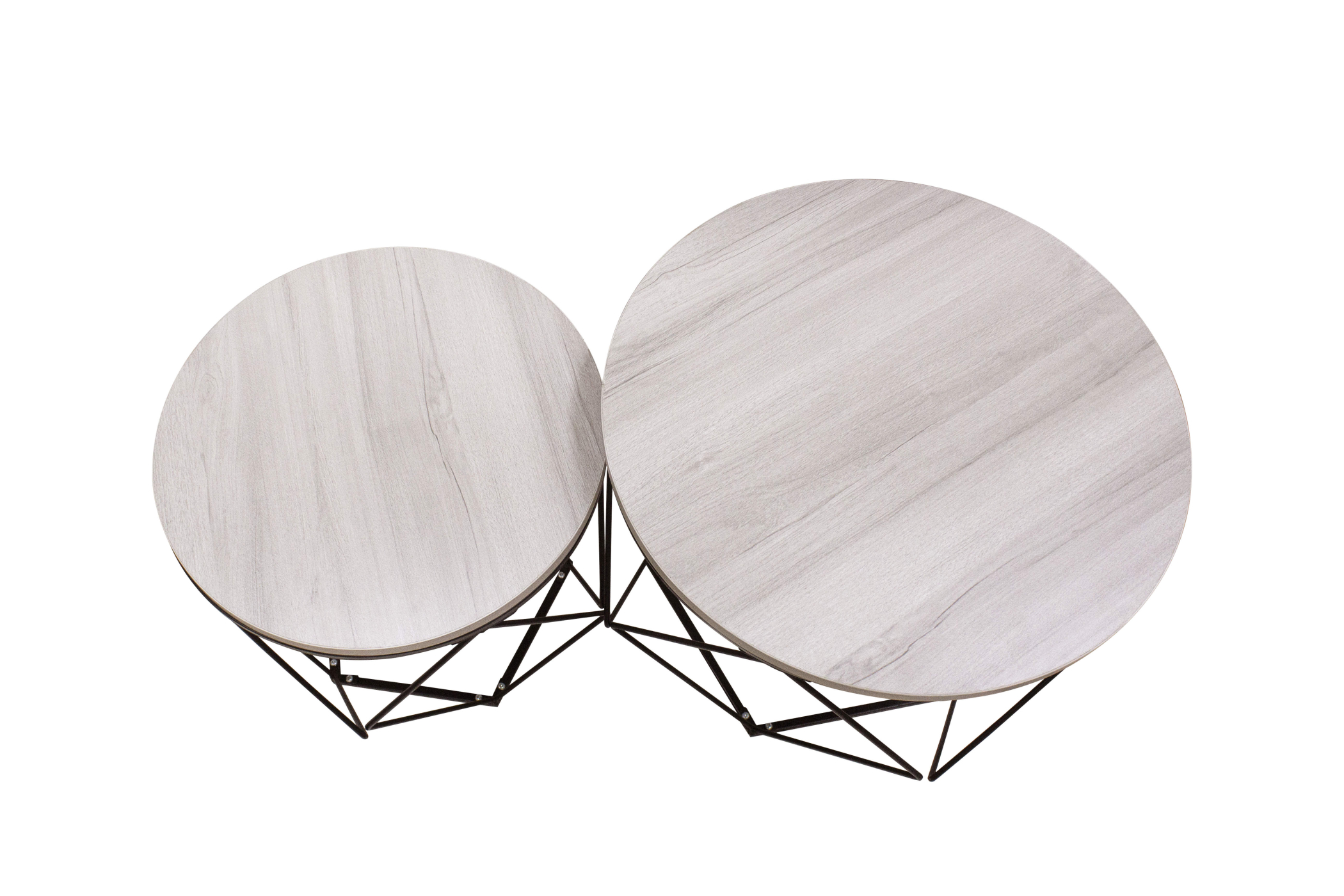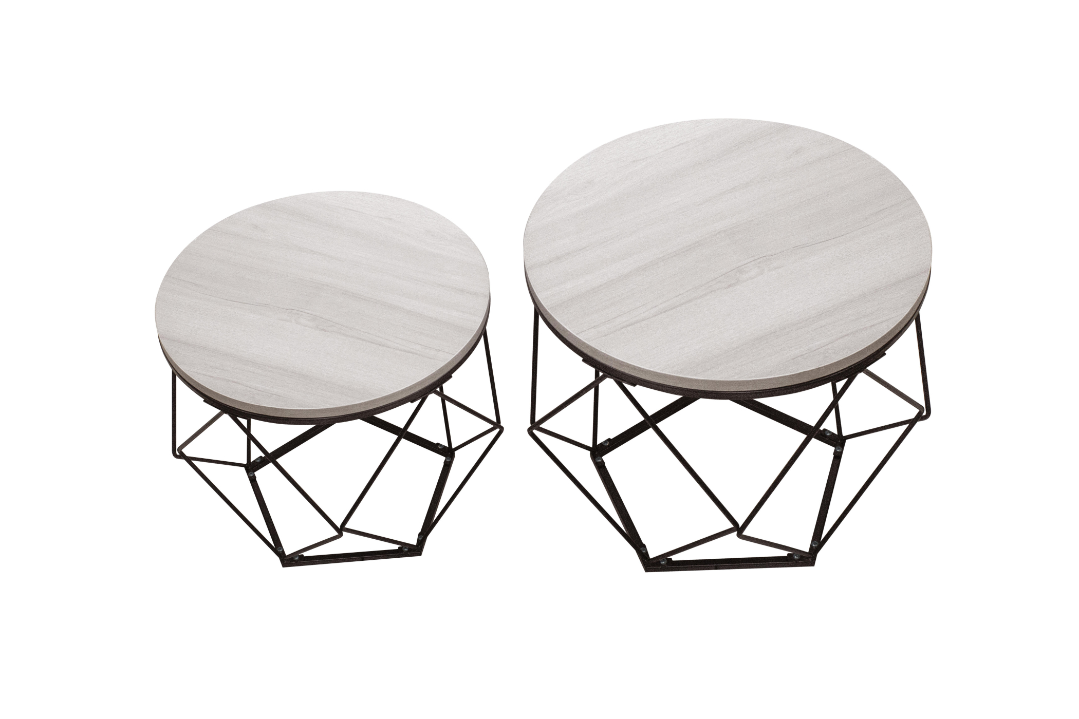 Twee bijzettafeltjes met een metalen onderstel en een lichtbruin blank kleurig tafelblad. Een trendy ontwerp in een industriële vintage stijl. Geschikt voor elk interieur en in elke ruimte van uw woning als salontafeltjes of bijzettafeltjes  De afmeting zijn 40 cm x 40 cm x 37 cm en 50 cm x 50 cm x 41 cm.