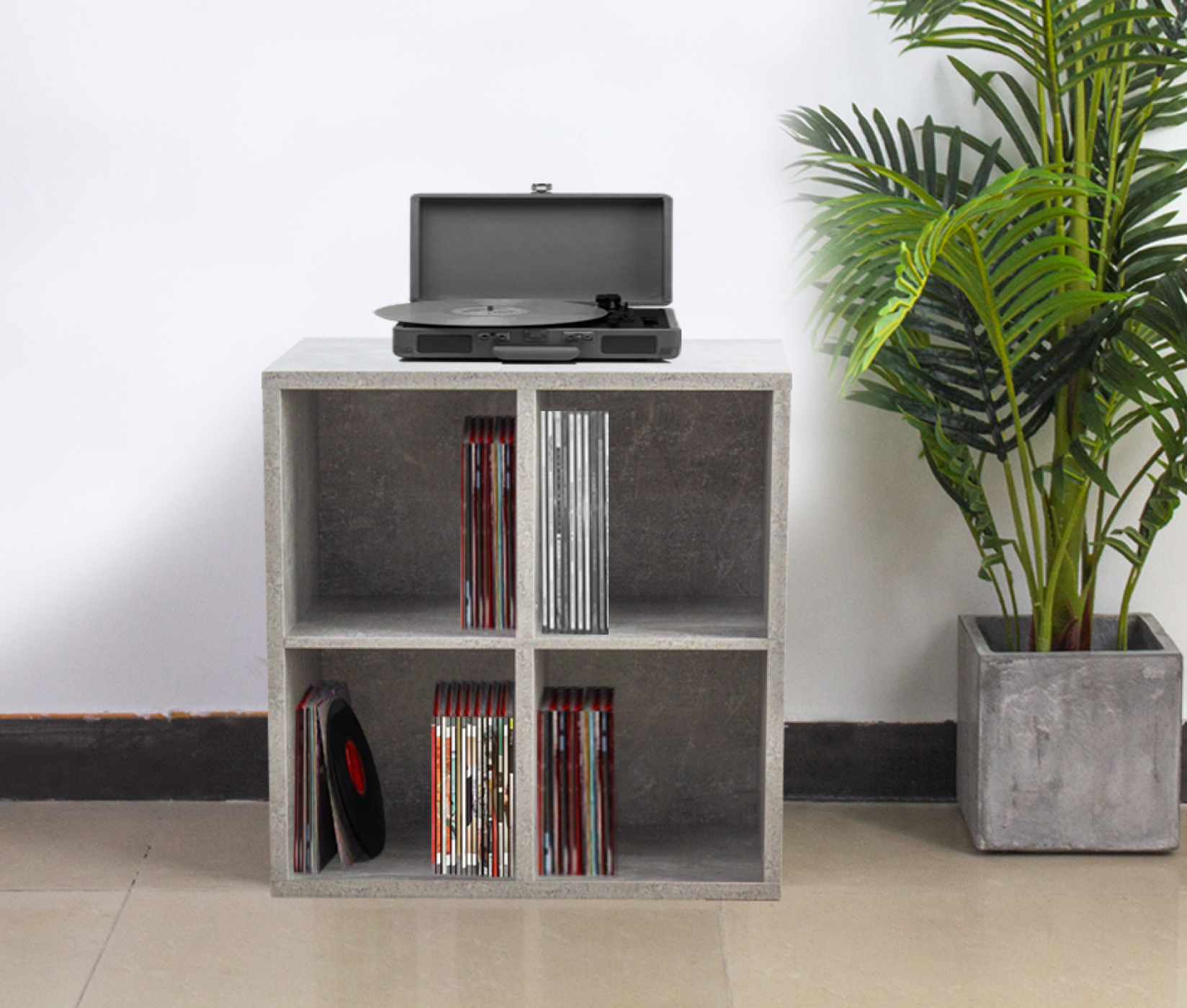 Een stevige en simpele maar multifunctioneel te gebruiken grijs beton kleurige vakkenkast met 4 open vakken voor het opbergen en tonen van bijvoorbeeld verzamelingen of boeken maar ook andere woonaccessoires. Deze wandkast open vakkenkast heeft legplanken waardoor er 4 vakken ontstaan. Deze opbergkast is natuurlijk ook universeel te gebruiken in uw kantoor werkkamer slaapkamer of woonkamer. De levering is in delen incl. montagehandleiding en montagemateriaal. Buiten afmetingen van dit meubel zijn: hoogte 70.5 cm x breed 70.5 cm x diepte 34,5 cm.