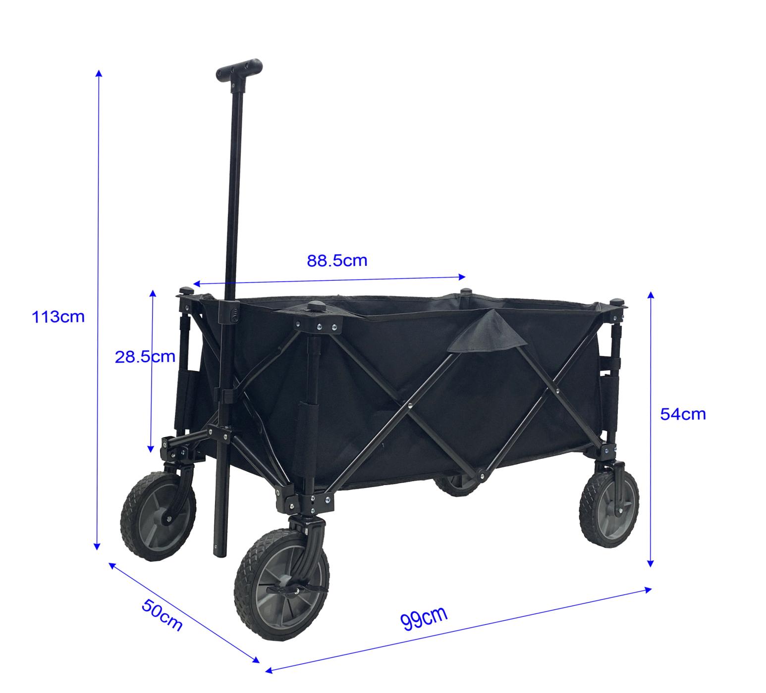 Deze robuuste opvouwbare bolderkar is de perfecte metgezel voor het vervoeren van spullen naar diverse locaties zoals het strand, zwembad, kampeerplaats, picknick of evenementen. Met een stevig stalen frame, zowel een trekstang als een duwstang, en draaibare wielen, biedt deze bolderkar alles wat je nodig hebt voor moeiteloos transport. De ruime binnenafmetingen van 88 cm lengte x 48 cm breedte x 28.5 cm diepte zorgen voor voldoende opbergruimte.