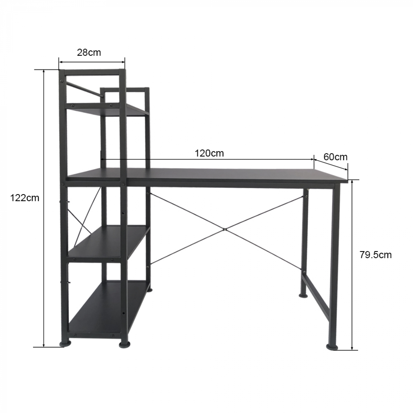 Een functioneel robuust en stabiel industrieel vintage bureau meubel met een zwart metalen frame en zwart houten tafelblad van 120 cm breed. Door het ontwerp van een metalen constructie van 122 cm hoog zijn er 3 extra opbergplanken van 28 cm breed en 60 cm diep beschikbaar voor het plaatsen van uw pc desktop uw printer ordners of andere items die u graag snel bij de hand wilt hebben. Perfect te gebruiken als computertafel bureau in uw kantoor studeerkamer woonkamer werkkamer of slaapkamer. De afmetingen van deze tafel zijn breed 120 cm x diep 60 cm x hoog 79 tot tafelblad en links tot hoogste beugel 122 cm. Levering inclusief montage instructie en benodigde materialen.