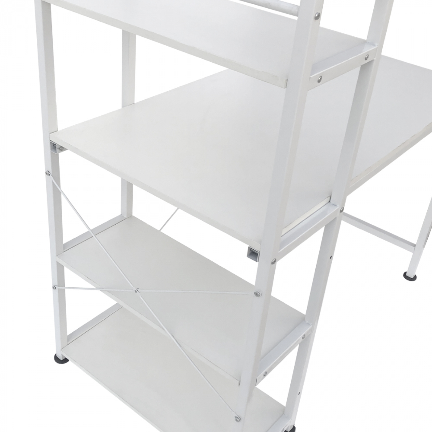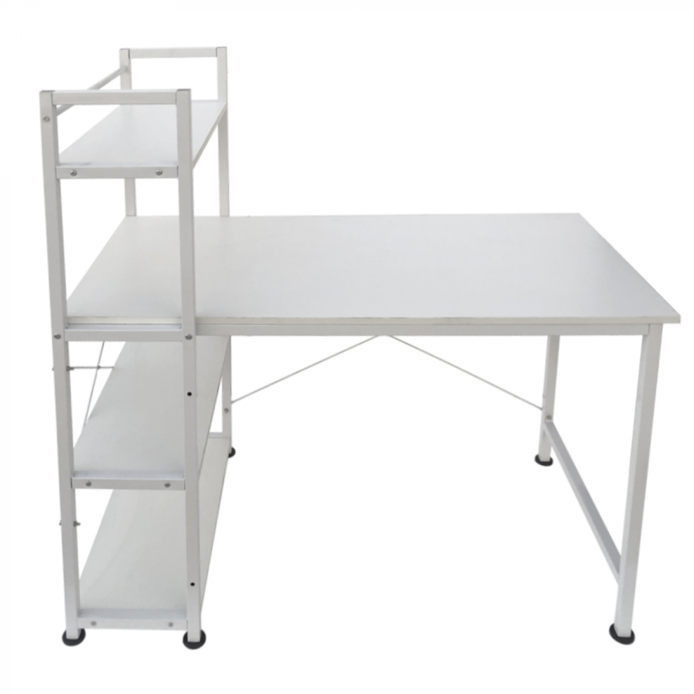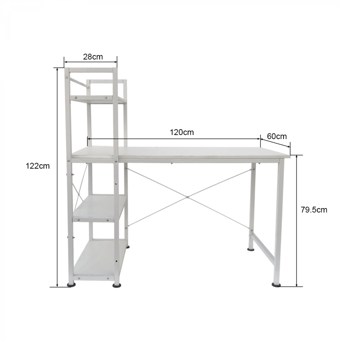 Een functioneel robuust en stabiel industrieel vintage bureau meubel met een wit metalen frame en wit houten tafelblad van 120 cm breed. Door het ontwerp van een metalen constructie van 122 cm hoog zijn er 3 extra opbergplanken van 28 cm breed en 60 cm diep beschikbaar voor het plaatsen van uw pc desktop uw printer ordners of andere items die u graag snel bij de hand wilt hebben. Perfect te gebruiken als computertafel bureau in uw kantoor studeerkamer woonkamer werkkamer of slaapkamer. De afmetingen van deze tafel zijn breed 120 cm x diep 60 cm x hoog 79 tot tafelblad en links tot hoogste beugel 122 cm. Levering inclusief montage instructie en benodigde materialen.