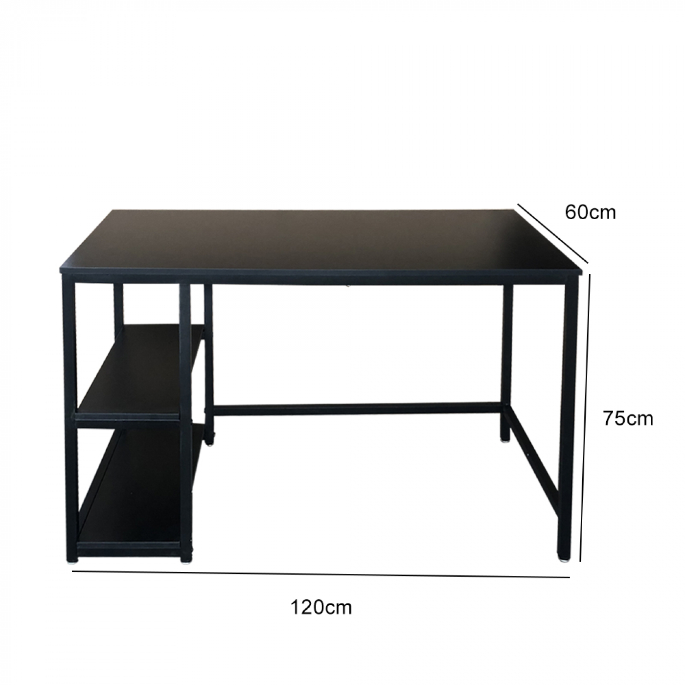 Een mooi stevig in industrieel look geproduceerd bureau computertafel met een zwart metalen frame met een zwart tafelblad en twee extra opbergplanken voot het plaatsen van uw computer printer uw ordners of andere items die u snel bij de hand wilt hebben. Dit werk buro of computer bureau is ontworpen voor elke ruimte in uw woning uw kantoor of werkkamer en zal een echte blikvanger zijn. Erg stevig en stabiel met een werkblad van breed 120 cm x diep 60 cm. Afmetingen totaal bureau is breed 120 cm x diep 60 cm x hoog 75 cm. Levering inclusief handleiding en benodigde montage materialen.