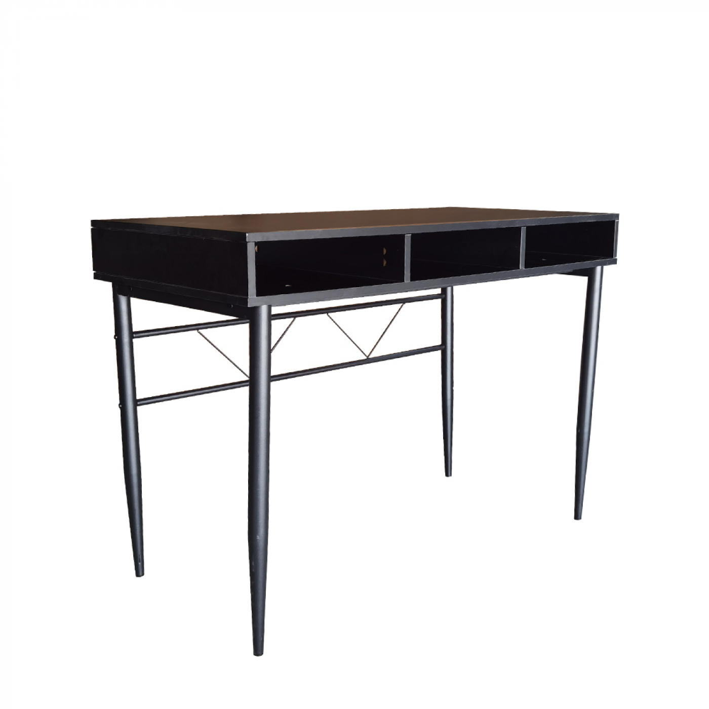 Een modern en strak zwart bureau gecombineerd met een industrieel vintage stijl. Dit buro heeft een zwart metalen frame en een wart tafelblad. In de open opbergvakken onder het werkblad van 10 cm hoog kunt u items opbergen die u snel bij de hand wilt hebben. De tafel is multifunctioneel te gebruiken naar eigen wens als laptoptafel computertafel bureau tekentafel of kantoortafel maar staat ook mooi als sidetable of dressoir in uw woonkamer slaapkamer studeerkamer of hal. Dit bureau is ontworpen voor elke ruimte in uw woning en is stevig en stabiel met een werkblad van breed 110 cm x diep 55 cm en de hoogte tot aan bovenkant van het tafelblad is 77 cm. Levering inclusief handleiding en benodigde montage materialen.