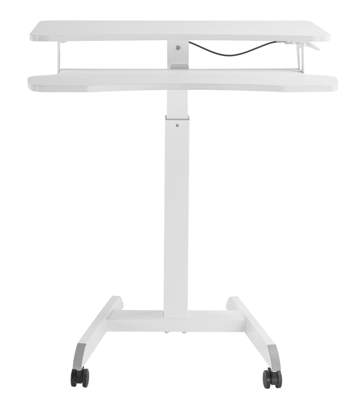 Met een druk op de gasveerhendel is dit verrijdbare zit sta bureau werkstation in hoogte verstelbaar van 80 cm tot 120 cm. U kunt naar wens kiezen voor zitten of staan tijdens het uitvoeren van uw werkzaamheden of tijdens een vergadering of het geven van een presentatie. Met een bureaublad van 80 cm breed en 40 cm diep en een toetsenbordlade van 79 cm breed en 30 cm diep biedt dit verrijdbare bureau voldoende ruimte. Door deze twee aparte lagen behoudt u altijd de juiste afstand en plaatsing van het toetsenbord en het scherm zowel zittend als staand voor een comfortabele werkplek. De combinatie van de enkele kolom en de vier zwenkwielen maakt dit verrijdbaar bureau draagbaar en mobiel om te gaan waar je maar wilt! Dit werkstation is eenvoudig te bedienen en een geweldige aanvulling voor gebruik tijdens presentaties vergaderingen video conferenties beurzen of andere werkzaamheden in uw kantoor of thuis in uw woonkamer werkkamer studeerkamer of iedere andere ruimte in uw woning. Afmetingen van dit mobiele zit sta bureau zijn breed 80 cm x diep 63 cm x hoog instelbaar van 80 cm tot 120 cm.