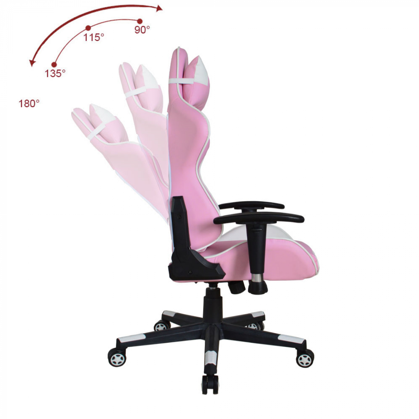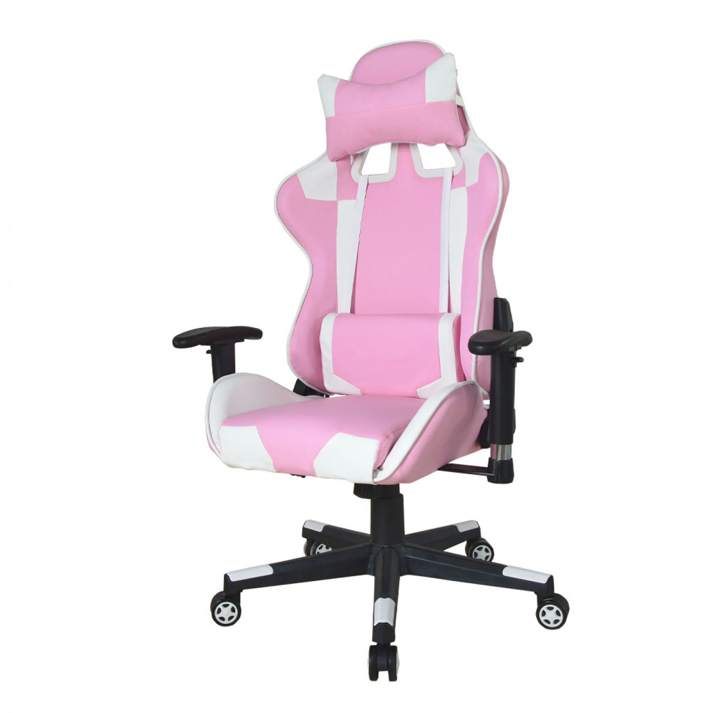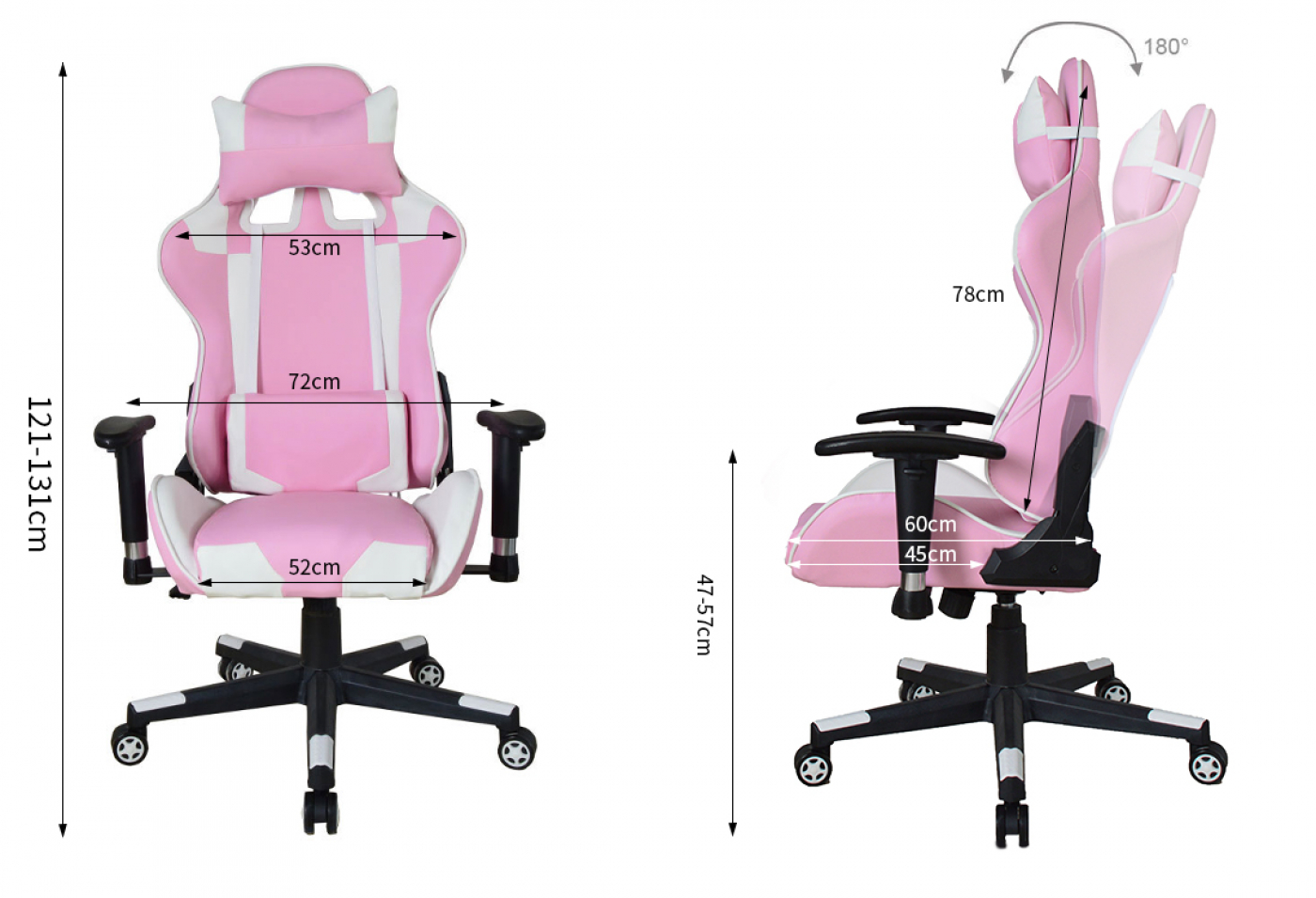 Een fijne en comfortabele ergonomisch gevormde roze met witte gaming racing bureaustoel met zeer veel mogelijkheden om de gamestoel aan te passen naar uw persoonlijke wensen. Een hoog en goed zitcomfort voor bij het gamen maar ook tijdens het werken, studeren of andere werkzaamheden. Het hoge zitcomfort wordt gegarandeerd door de dikke foam voering van de bekleding, Het brede kuipstoel zitvlak en rugleuning en lendesteunen met extra afneembaar hoofdkussen – nekkussen en een apart lendensteun kussen alles uitgevoerd in schuim met hoge en comfortabele dichtheid. Een verstelbare rugleuning die 180 graden naar achteren kan worden gekanteld voor een ontspannen rust moment tijdens het computerspel, het werken of studeren. Het comfort van deze roze gamestoel is uitgebreidt met een ergonomische gevormde kantelbare rugleuning ( op lichaamsgewicht ) ergonomische draaibare en in hoogte verstelbare 2D armsteunen. Tevens is deze bureaustoel in game en racing look in hoogte verstelbaar door middel van een kwalitatieve gaslift van 120 cm tot 130 cm = zithoogte van 48 cm tot 58 cm. Deze functionele en fijne stoel is 360 graden draaibaar en staat stabiel op een stevig stalen frame met vijf zwenkwielen. Of het nu harde of zachte ondergrond is deze stoel rijdt altijd makkelijk over het oppervlak. Kleur: roze met wit. Afmetingen stoel: hoog: 120 – 130 cm breed 72 cm diep: 60 cm. zithoogte: 48 – 58 cm. zitdiepte: 45 cm. zitbreedte 52 cm. Hoogte rugleuning 78 cm. Maximaal draagvermogen: 125 kg. Levering inclusief montage handleiding en benodigde montage materialen.