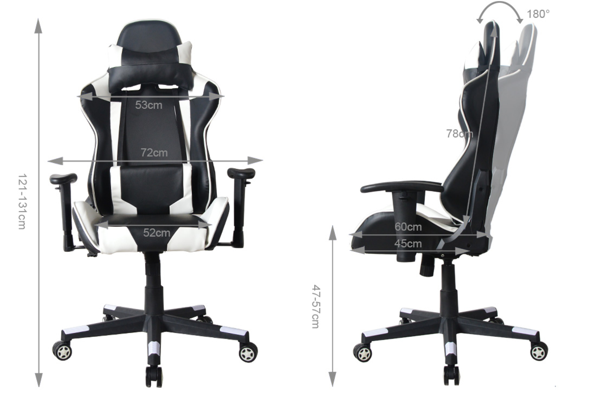Deze mooie comfortable ergonomisch gevormde gaming racing chair bureau stoel heeft zeer veel mogelijkheden om de bureaustoel aan te passen naar uw persoonlijke wensen. Een hoog en comfortabel zitcomfort voor bij het gamen maar ook tijdens het werken, studeren of andere werkzaamheden. Het hoge zitcomfort wordt gegarandeerd door de dikke foam voering van de bekleding, het brede kuipstoel zitvlak en rugleuning en lendesteunen met extra afneembaar hoofdkussen – nekkussen en een apart lendensteun kussen. Het comfort van deze racing gaming stoel is uitgebreidt met een ergonomische gevormde kantelbare rugleuning ( op lichaamsgewicht ) ergonomische draaibare en in hoogte verstelbare armsteunen. Een verstelbare rugleuning die 180 graden naar achteren kan worden gekanteld voor een ontspannen rust moment tijdens het computerspel, het werken of studeren. Tevens is deze bureaustoel in game en racing look in hoogte verstelbaar van 120 cm tot 130 cm = zithoogte van 48 cm tot 58 cm. Deze bureaustoel is 360 graden draaibaar en staat stabiel op een stevig stalen frame met vijf zwenkwielen. Of het nu harde of zachte ondergrond is deze stoel rijdt altijd makkelijk over het oppervlak. Kleur: zwart – wit. Afmetingen stoel: hoog: 120 – 130 cm breed 72 cm diep: 68 cm. zithoogte: 48 – 58 cm. zitdiepte: 60 cm. zitbreedte 52 cm. Hoogte rugleuning 78 cm. Maximaal draagvermogen: 120 kg. Levering inclusief montage handleiding en benodigde montage materialen.