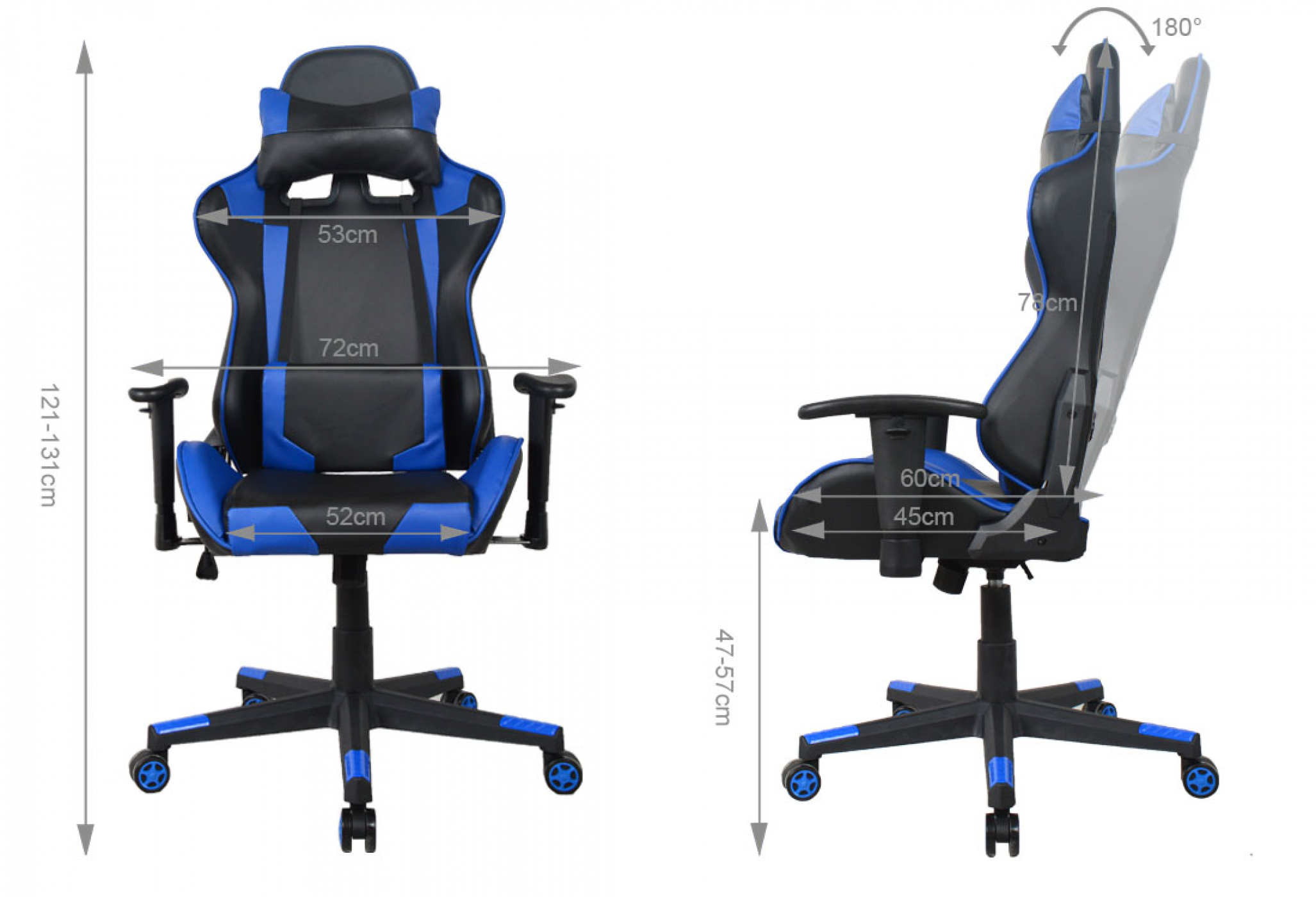 Deze mooie ergonomisch gevormde zwart blauwe gaming racing chair bureau stoel heeft zeer veel mogelijkheden om de bureaustoel aan te passen naar uw persoonlijke wensen. Een hoog en comfortabel zitcomfort voor bij het gamen maar ook tijdens het werken, studeren of andere werkzaamheden. Het hoge zitcomfort wordt gegarandeerd door de dikke foam voering van de bekleding, het brede kuipstoel zitvlak en rugleuning en lendesteunen met extra afneembaar hoofdkussen – nekkussen en een apart lendensteun kussen. Het comfort van deze racing gaming stoel is uitgebreidt met een ergonomische gevormde kantelbare rugleuning ( op lichaamsgewicht ) ergonomische draaibare en in hoogte verstelbare armsteunen. Een verstelbare rugleuning die 180 graden naar achteren kan worden gekanteld voor een ontspannen rust moment tijdens het computerspel, het werken of studeren. Tevens is deze bureaustoel in game en racing look in hoogte verstelbaar van 120 cm tot 130 cm = zithoogte van 48 cm tot 58 cm. Deze bureaustoel is 360 graden draaibaar en staat stabiel op een stevig stalen frame met vijf zwenkwielen. Of het nu harde of zachte ondergrond is deze stoel rijdt altijd makkelijk over het oppervlak. Kleur: zwart – blauw. Afmetingen stoel: hoog: 120 – 130 cm breed 72 cm diep: 68 cm. zithoogte: 48 – 58 cm. zitdiepte: 60 cm. zitbreedte 52 cm. Hoogte rugleuning 78 cm. Maximaal draagvermogen: 120 kg. Levering inclusief montage handleiding en benodigde montage materialen.