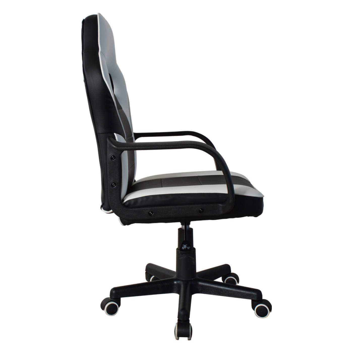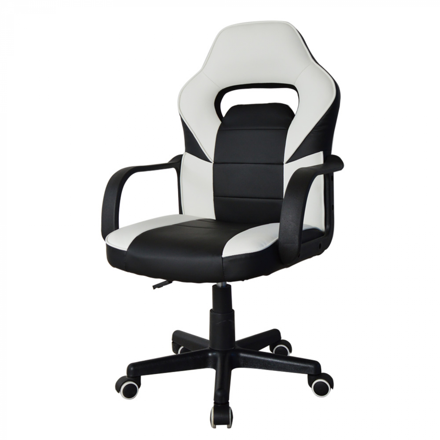 Een goed gevormde functionele zwart witte bureaustoel met comfortabele kunstlederen bekleding in gaming racing stijl met een fijn zitcomfort aan uw bureau of tafel bij het gamen maar ook tijdens het werken studeren of andere werkzaamheden. Het zitcomfort wordt gegarandeerd door de stevige onderhoudsvriendelijke PU leer voering van de bekleding, de gevormde hoofsteun, het stevige zitvlak, de rugleuning van 64 cm hoog en de zitting van 47 cm breed en 45 cm diep. De racing gaming bureaustoel junior is uitgebreidt met een in hoogte verstelbare zitting van 102 cm tot 112 cm = zithoogte van 43 cm tot 53 cm en een ergonomische armsteun. Deze bureaustoel in gaming look is 360 graden draaibaar en staat stabiel op een stevig kunststof frame met vijf zwenkwielen. Of het nu harde of zachte ondergrond is deze stoel rijdt altijd makkelijk over het oppervlak. Kleur: zwart wit. Afmetingen stoel: hoog: 102 – 112 cm breed 57 cm en diep 45 cm. zithoogte: 43 – 53 cm. zitdiepte: 45 cm. zitbreedte 47 cm. Hoogte rugleuning 64 cm. Maximaal draagvermogen: 90 kg. Levering inclusief montage handleiding en benodigde montage materialen.
