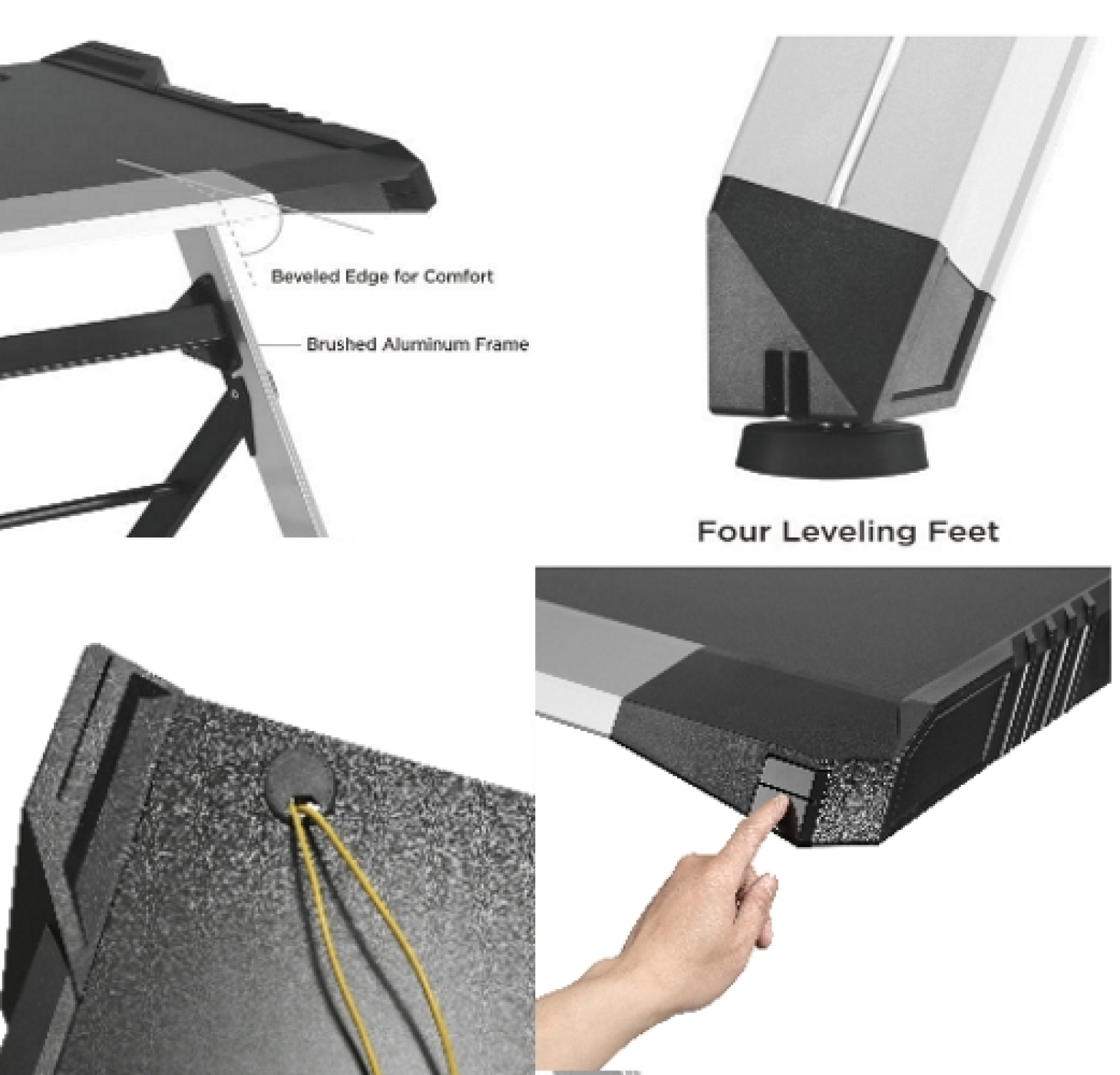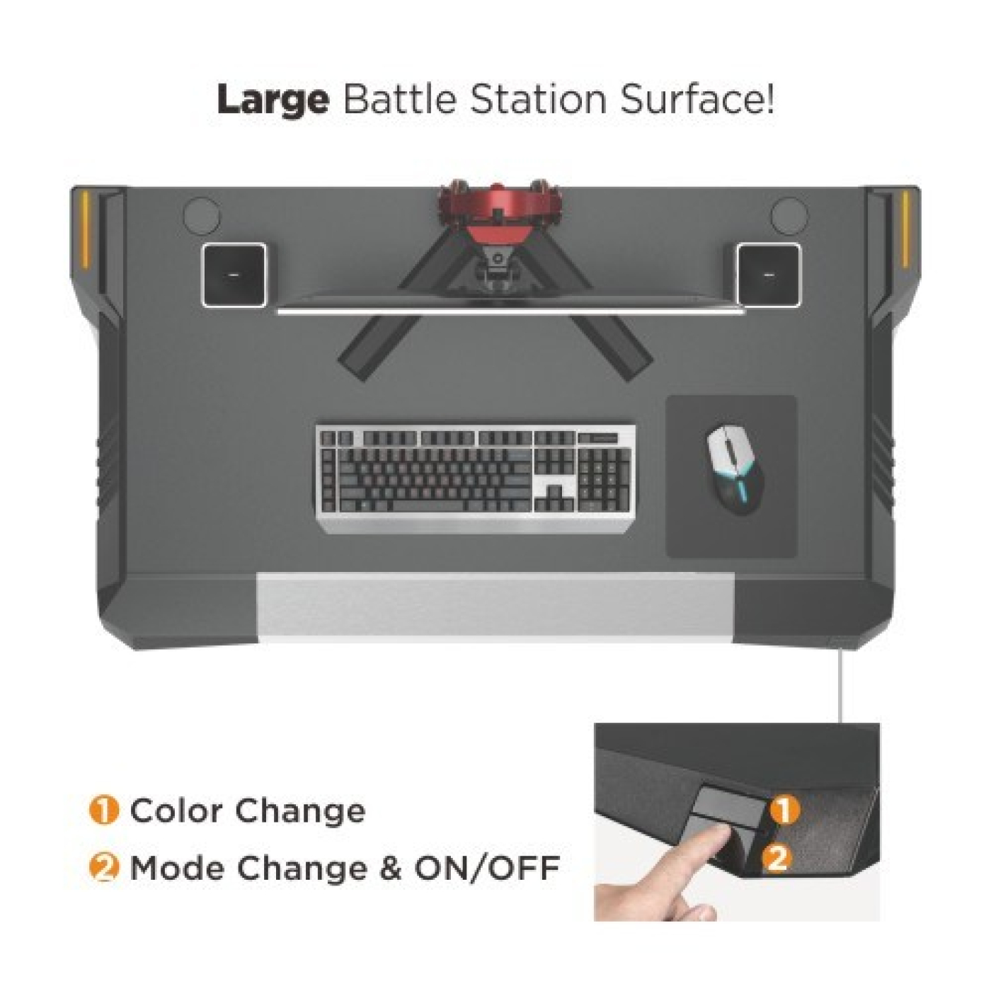 Een blikvanger met een moderne en futuristische uitstraling is dit computer game bureau van 130 cm breed en maar liefst 72 cm diep met RGB led verlichting voor in uw game kamer slaapkamer speelkamer of iedere andere ruimte in uw woning. Bent u op zoek naar een goed ontworpen en kwalitatief stevig en mooi gaming computer bureau met een hoogwaardig comfort voor urenlang game plezier ? Deze computer game tafel heeft een stevig aluminium frame en een hoogwaardig bureaublad van 25 mm dik meubelpaneel met een melamine toplaag. De RGB multi kleuren led verlichting die is verwerkt in de poten van het bureau geven een extre sfeer aan het bureau en de gamekamer of game ruimte. De afgeronde voorkant zorgt voor een optimaal ergonomisch comfort. Het kabelbeheersysteem zorgt ervoor dat je de kabels mooi en veilig weg kunt werken en organiseren en je bureau een mooie en nette look blijft houden. De vier verstelbare voetjes zorgen voor extra stabiliteit op elke ondergrond. Het bureau heeft meer dan voldoende ruimte om twee beeldschermen te plaatsen en al uw andere game accessoires zodat u deze bij de hand heeft. Maximaal draaggewicht van dit gaming bureau is 50 kg. Formaat van dit bureau is 130 cm breed, 72 cm diep en 78 cm hoog met een werkblad van 120 cm breed en 60 cm diep.Kleur zilver grijs aluminium frame met zwart bureaublad. Levering inclusief montage instructie en benodigde onderdelen.