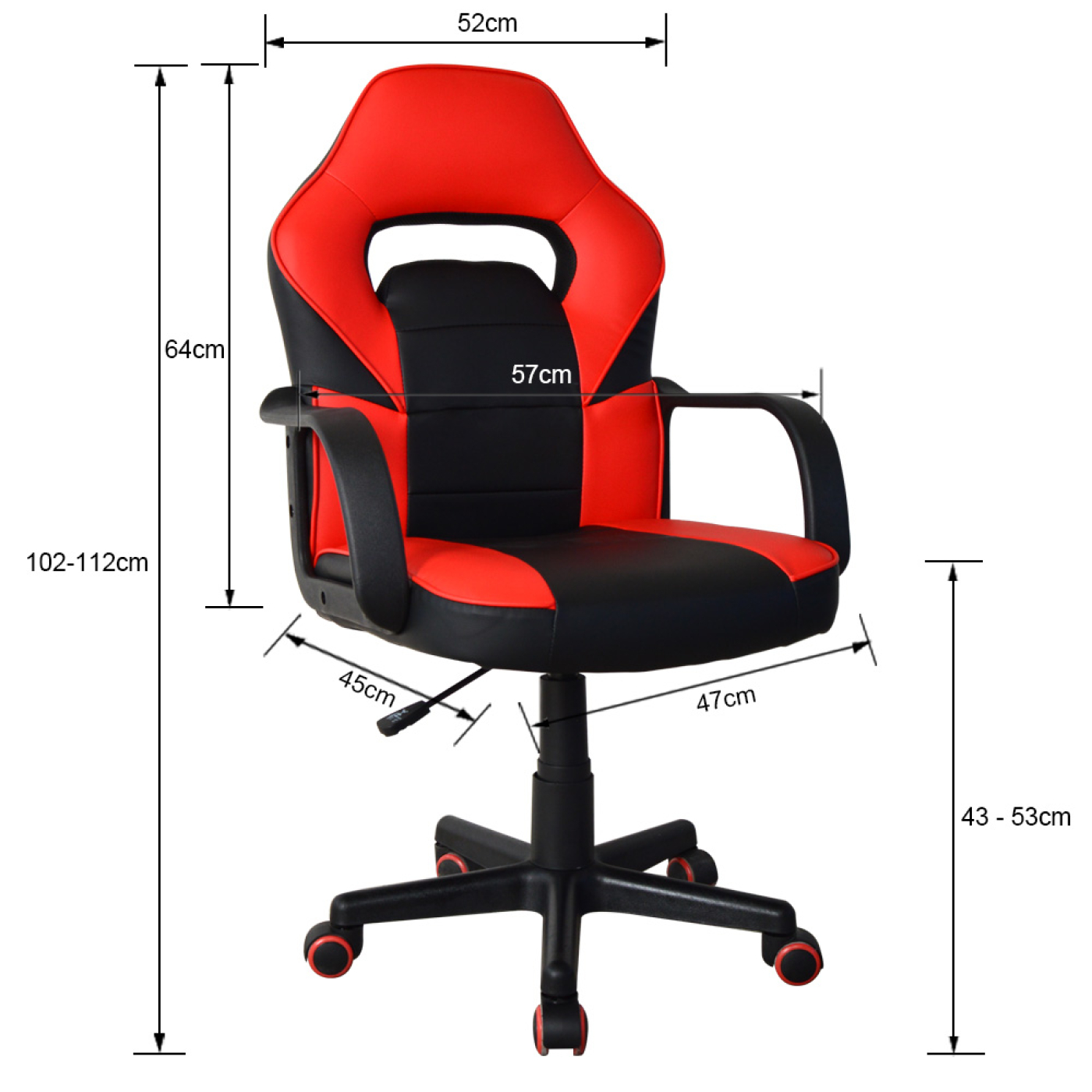 Een mooie goed gevormde functionele rood zwarte bureaustoel met comfortabele kunstlederen bekleding in gaming racing stijl met een fijn zitcomfort aan uw bureau of tafel tijdens het gamen maar ook bij het werken studeren of andere werkzaamheden. Het zitcomfort wordt gegarandeerd door de stevige onderhoudsvriendelijke PU leer voering van de bekleding, de gevormde hoofsteun, het stevige zitvlak, de rugleuning van 64 cm hoog en de zitting van 47 cm breed en 45 cm diep. De racing gaming bureaustoel junior is uitgebreidt met een in hoogte verstelbare zitting van 102 cm tot 112 cm = zithoogte van 43 cm tot 53 cm en een ergonomische armsteun. Deze bureaustoel in gaming look is 360 graden draaibaar en staat stabiel op een stevig kunststof frame met vijf zwenkwielen. Of het nu harde of zachte ondergrond is deze stoel rijdt altijd makkelijk over het oppervlak. Kleur: zwart rood. Afmetingen stoel: hoog: 102 – 112 cm breed 57 cm en diep 45 cm. zithoogte: 43 – 53 cm. zitdiepte: 45 cm. zitbreedte 47 cm. Hoogte rugleuning 64 cm. Maximaal draagvermogen: 90 kg. Levering inclusief montage handleiding en benodigde montage materialen.