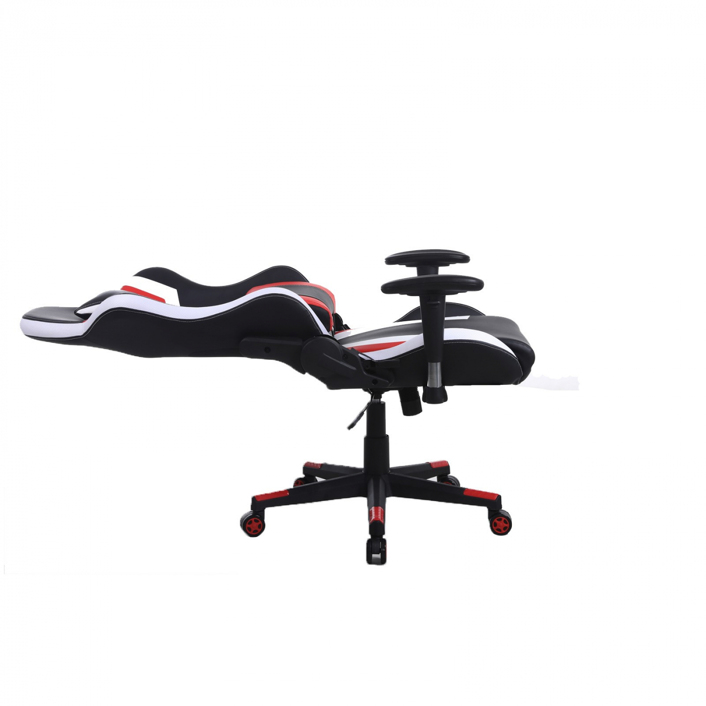 Deze stoere gaming bureau stoel Tornado in zwart met rood witte kleur accenten straalt spanning en sensatie uit. Hij nodigt je uit. Hij daagt je uit om plaats te nemen in deze voorgevormde gaming bureaustoel. Of je nu op een laptop, computer beeldscherm of in een volledig ingerichte game cockpit gaat gamen, de Tornado game stoel is er klaar voor. De zitting biedt een optimaal comfort door de katoenvulling. De rugleuning biedt door de flanken extra steun tijdens intensieve game sessies. Daardoor is de houding die je aanneemt in deze gaming stoel beter voor je rug. Door de extra losse kussentjes voor de onderrug en nek wordt je rug op de juiste punten ondersteunt om klachten te voorkomen. Samen met de in hoogte en zijwaarts verstelbare elleboogsteunen kun je de stoel helemaal naar eigen wens instellen. Zo heb je nergens last van tijdens èn na een stevige sessie gamen. De Tornado stoel heeft een stalen frame is opgevuld met katoenvulling en bekleedt met zwart PU. Dit unieke design is een samenstelling van zwart met contrast verhogende kleuraccenten. De voorzijde van de zijflanken aan de rugleuning en zitting zijn afgewerkt met mesh. Dit geeft de gaming stoel een sportief uiterlijk. Een hoog zitcomfort door de dikke katoenvulling zorgt voor een goede ondersteuning. Een verstelbare rugleuning die van 90 naar 180 graden naar achteren kan worden bewogen voor ontspanning na een intensieve game sessie of tijdens een relax momentje tijdens je werk of studie. De zitting is in hoogte verstelbaar van 48 cm tot 58 cm door een kwalitatieve gasveer klasse 4. De Tornado staat op een sterk frame met vijf zwenkwielen en is 360 graden draaibaar. Kleur: zwart – rood. Afmetingen stoel: hoog verstelbaar 124 – 132 cm, breed 69 cm incl. armsteunen, zitting breedte 56 cm, zitbreedte 40 – 35 cm en zitdiepte 55 cm. De hoogte van de rugleuning is 81 cm. Maximaal draagvermogen: 135 kg. Levering inclusief montage handleiding en benodigde montage materialen.