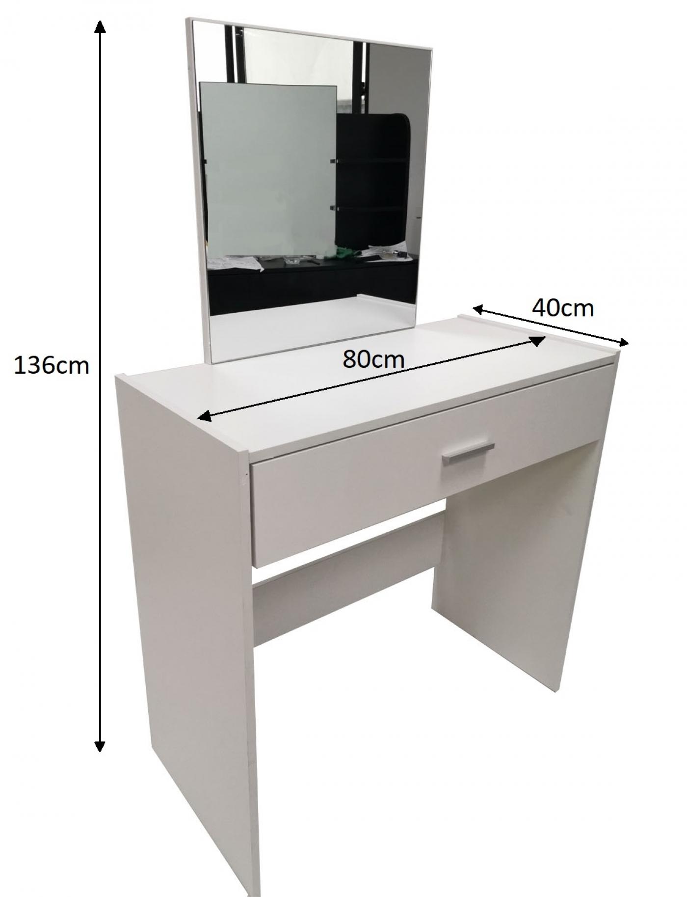 Deze strakke rechthoekige praktische opmaaktafel kaptafel in de kleur wit met opmaakspiegel en opberglade past in elk interieur is een mooie aanvulling op uw inrichting en is uitermate geschikt voor bijvoorbeeld op uw slaapkamer of in uw hal. De lade biedt voldoende ruimte voor uw make up cosmetica, huidverzorging en haarproducten in op te bergen. Ook zou u ervoor kunnen kiezen om de lade te gebruiken als opbergruimte voor uw sierraden of andere items. LET OP!! Levering is EXCLUSIEF bankje. Afmetingen: Hoog 136 cm x breed 80 cm x diep 40 cm. Levering inclusief montage instructie en benodigde onderdelen. Ook te verkijgen in de kleur zwart en sonoma oak.