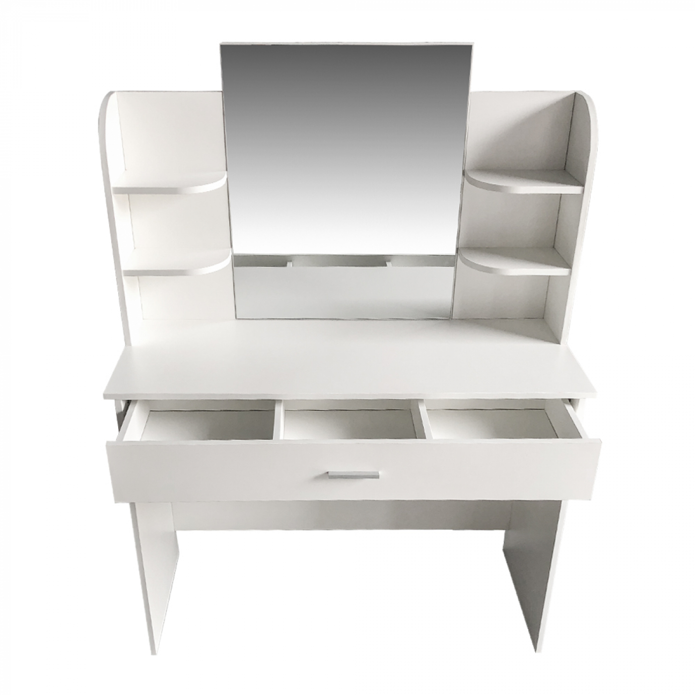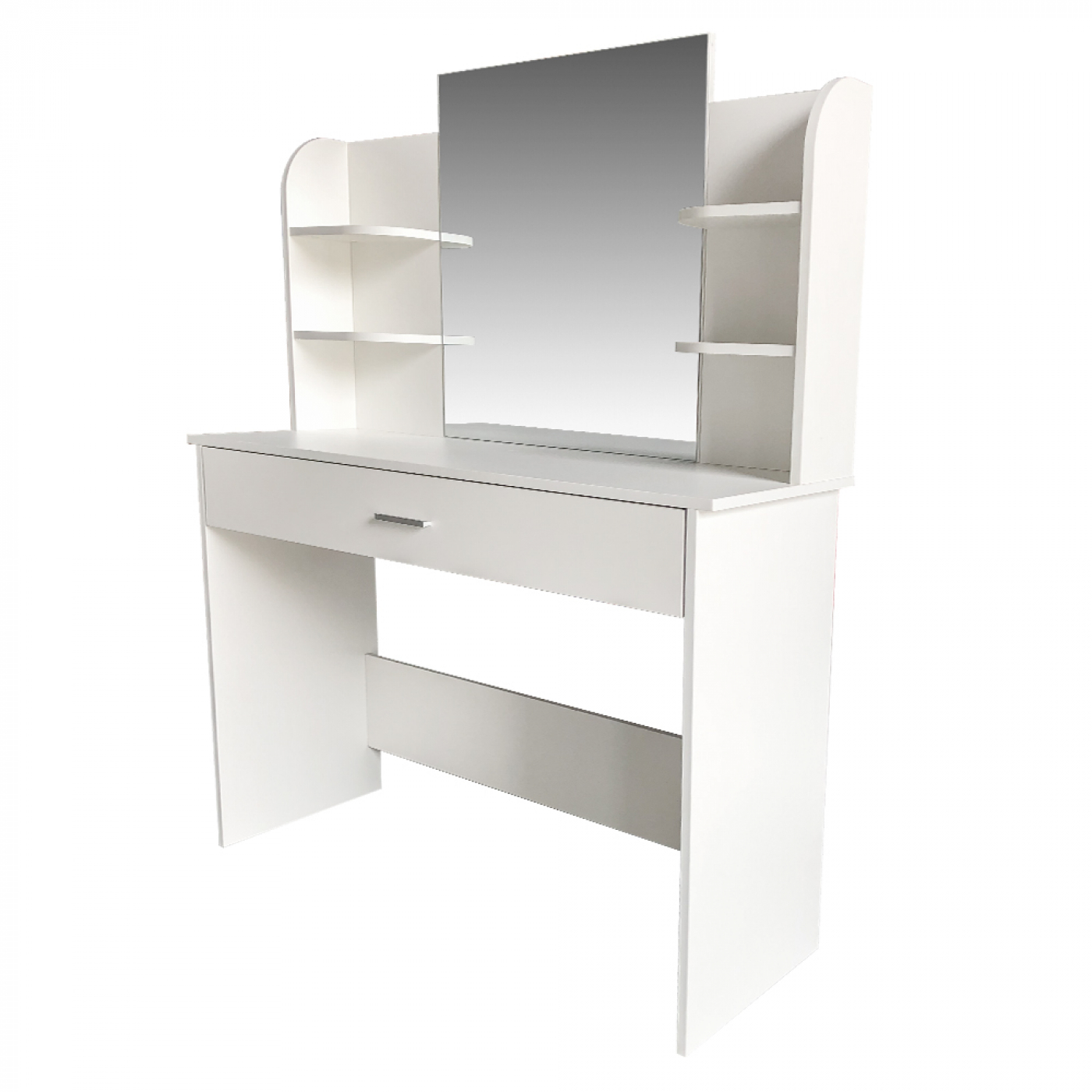 Optimaal gebruiksgemak en functionaliteit gecombineerd met voldoende werkruimte op het tafelblad. Veel opbergruimte voor uw make up cosmetica produkten en accessoires uw huidverzorging en haarproducten en sieraden in de grote lade met vakindeling en aan beide zijde van de spiegel op de opbergplankjes. Deze witte kaptafel opmaaktafel met een grote spiegel is een mooie stijlvolle en prachtige aanvulling voor de slaapkamer kinderkamer of uw hal. Afmetingen van de toilettafel kaptafel hoog 142 cm x breed 108 cm x diep 40 cm. Levering inclusief montage instructie en benodigde onderdelen. Ook te verkrijgen in andere kleuren.