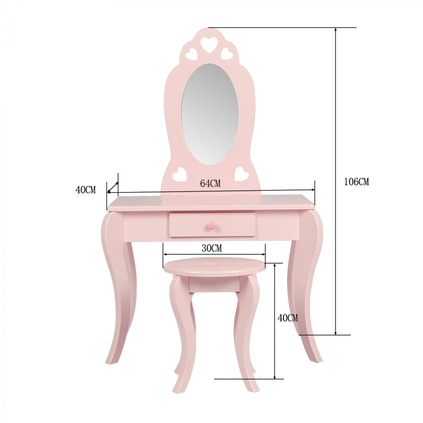 Een mooie en elegante make up opmaaktafel kaptafel hartjes in de kleur roze met een klassieke brocante uitstraling gecombineerd met een strakke afwerking en daardoor geschikt voor elke meisje slaapkamer of andere ruimte in uw huis. Deze roze hartjes kaptafel is een gegarandeerd succes bij uw kleine prinses en kan voor verschillende doeleinden worden gebruikt o.a. voor het spelen als kapsalon, visagiste of nagelstyliste maar ook natuurlijk ook geschikt om aan te knutselen of als bureau. Dit roze tafeltje met spiegels heeft een kleine lade om de make-up, accessoires en sieraden in op te bergen. Het stevige houten bijpassende kruk maakt deze tafel compleet. LET OP: Afmetingen make-up tafel hoogte 106 cm x. breedte 64 cm x diep 40 cm. afmeting krukje hoogte 40 cm x breed 30 cm. Geleverd inclusief montagehandleiding en benodigde montagematerialen.
