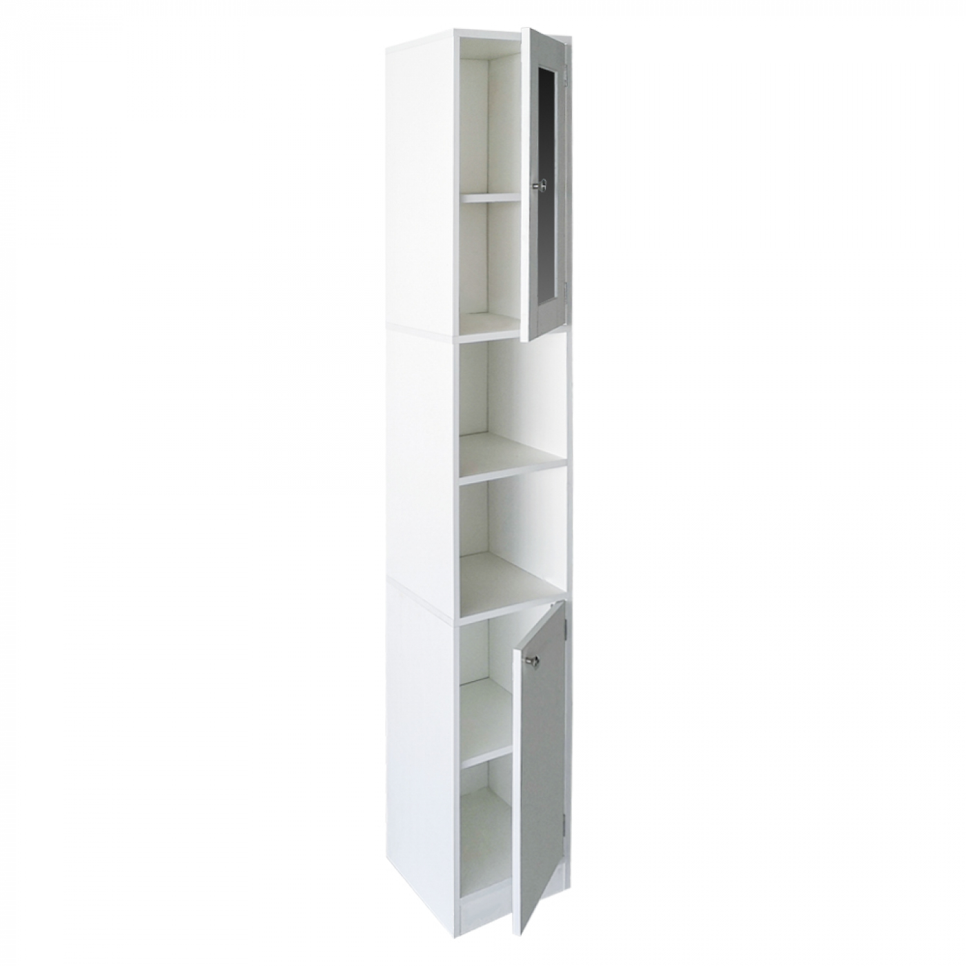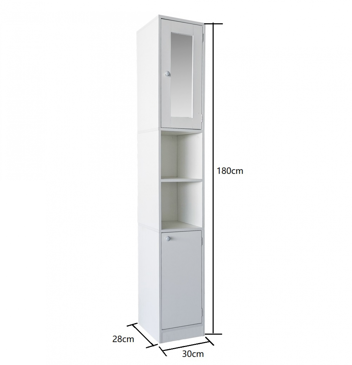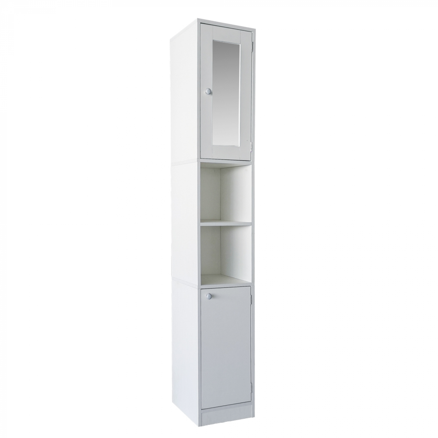 Deze witte universele kast voor op de badkamer in de hal of gang met een witte ombouw en witte deuren is geschikt voor elke badkamer of andere ruimte in uw woning. Deze kolomkast badkamerkast heeft onder en boven twee deuren met daarachter opbergruimte met een legplank voor items die u niet in het zicht wilt hebben liggen. Om deze kast praktisch te maken heeft het bovenste deurtje ook nog een spiegel. In het midden zijn 2 open opbergvakken voor het opbergen van handdoeken badkamer accessoires of andere items. Dit badkamer meubel is ruimtebesparend en biedt ook nog eens voldoende opbergmogelijkheden zodat uw badkamer ordelijk blijft. Kleur: wit met witte deuren. Afmetingen: hoog 180 cm breed 30 cm diep 28 cm. Levering is inclusief handleiding en benodigde montagematerialen.