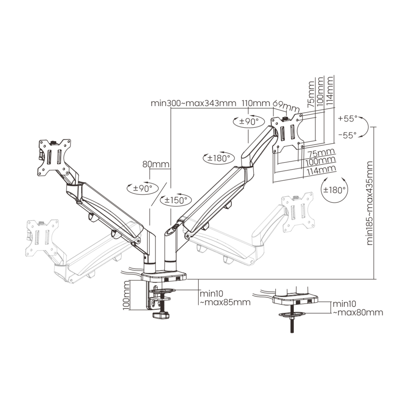 Mooi van uiterlijk en robuust in prestaties dat is deze monitorbeugel met gasveermechanisme voor montage van 2 beeldscherm monitoren. Met een ingebouwde USB 3.0 poort en type C poort op de monitorarm is gegevensoverdracht en opladen nog nooit zo makkelijk geweest! Met één vinger zorgt het hoogwaardige gasveermechanisme met ingebouwde veerspanningsmeter voor eenvoudige monitorarm bewegingen inclusief omhoog – omlaag – verlengen en intrekken om de absoluut beste ergonomische positie te bereiken. De handige VESA-plaat met sleutelgatsleuven zorgt voor snelle montage of verwijdering. Bureauklem en door-gat grommet mounts zijn inbegrepen. De solide scharnierende monitorarm is 55 graden omhoog kantelbaar en 55 graden naar beneden, 90 graden draaibaar en 360 graden roteerbaar. Het beeldscherm is zowel horizontaal als verticaal te gebruiken. Het kabelbeheer verbergt elegant alle kabels die aan het beeldscherm zijn bevestigd. Een draaibare arm bied maximale kijkflexibiliteit en door de vrij in hoogte verstelbare mogelijkheden heeft u een optimale ergonomische positie achter het beeldscherm. Geschikt voor beeldschermen van 17 inch tot 32 inch. Vesa compatible met 75 x 75 en 100 x 100. Maximaal gewicht per beeldscherm is 9 kg.