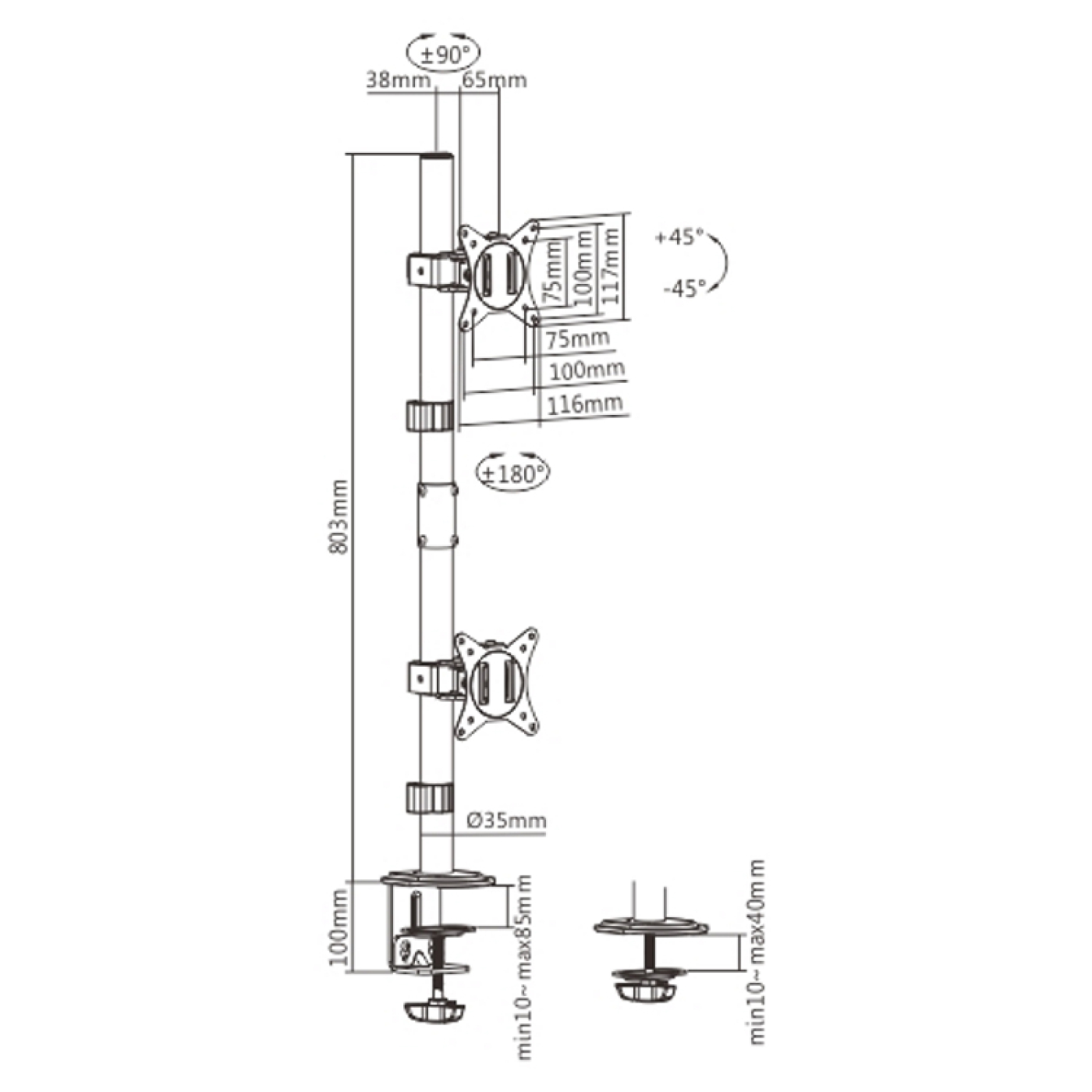 Een monitorbeugel voor montage van 2 beeldschermen boven elkaar. De duurzame staalstructuur biedt deze monitorarm stabiele ondersteuning voor twee beeldschermen van 17 inch tot maximaal 32 inch met een maximaal gewicht van 9 kilo per scherm.. Flexibel ontwerp voor ruime aanpassing en kijkhoeken. Grommet- en klemmontage opties inbegrepen voor installatie op vrijwel elk werkoppervlak. Een afneembare VESA-plaat voor gebruiksvriendelijke installatie. Kabelclips meegeleverd voor een georganiseerde en opgeruimde werkplek. De solide scharnierende monitorarm met 45 graden kanteling 90 graden draaibaar en 180 graden rotatie helpt een ongeëvenaarde ergonomische ervaring en productiviteit te creëren. Het beeldscherm is zowel horizontaal als verticaal te gebruiken. Doordat de beeldschermen vrij in hoogte verstelbaar zijn op de 80 cm hoge paal heeft u altijd een optimale ergonomische positie achter het beeldscherm. Vesa compatible met 75 x 75 en 100 x 100.