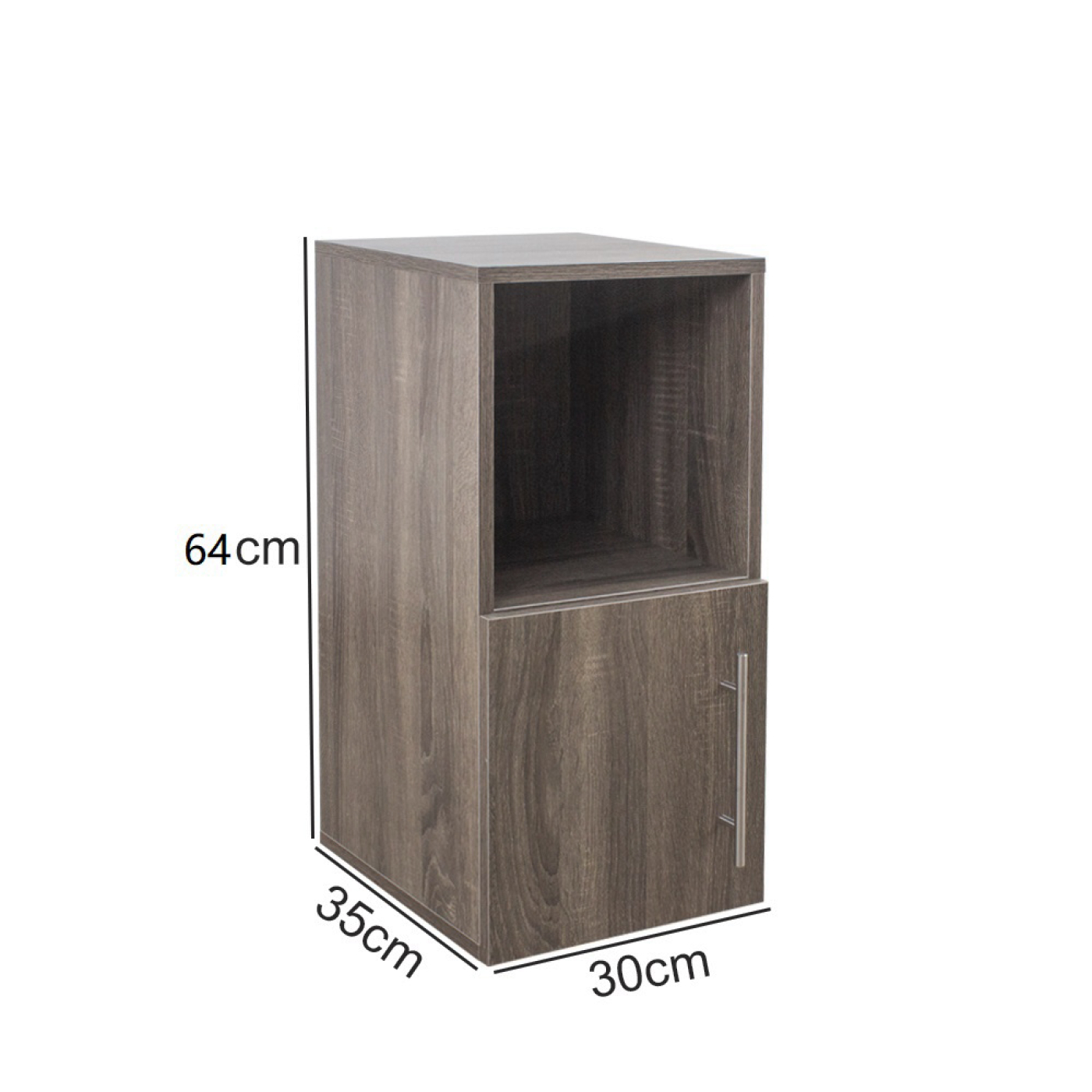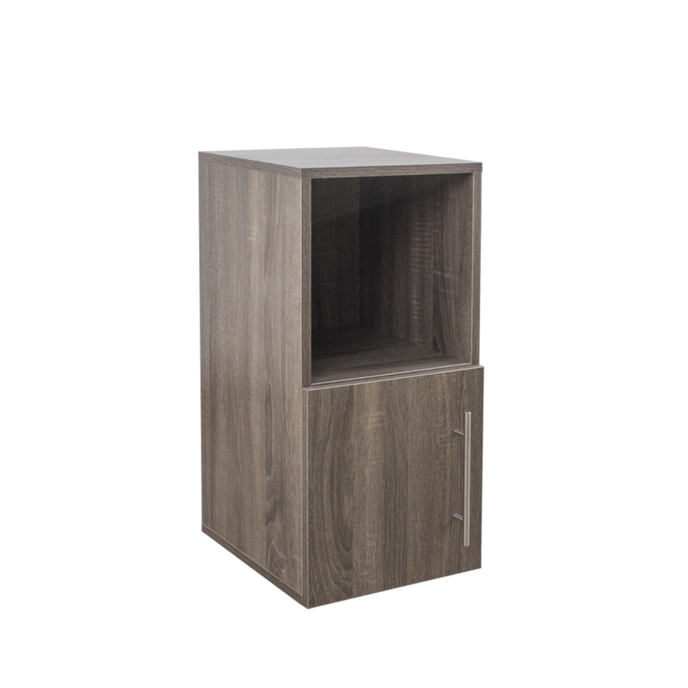 Dit moderne, grijze nachtkastje/bijzetkastje combineert een eenvoudige vormgeving met slimme opbergruimte. Het open vak bovenin houdt dagelijkse items binnen handbereik, terwijl de opbergruimte achter de deur onderin losse spullen netjes uit het zicht bewaart. Perfect naast het bed, maar ook ideaal in hal, woonkamer, badkamer of werkkamer.