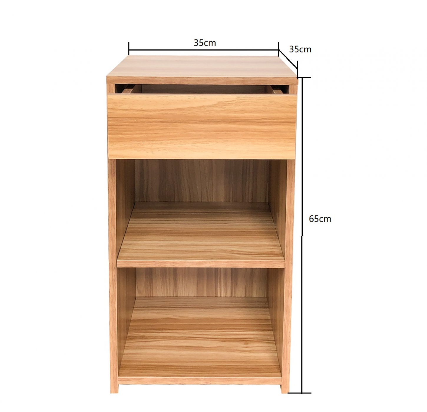 Een strakke en moderne vormgeving in een simpele maar functionele uitvoering, dit in voordelige budget kwaliteit geproduceerde bruin kleurige nachtkastje bijzetkastje heeft het. Dit kastje van 65 cm hoog heeft voldoende mogelijkheden om uw items op te bergen in de 2 open vakken en de lade en alles wat u snel bij de hand wilt hebben kunt u plaatsen op het bovenste tafelblad met de afmeting van 35 cm bij 35 cm. Het kastje kun je natuurlijk niet alleen in de slaapkamer gebruiken als nachtkastje maar is natuurlijk ook geschikt voor in de woonkamer, hal of werkkamer. Afmetingen: 35 cm breed 35 cm diep en 65 cm hoog. Het kastje kan snel en eenvoudig worden gemonteerd met behulp van de meegeleverde montagehandleiding en bevestigingsmateriaal.