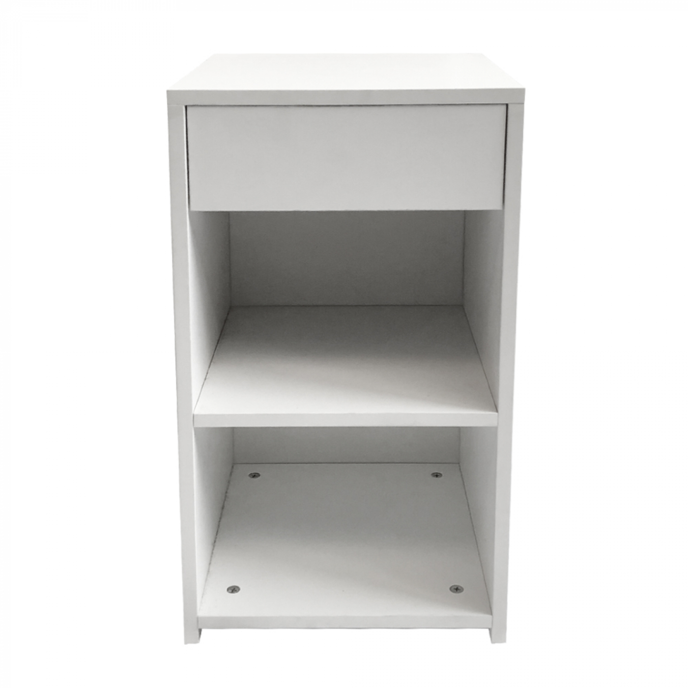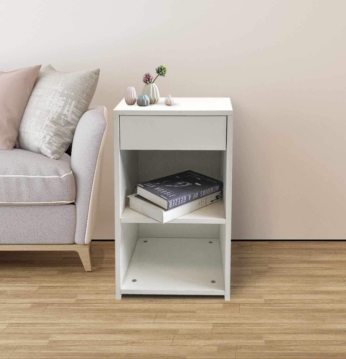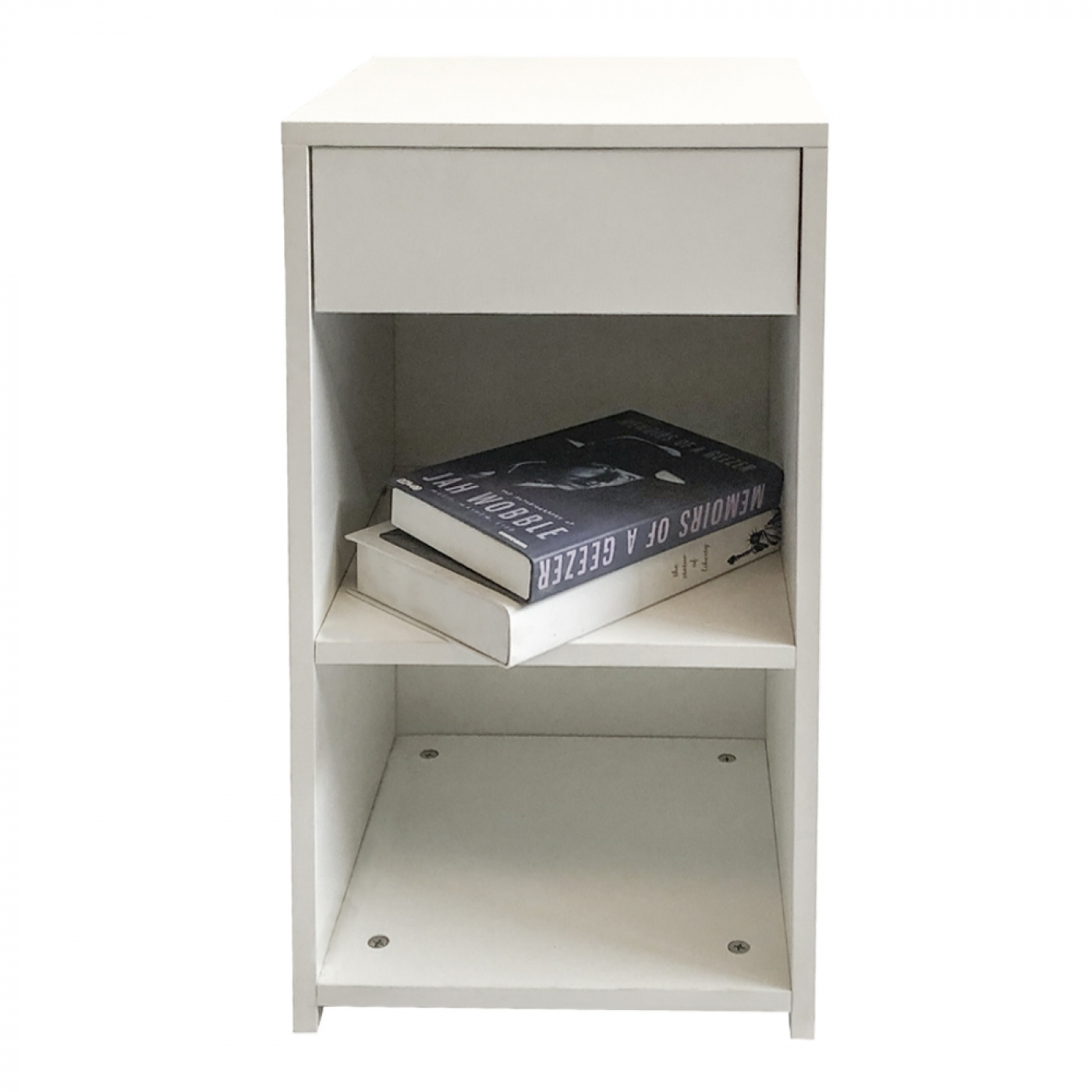 Dit moderne, witte nachtkastje/bijzetkastje biedt een eenvoudige maar doeltreffende indeling. Met twee open vakken en één lade houdt u essentials netjes geordend, terwijl het bovenblad van 35 × 35 cm ruimte biedt voor wat u snel bij de hand wilt hebben. Geschikt voor slaapkamer, woonkamer, hal of werkkamer.