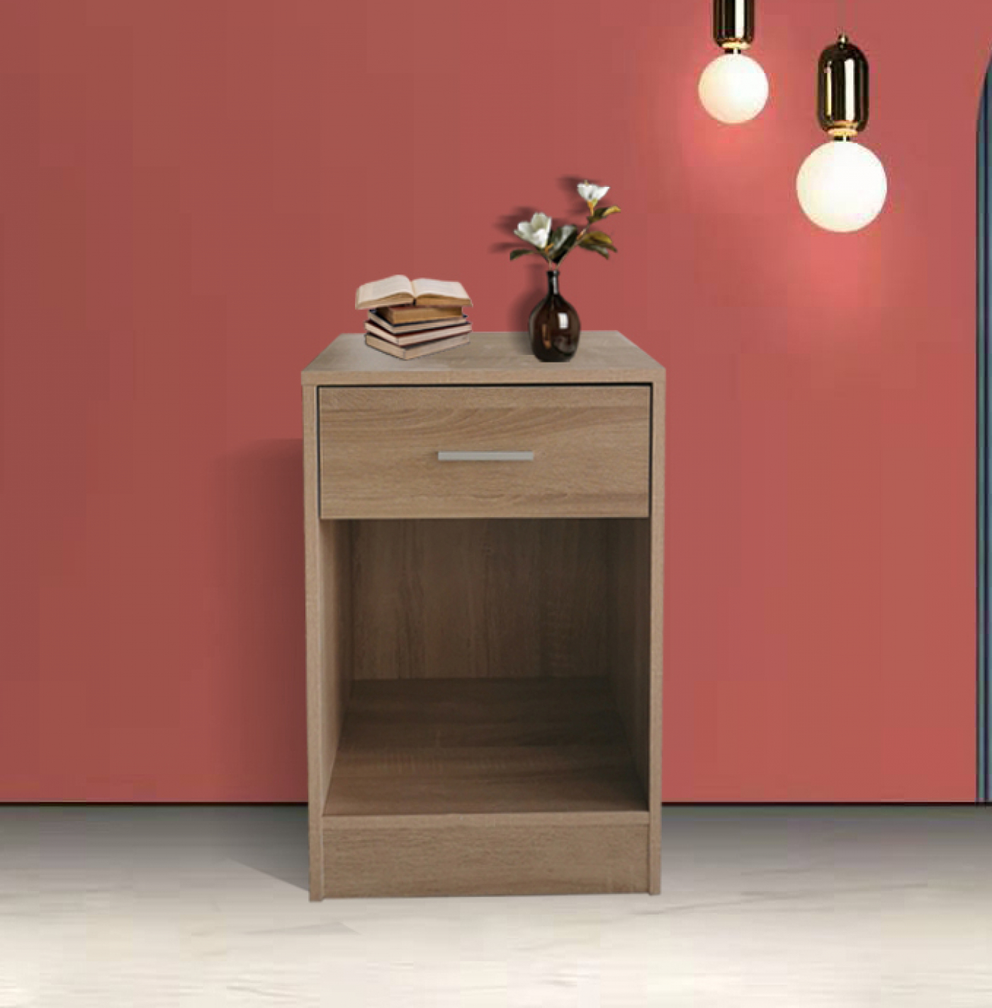 Dit lichtbruine nachtkastje/bijzetkastje koppelt een eenvoudige uitvoering aan slimme opbergruimte. Bovenin is een opberglade voor kleinere items; daaronder een groot open vak voor boeken, mandjes of accessoires. Het bovenblad van 40 × 38 cm biedt plek voor alles wat u snel bij de hand wilt. Geschikt als nachtkastje in de slaapkamer, maar ook ideaal in woonkamer, hal of werkkamer.