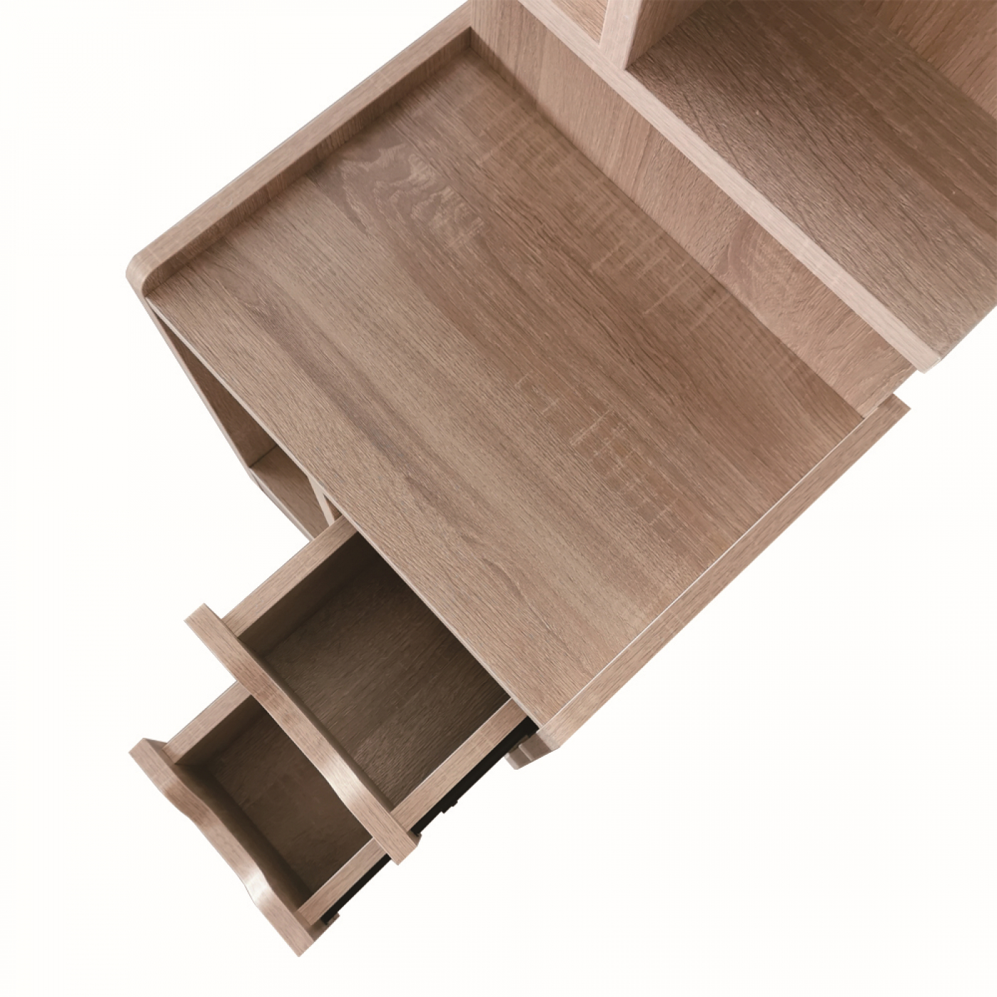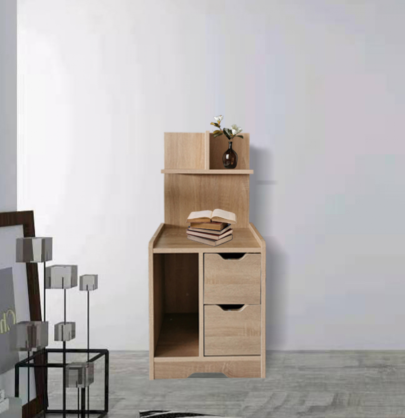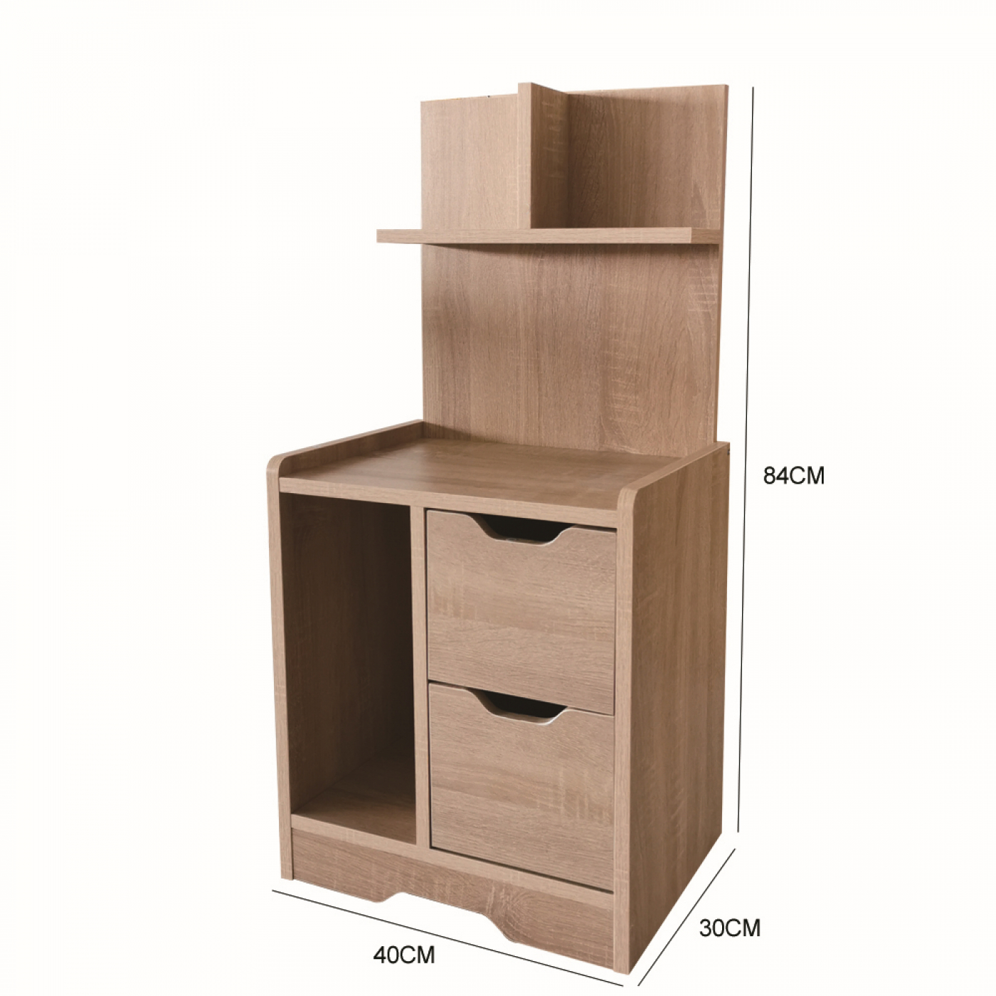 Een simpele maar functioneel lichtbruin budget nachtkastje wandkastje voor op de kinderkamer met 2 opberglades bakken zonder ladegeleiders met 1 smalle open opbergruimte en een achterwand met 2 open opbergvakken. Dit kastje heeft voldoende mogelijkheden om uw items op te bergen en alles wat u snel bij de hand wilt hebben kunt u plaatsen op het bovenste tafelblad of op de opbergplank. Het kastje kun je natuurlijk niet alleen in de slaapkamer of kinderkamer gebruiken als nachtkastje maar is natuurlijk ook geschikt als wandkastje in de woonkamer hal of werkkamer. Let op. Afmetingen: 40 cm breed 30 cm diep en 84 cm hoog. Het kastje kan snel en eenvoudig worden gemonteerd met behulp van de meegeleverde montage handleiding en bevestigingsmateriaal.
