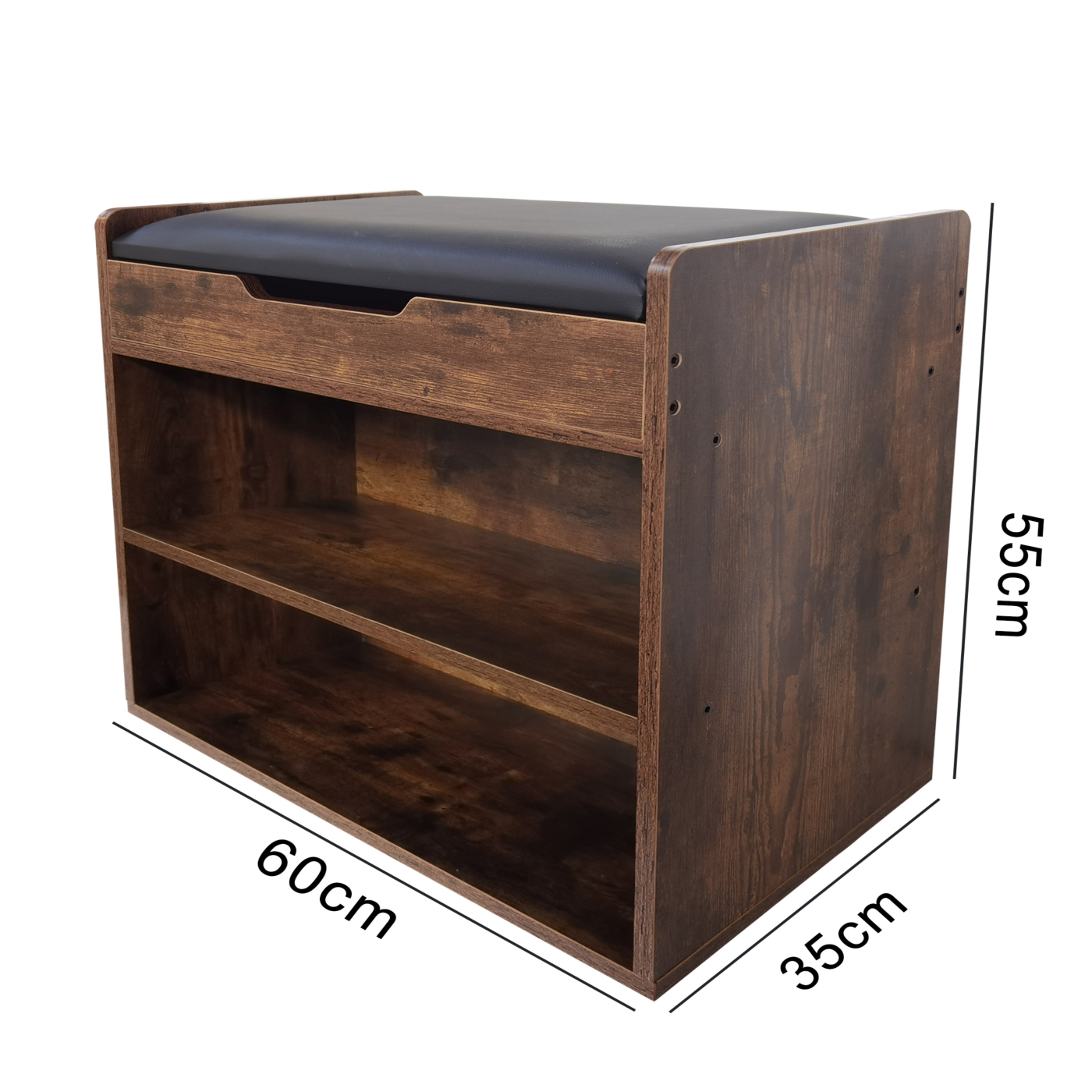 Een oplossing voor uw schoenen op te bergen dat is deze donkerbruin kleurige schoenen opbergkast met 2 open vakken en een comfortabel zwart zitkussen zodat u het ook als zitbankje kunt gebruiken. Het zitkussen is opklapbaar met daaronder nog een extra opbergvak. Bij uitstek geschikt voor het plaatsen in uw hal gang kinderkamer slaapkamer bijkeuken garage of ontvangstruimte. Natuurlijk kunt u dit open vakkenkastje of bankje ook gebruiken voor het opbergen van vele andere items of als extra zitplaats in de kinderkamer slaapkamer keuken of woonkamer. Afmetingen: 60 cm breed 35 cm diep en 55 cm hoog. Het kastje kan snel en eenvoudig worden gemonteerd met behulp van de meegeleverde montage handleiding en bevestigingsmateriaal.