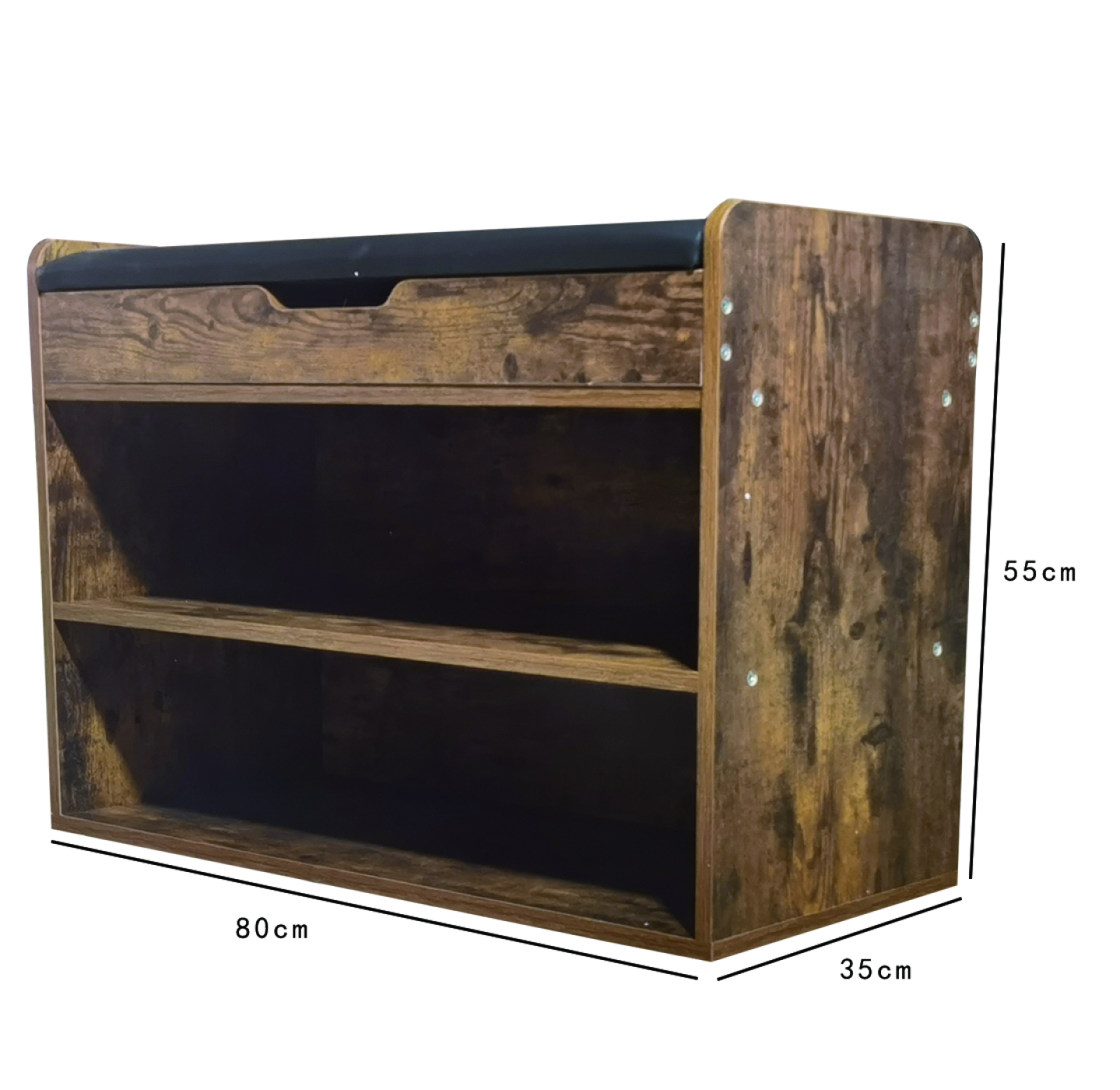Een mooi en functioneel meubel voor in uw gang hal kinderkamer slaapkamer of ontvangstruimte. Een goede oplossing om uw schoenen op te bergen dat is dit vintage bruine halbankje met 2 open vakken en een comfortabel zwart zitkussen zodat u het ook als zitbankje kunt gebruiken. Het zitkussen is ook nog opklapbaar met daaronder extra opbergruimte. De middelste plank onder het zitkussen kunt u er uitnemen zodat 1 groot opbergvak ontstaat voor het plaatsen van laarzen of hoge schoenen. Natuurlijk kunt u dit bankje met opbergruimte ook gebruiken voor het opbergen van vele andere items of als extra zitplaats in de kinderkamer slaapkamer keuken of woonkamer. Afmetingen: 80 cm breed 35 cm diep en 55 cm hoog. Het kastje kan snel en eenvoudig worden gemonteerd met behulp van de meegeleverde montage handleiding en bevestigingsmateriaal.