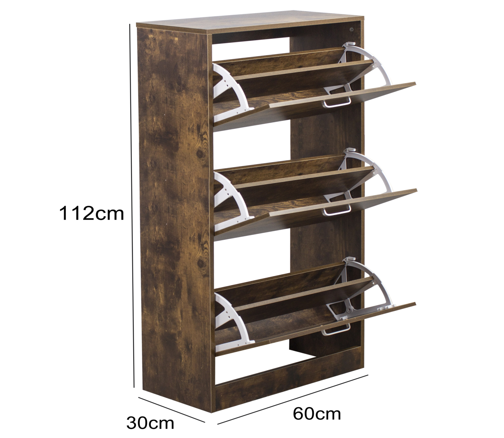 Berg je schoenen netjes en overzichtelijk op in deze donkerbruin walnoot kleurige schoenenkast met drie afzonderlijke opbergvakken. Omdat dit schoenenrek ten opzichte van de andere schoenenkasten uit deze range 30 cm diep is kunnen hier net wat grotere en hogere schoenen in worden opgeborgen. Een perfect ontworpen schoenenkast voor plaatsing tegen de wand of in een inloopkast voor het netjes en overzichtelijk opbergen van schoenen die je liever uit het zicht hebt in bijvoorbeeld de hal slaapkamer garage of andere ruimtes in uw huis. Deze schoenenkast heeft 3 afzonderlijk te openen vakken waarin je schoenen kunt opbergen. De stijlvolle schoenenkast is gemaakt van meubelpaneel en is eenvoudig te monteren. Hoogte opbergvak 32 cm en diepte opbergvak 27 cm. Afmetingen kast: hoog 112 cm x breed 60 cm x diep 30 cm. Levering is inclusief montagehandleiding en benodigde montage materialen.