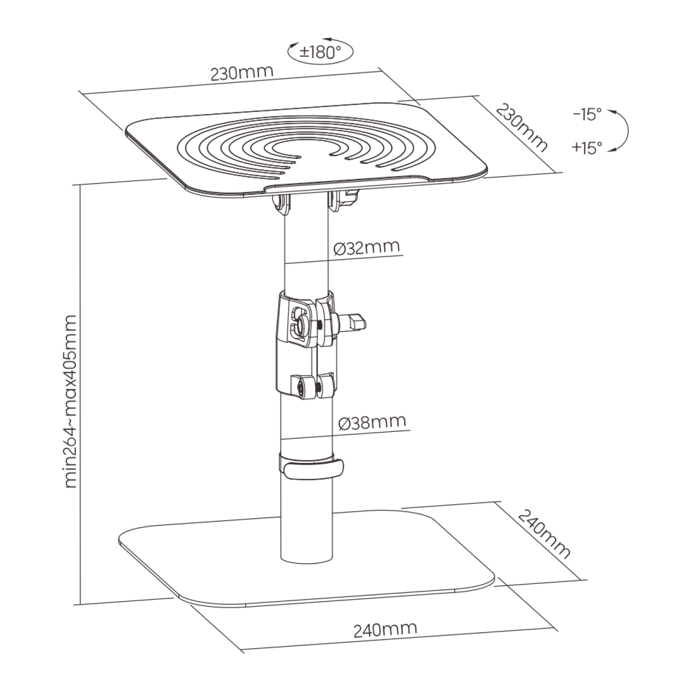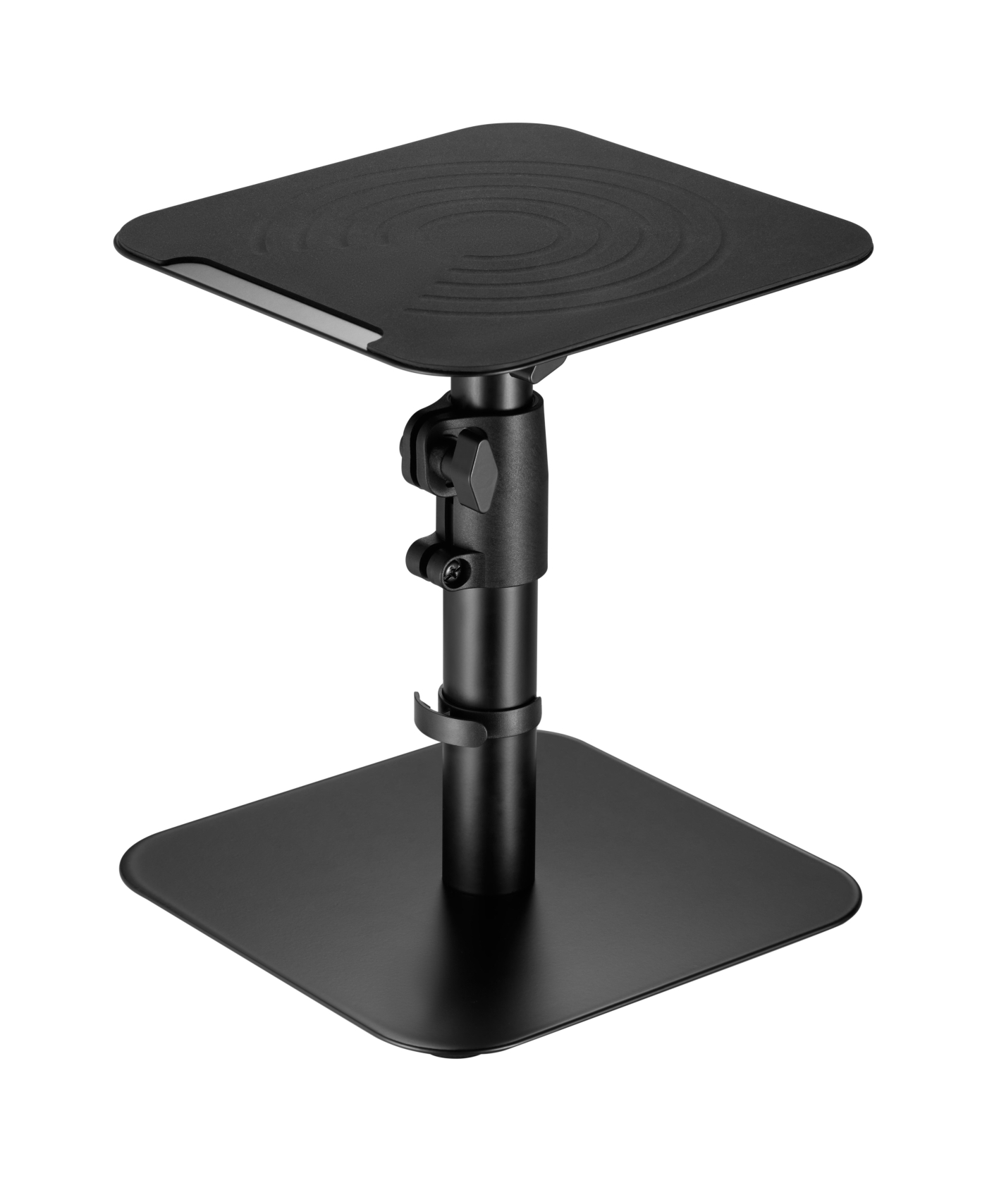 Een set van twee universele speaker standaarden geschikt voor het plaatsen op een bureau of ander meubel of plank in uw woonkamer slaapkamer studio of kantoor. Het speaker statief is in hoogte verstelbaar tussen 26 cm en 40 en 180 graden roteerbaar en 15 graden naar beneden en boven kantelbaar voor uw optimale luisterhoek en een hoogwaardige muzikale ervaring. Een unieke trillings reducerende siliconen toppad ontwerp verbetert de kwaliteit en zuiverheid van het geluid terwijl de luidspreker stevig op de standaard staat. Het kabelmanagement verbergt kabels voor een georganiseerd uiterlijk. Maximaal gewicht per standaard is 15 kg. Afmetingen van deze speaker statief is 23 cm x 23 cm x 26 cm tot 40 cm.