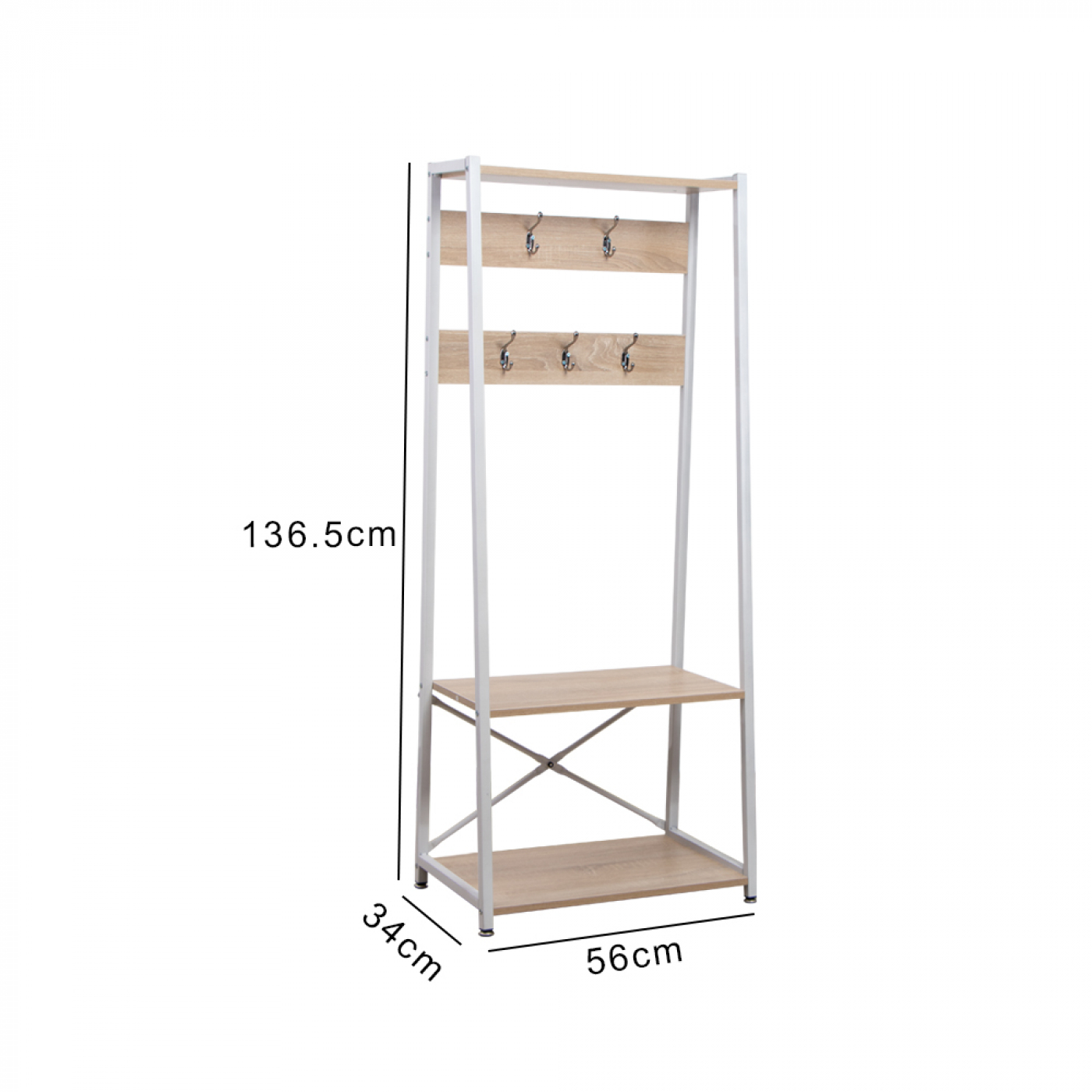 Een mooie en stevige staande in industrieel design vervaardigde metalen staande kapstok met 2 legplanken voor het plaatsen van uw schoenen helm of andere items. Door de hoogte van 137.5 cm is deze staande kapstok ook uitermate geschikt als kinderkapstok. Door de mooie en industriele look is deze kapstok geschikt voor elk interieur en past in elke hal kinderkamer slaapkamer of kantoorruimte. Voldoende ruimte voor het ophangen van jassen en het plaatsen van uw schoenen uw helm of andere items op de 2 legplanken. Afmetingen: Hoog 137.5 cm x breed 56 cm x diep 34 cm. Levering inclusief montagehandleiding en benodigde materialen.