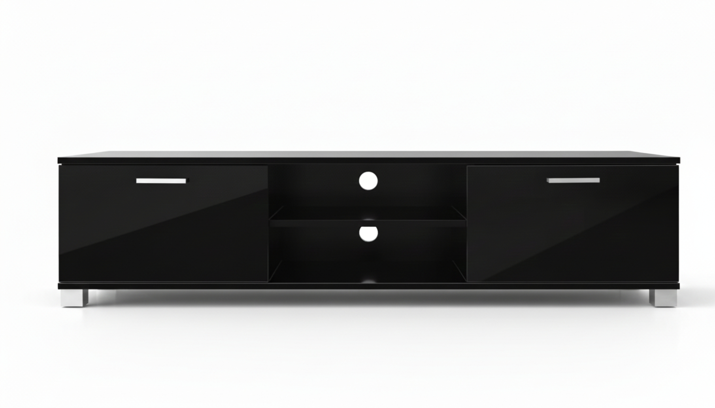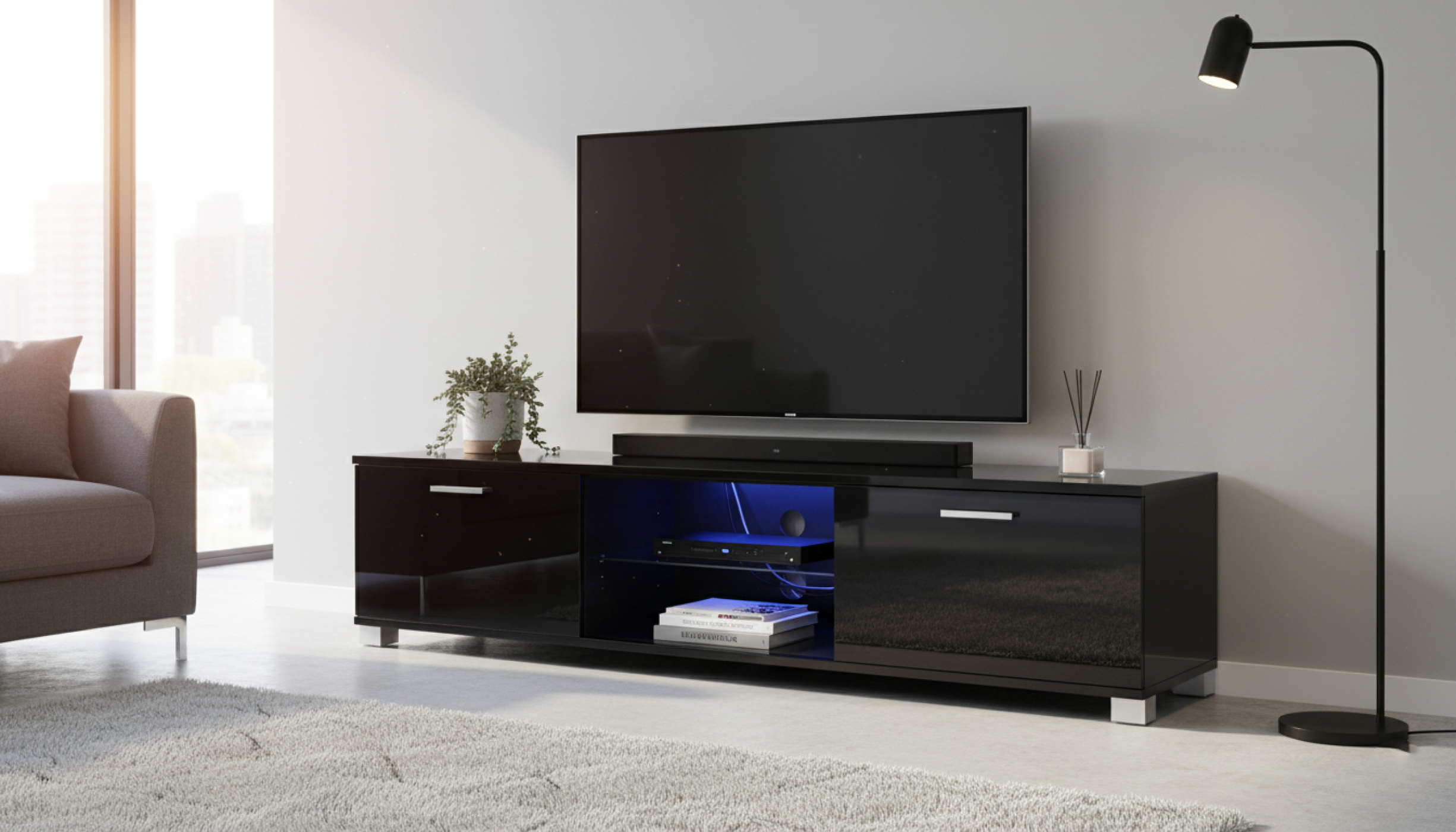 Een stijlvolle woonkamer kan niet zonder deze praktische en functionele zwarte TV kast met led verlichting. Zowel rechts als links heeft dit tv meubel openslaande deuren voor het opbergen van items die u niet in het zicht wilt hebben. Het middelste gedeelte is speciaal ontworpen voor het plaatsen van uw multimedia-apparatuur Nintendo Playstation game console DVD blu ray speler of andere benodigde apparatuur. De LED verlichting voorziet dit meubel van een unieke charme die uw woonruimte een geweldige warme uitstraling en karakter zal geven. Natuurlijk kunt u deze tv dressoir ook zonder de meegeleverde led verlichting in uw woonkamer plaatsen. Kleur: zwart. Afmetingen: breedte 140 cm hoogte 35 cm diepte 40 cm. Open console in het midden is voorzien van een 15 mm dikke glasplaat. Levering inclusief LED verlichting, montagehandleiding en benodigde montagematerialen.