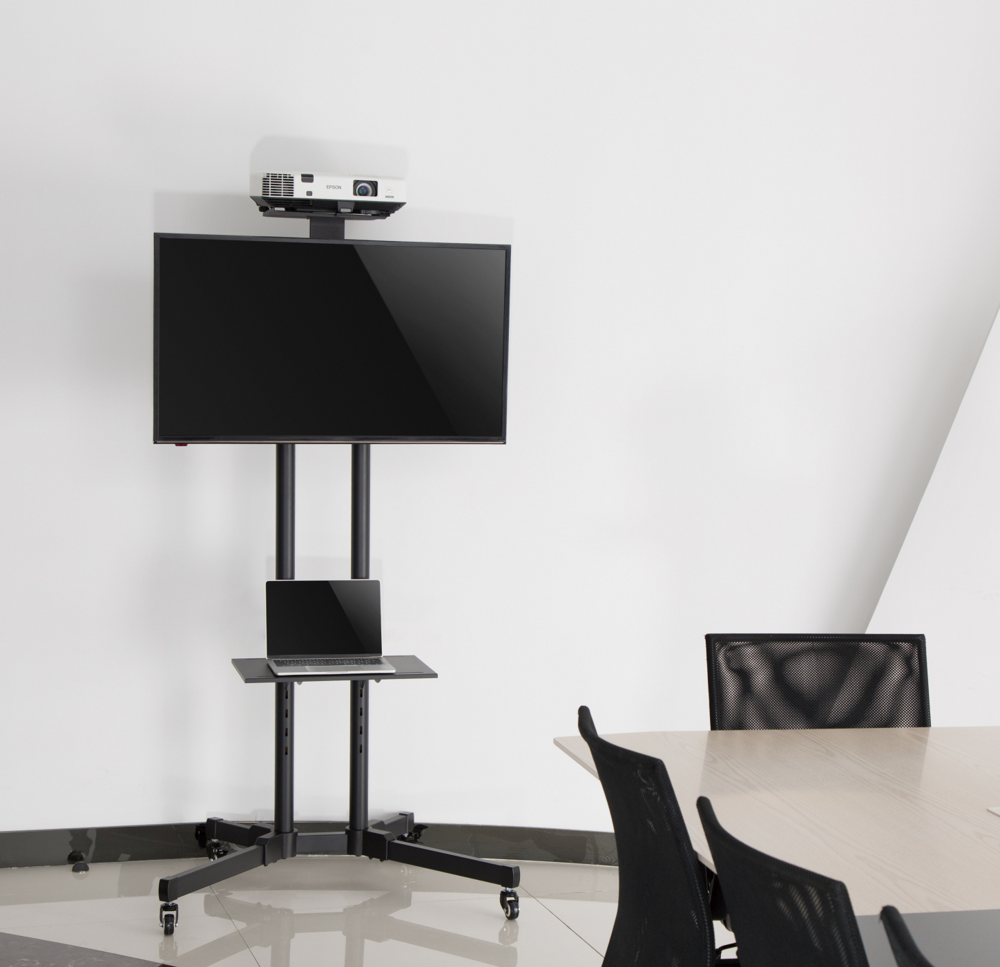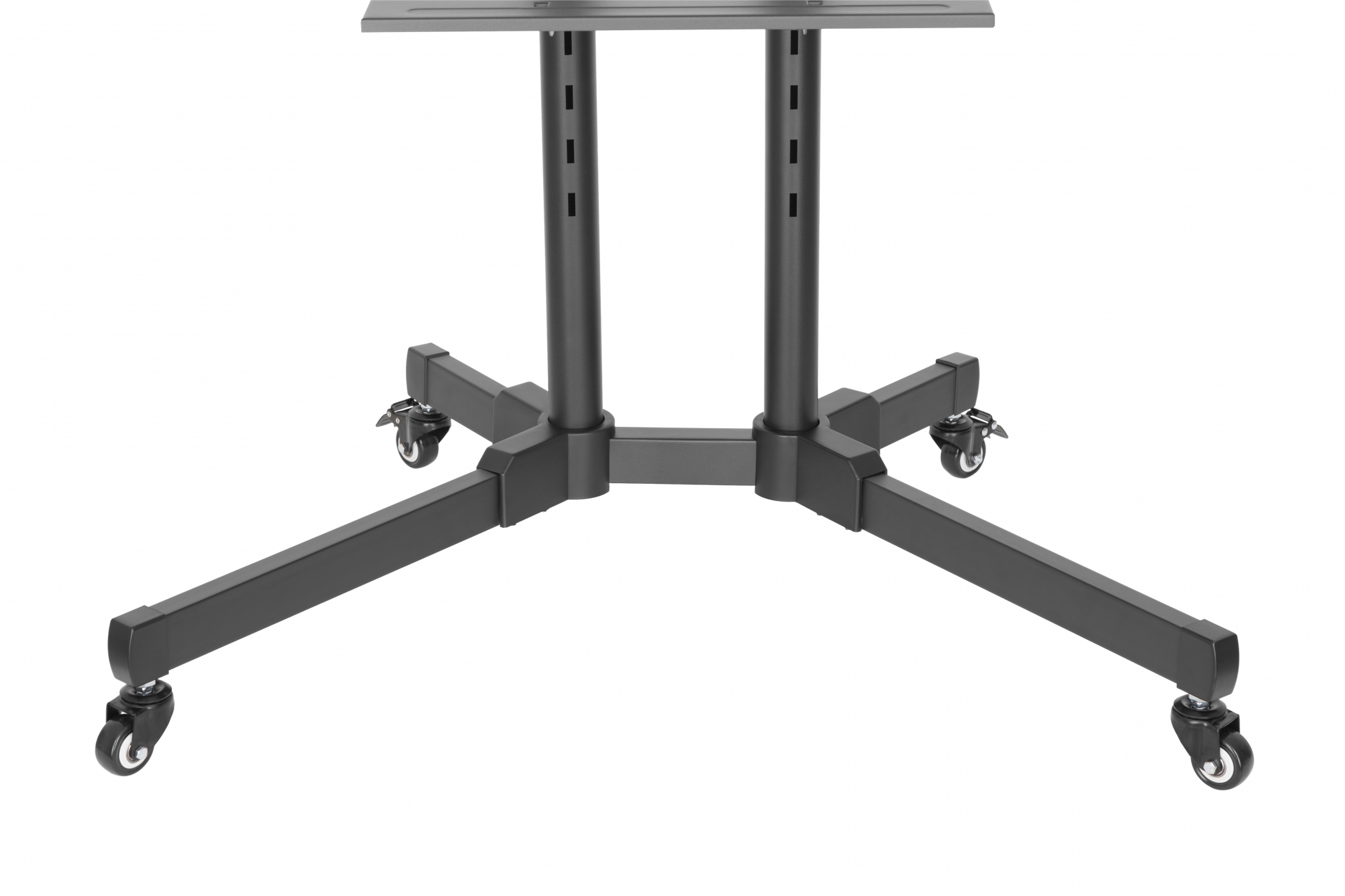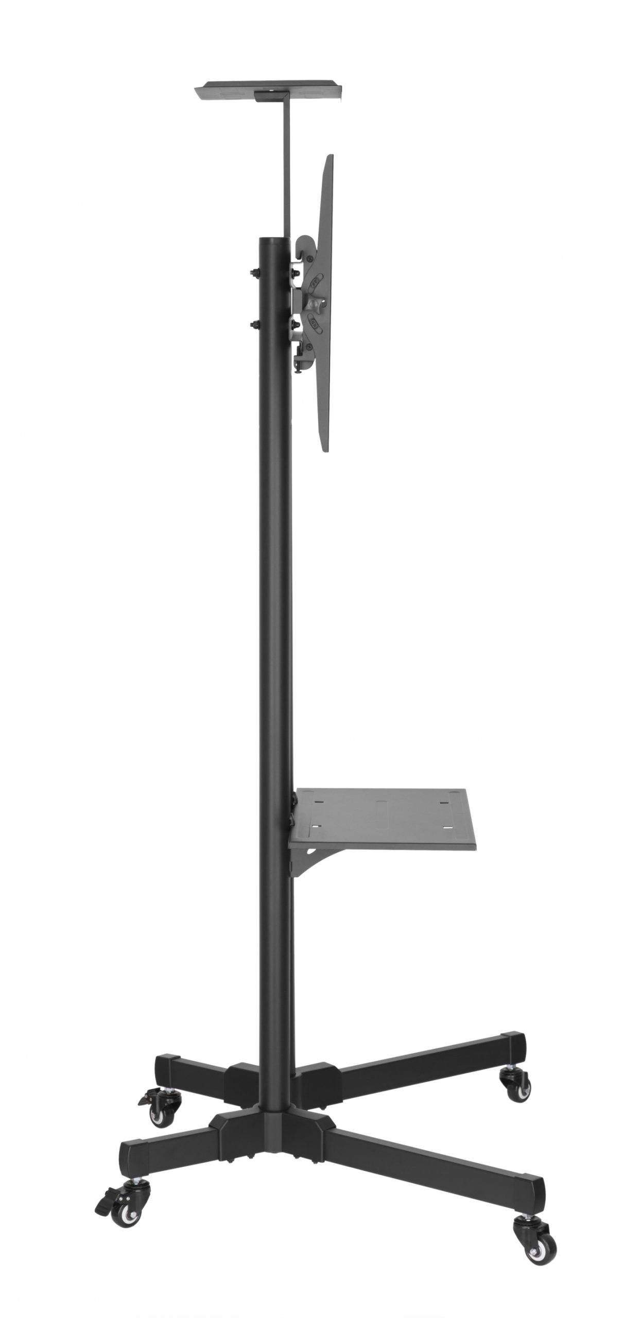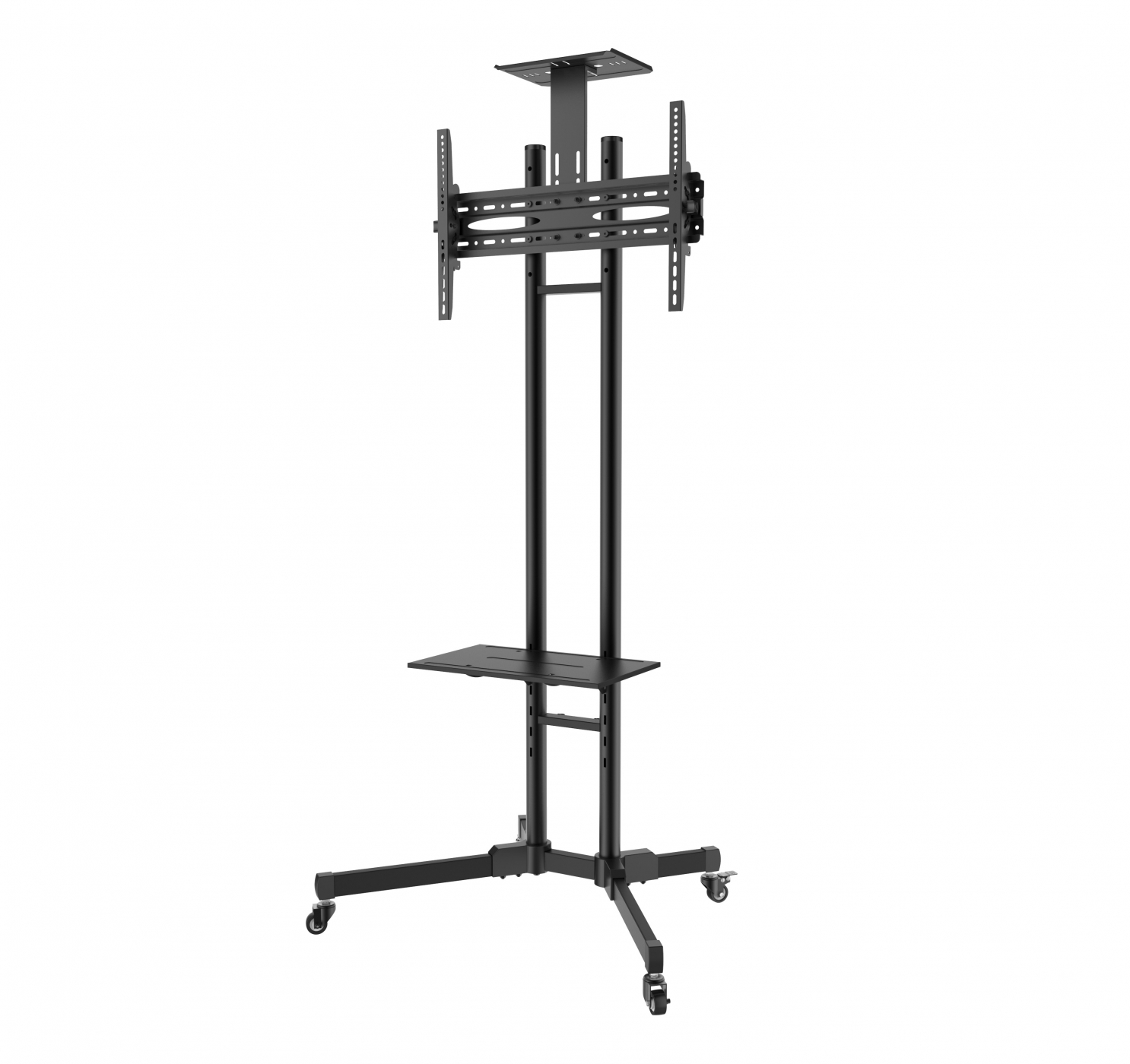 Een praktische en functionele verrijdbare tv monitor standaard met in hoogte verstelbare camera houder en apparatuur plank. Geschikt voor thuis gebruik in uw woning maar zeker ook voor commercieel gebruik als monitor beurs statief in kantoren scholen hotels luchthavens restaurants conferentie zalen lobby’s en ontvangstruimtes. Geschikt voor beeldschermen van 37 inch tot 70 inch met een maximaal gewicht van 50 kg. Het beeldscherm kan op elk gewenst moment worden aangepast aan de verschillende kijkbehoeften +10 en -10° naar boven en onder vrij kantelbaar. Hoogte instelbaar tot midden tv beeldscherm in drie stappen van 129 cm – 137 cm – 145 cm. Vier soepel lopende wielen zorgen voor makkelijke en snelle verplaatsing van deze verrijdbare tv monitor standaard. Het kabelmanagement zorgt er voor dat de kabels netjes en veilig kunnen worden weggewerkt. Vesa compatabel met 200×200 300×300 400×200 400×400 600×400. Levering inclusief montage instructie en benodigde montage materialen.