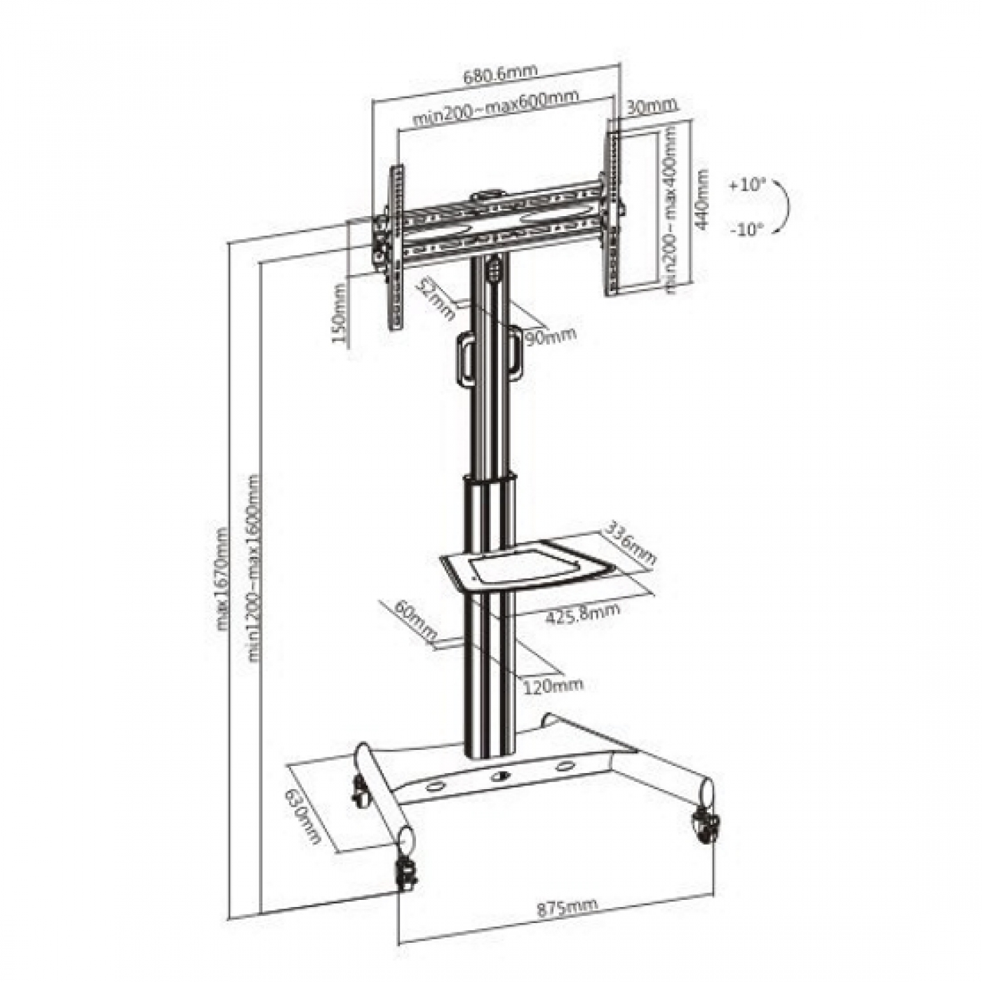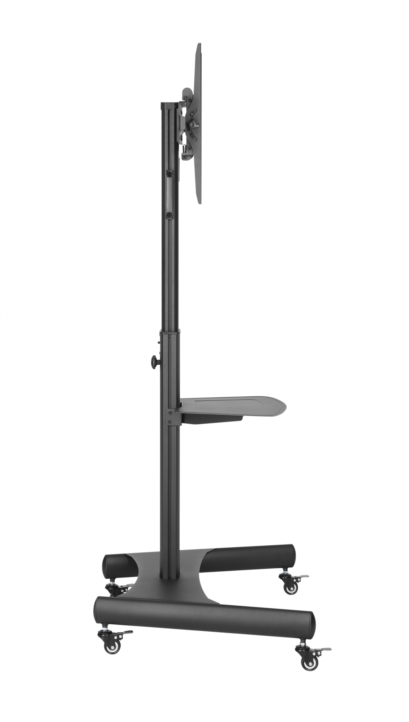 Een functionele en stevige verrijdbare tv standaard statief ideaal voor video conferentie en in vergaderruimtes scholen en openbare kantoren ontvangstruimtes en horeca maar ook geschikt voor gebruik in uw woonkamer slaapkamer of game kamer. Met behulp van een veervergrendeling met snelsluiting kan deze tv standaard in hoogtes worden aangepast vanuit het midden van de televisie of monitor gerekend in de hoogte van 120 cm tot 160 cm. Zodra de hoogte is ingesteld, kan het scherm eenvoudig worden waterpas gesteld en aangepast aan de juiste kijkhoek met het het kantelbare systeem van 10 graden naar beneden en 10 graden naar boven. Vier vergrendelbare zwenkwielen zorgen voor een soepele en stabiele beweging van de ene locatie naar de andere. Het kabelbeheer geïntegreerd in de kolom houdt kabels verborgen en georganiseerd. Het opbergplankje biedt meer opbergruimte voor accessoires en apparatuur. Geschikt voor beeldschermen van 32 inch tot 65 inch met een gewicht van maximaal 35 kg. Vesa compatible met 600×400 400×400 200×200 400×200 en 300×300. Levering inclusief montage handleiding en benodigde onderdelen.