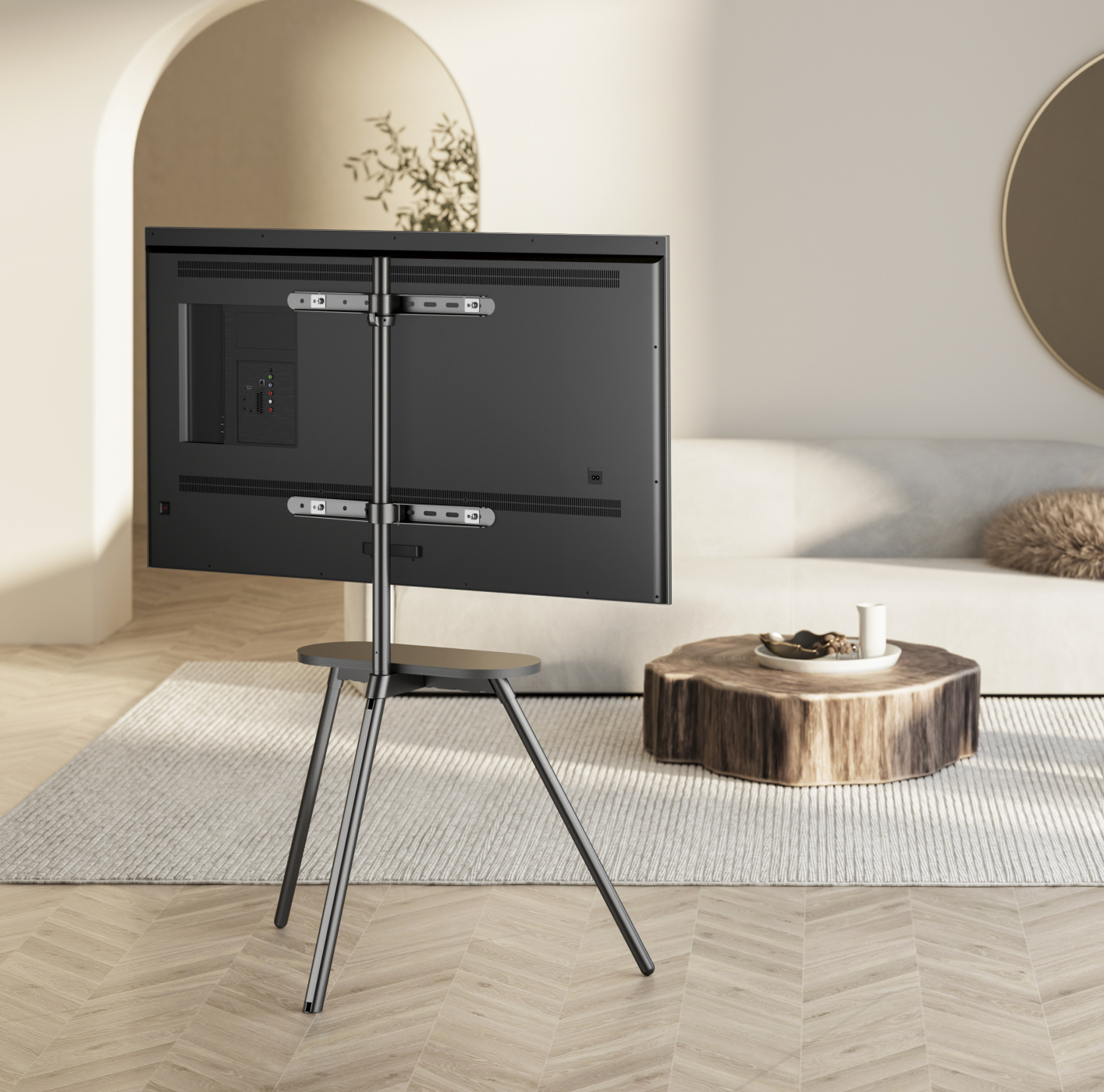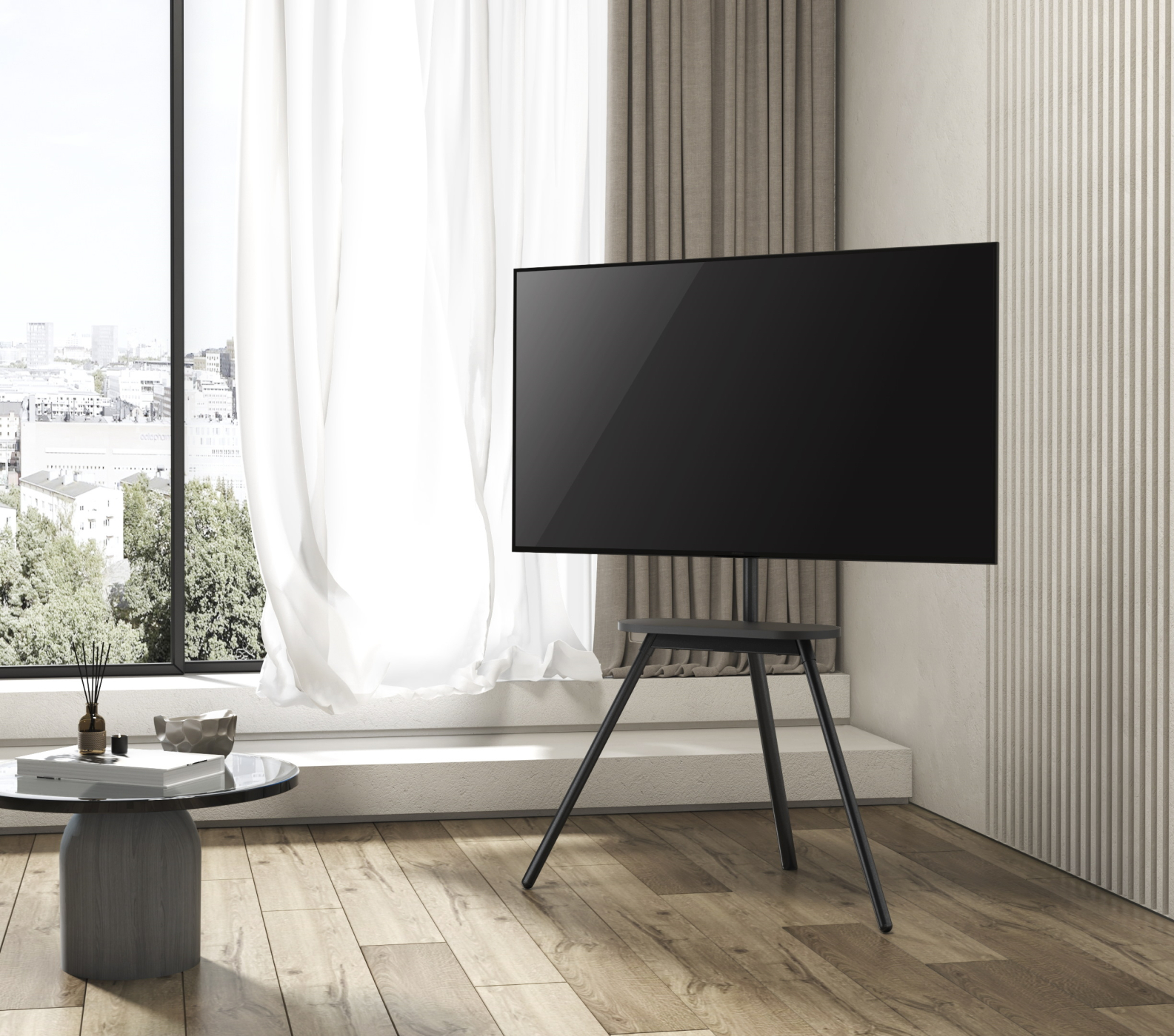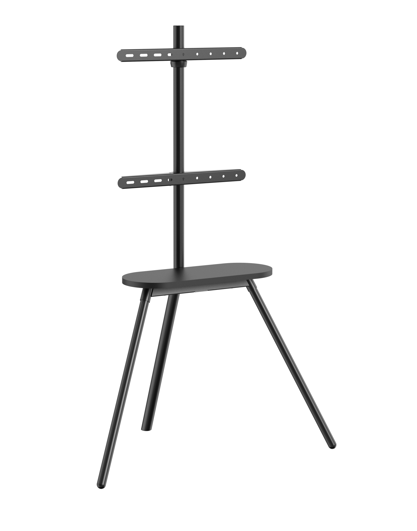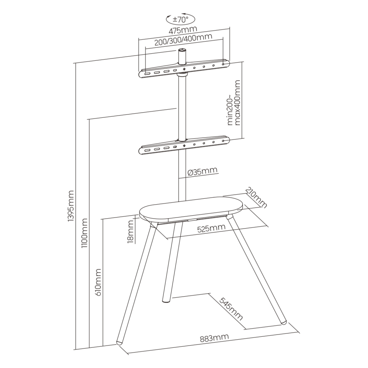 TV standaard met een minimalistische maar toch een mooi studio design speciaal ontworpen om een comfortabele kijkomgeving te creëren. De tv standaard is geschikt voor schermen tussen de 43 inch en 65 inch met een maximaal gewicht van 40 kg en kan +70 graden en -70 graden worden gedraaid voor de optimale kijkhoek in te stellen. Direct onder de tv bevindt zich een opbergplank waarop gemakkelijk afstandsbedieningen, draagbare luidsprekers en andere kleine voorwerpen kunnen worden geplaatst. Uitermate geschikt voor plaatsing in de woonkamer slaapkamer game kamer of in uw kantoor of vergaderruimte ontvangsruimte. Anti-Slip rubberen voeten beschermen oppervlakken tegen slijtage en krassen. Additioneel naar keuze te monteren Anti TipTV Safety Strap voorkomt tv kantelen en zorgt voor de veiligheid van de kinderen. Kabelbeheer verbergt op elegante wijze alle kabels die aan beeldschermen zijn bevestigd. Vesa compatibel met 200×200 300×200 300×300 400×200 400×300 400×400. Afmetingen 88 cm breed x 54 cm diep x 138 cm hoog.