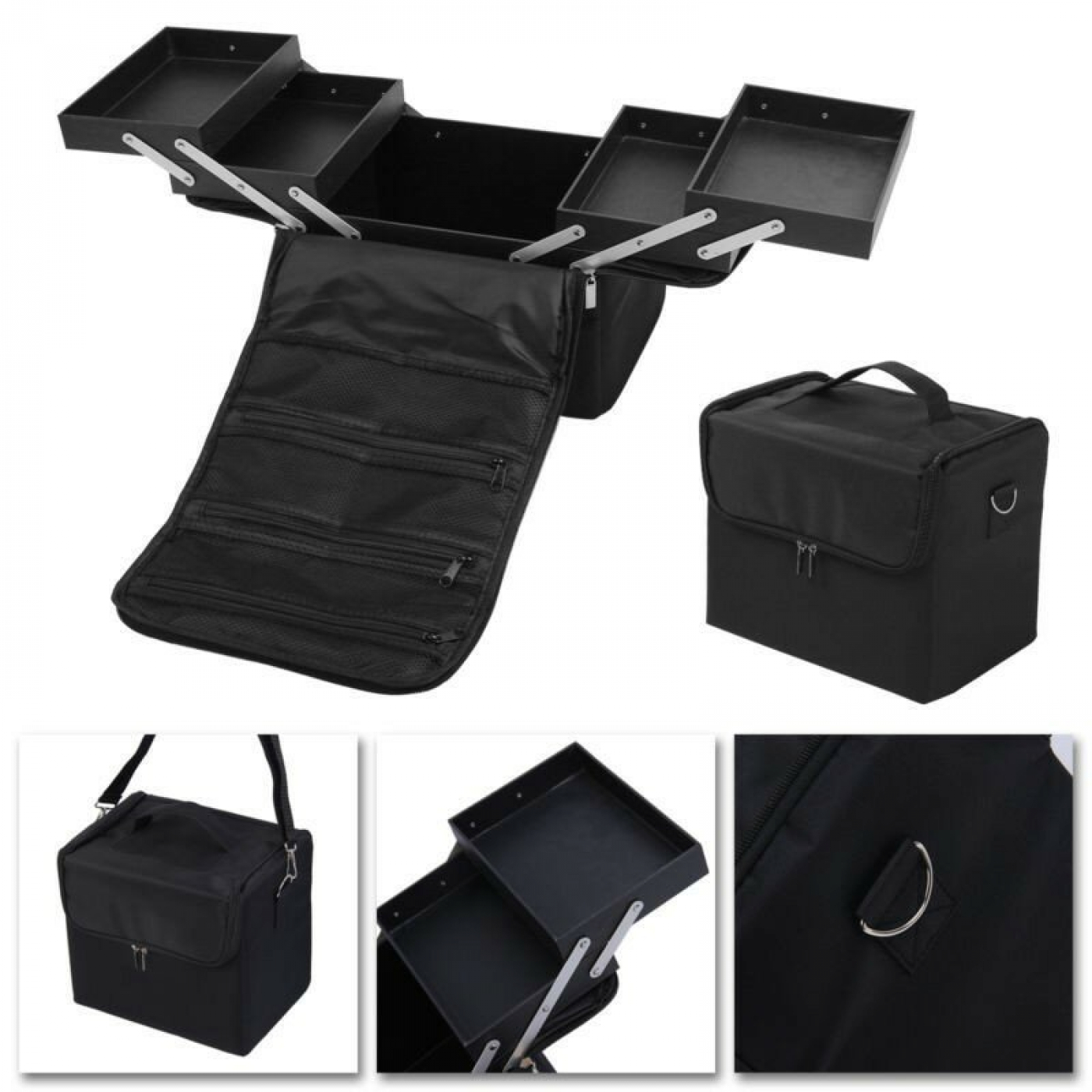 Cosmetica visagie koffer beauty case nagelstyliste koffer perfect geschikt voor het opbergen en vervoeren van uw persoonlijke verzorgings accessoires zowel voor professioneel gebruik als thuis gebruik. Zeer handig met stevige handgreep aan de bovenzijde en de mogelijkheid om te dragen d.m.v. een bijgeleverde schouderband. Deze beauty case heeft 4 opbergbakje die uitklapbaar zijn (zie foro) met daaronder een open opbergruimte. De visagietas heeft ook nog extra opbergruimte af te sluiten met een rits voor het opbergen van kleine items of documenten. Afmetingen 4 uitklapbare opbergbakjes 19 cm breed x 13.5 cm diep x 3.5 cm hoog. Totale afmeting visagietas 29 cm breed x 20 cm diep x 25 cm hoog. Kleur zwart.