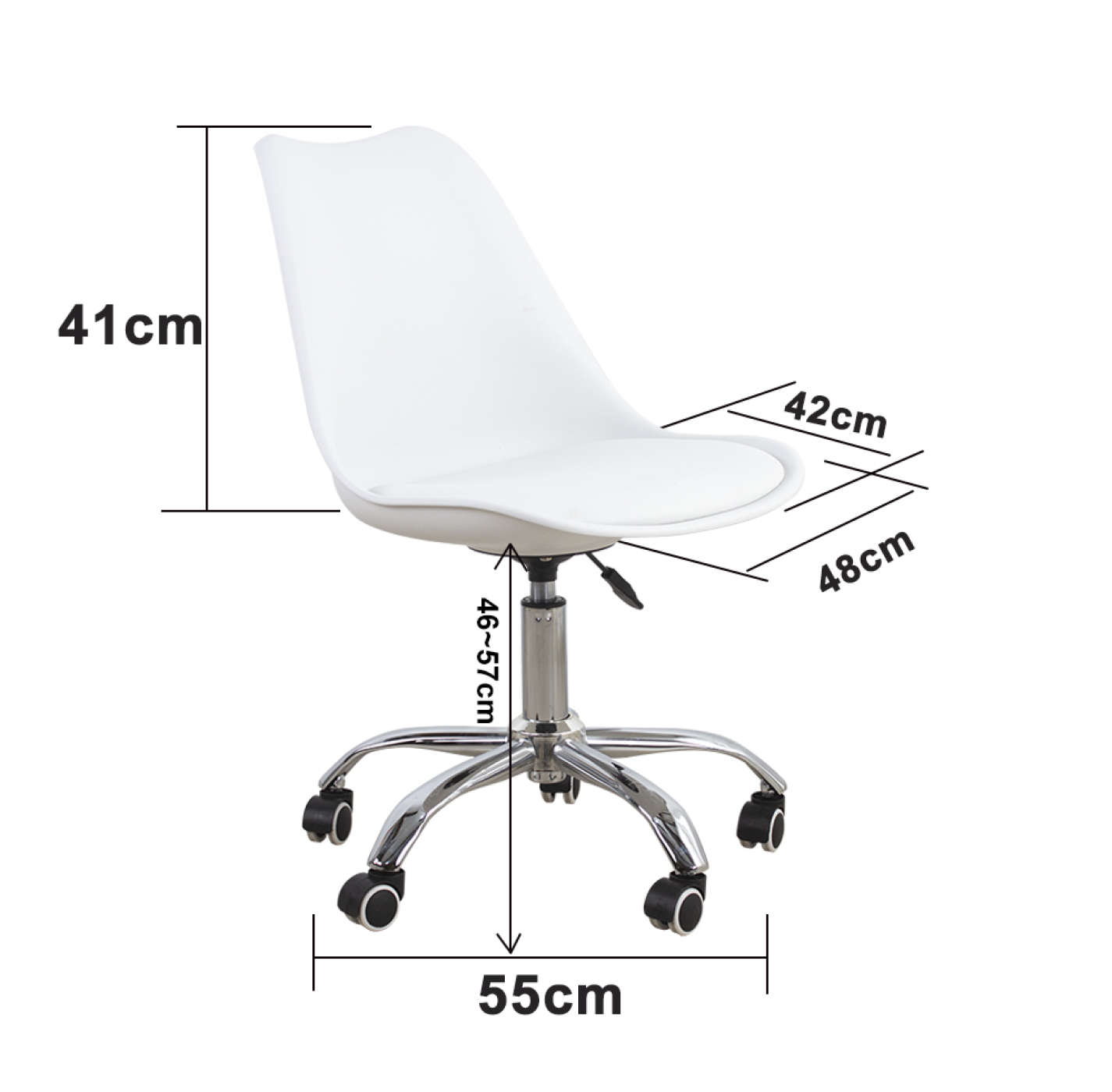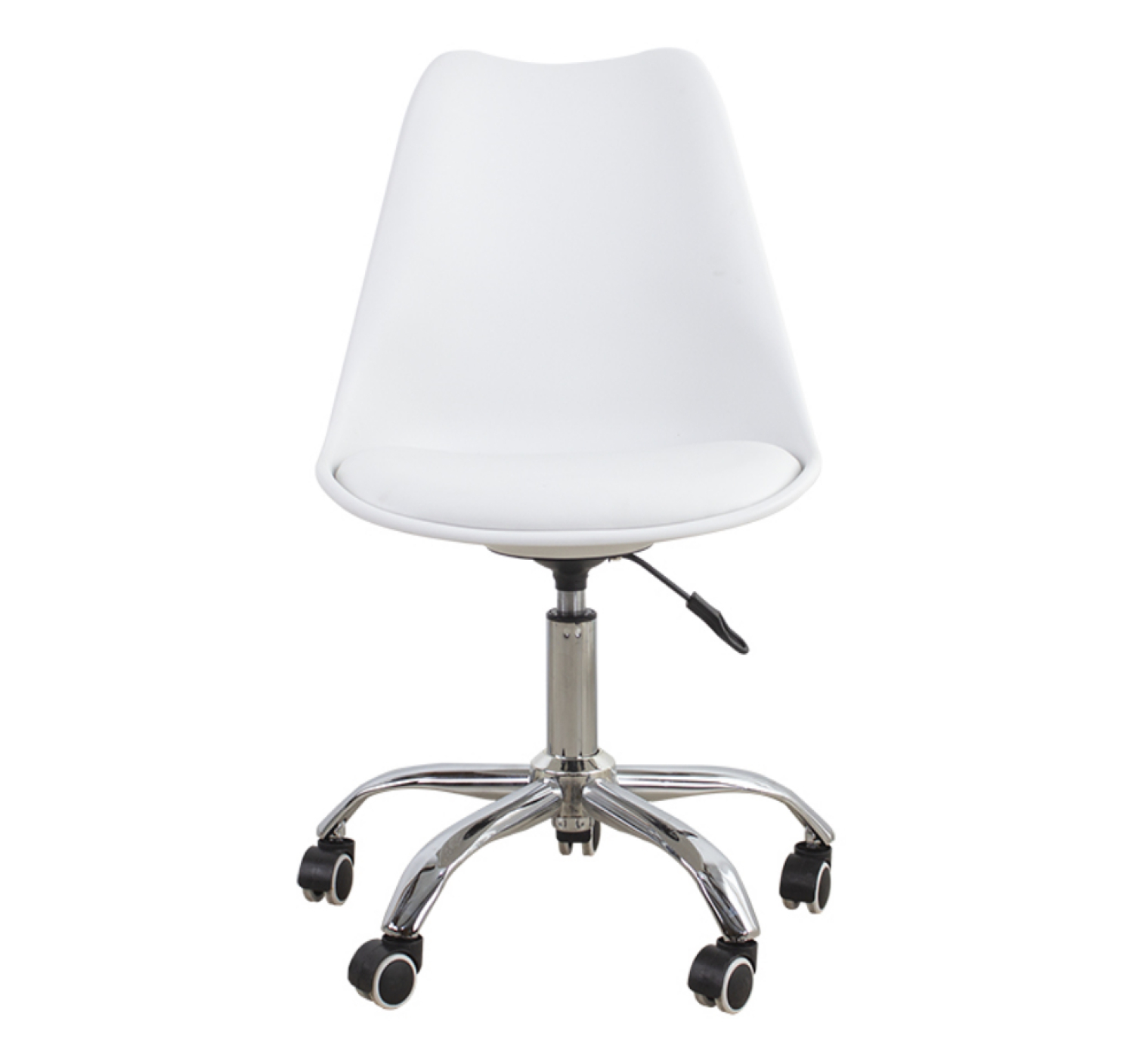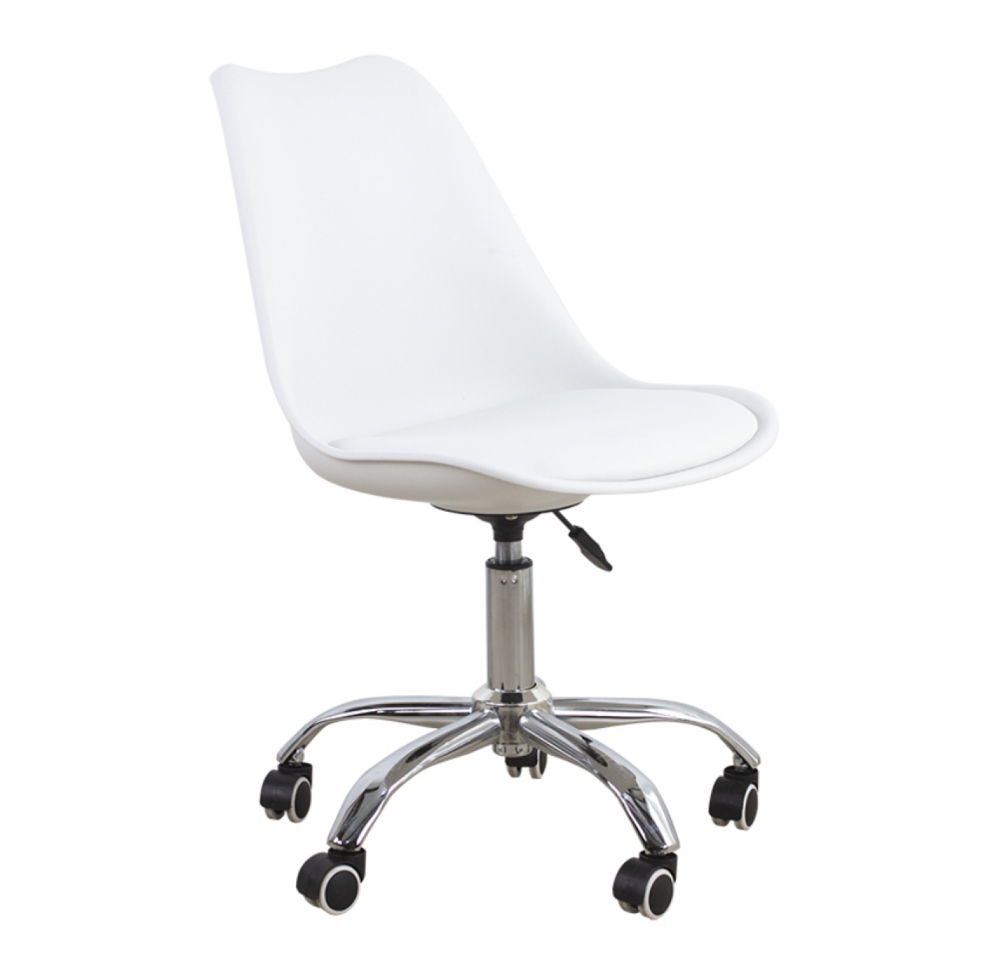 Een functionele en praktische witte bureaustoel met een ergonomisch vormgegeven kuip en een comfortabel kussentje voor optimaal zitcomfort. De bureaustoel heeft een in hoogte verstelbare zitting van 47 cm tot 57 cm en staat stabiel op een stevig frame met vijf zwenkwielen. Of het nu een harde of zachte ondergrond is, deze stoel rijdt altijd makkelijk over het oppervlak.
