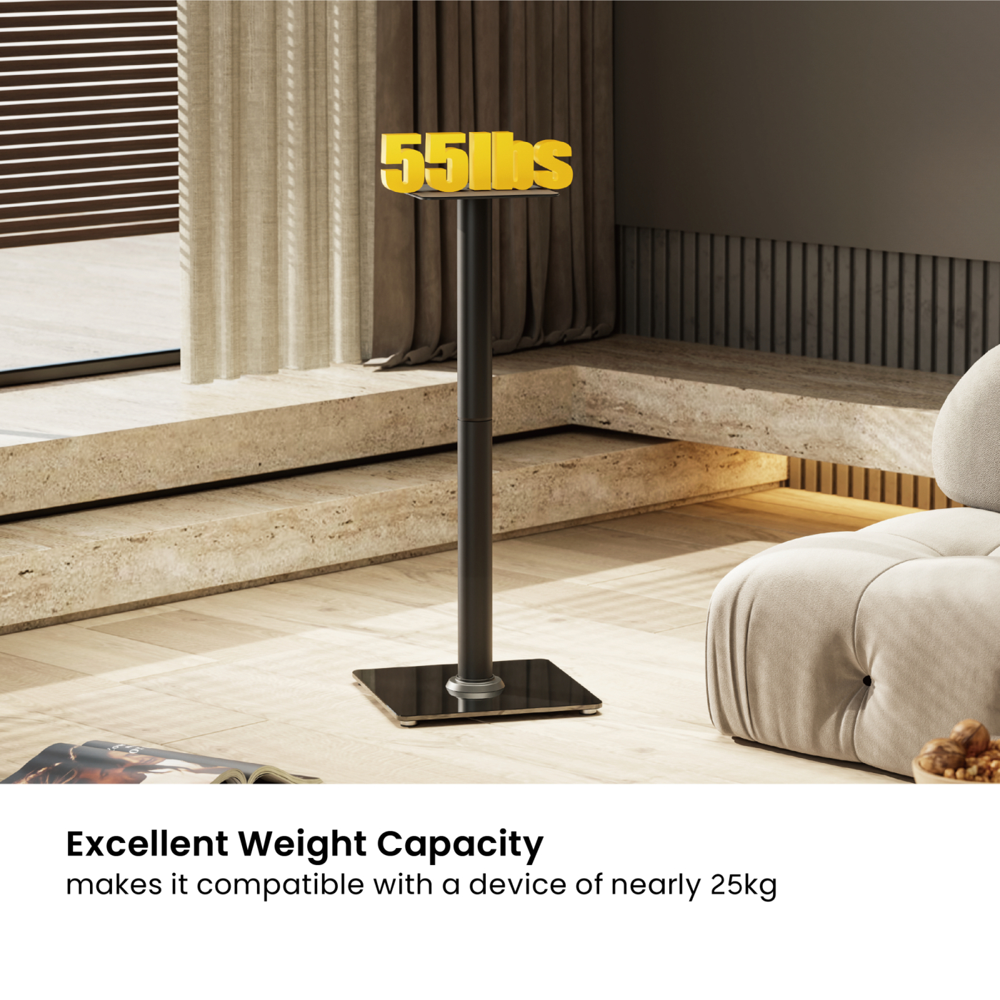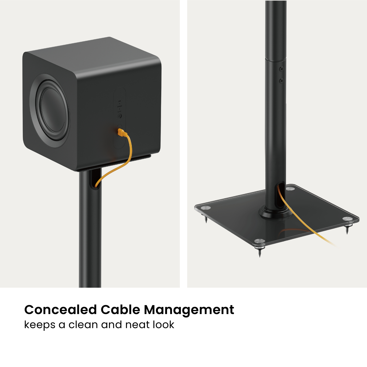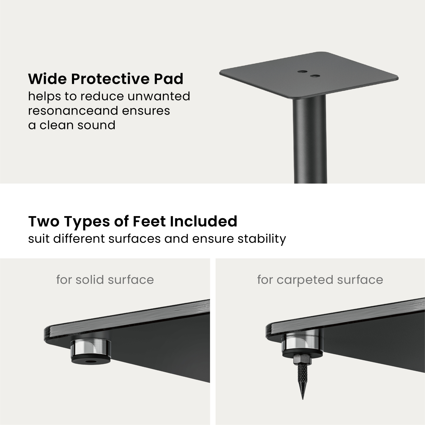 Dit luidspreker vloerstandaard paar biedt uitstekende stabiliteit en geluidskwaliteit voor elke opstelling. Met een gewichtscapaciteit tot 25 kg per standaard en een stevige stalen constructie, zorgen deze standaards ervoor dat je luidsprekers stevig op hun plaats blijven. De beschermende pad aan de bovenkant vermindert ongewenste resonantie voor zuiver geluid. Het verborgen kabelmanagement draagt bij aan een nette, opgeruimde uitstraling. Bovendien worden er twee soorten voetjes meegeleverd: antislip platte voetjes voor harde oppervlakken zoals hout en tegels, en puntige spijkers voor tapijtoppervlakken, zodat je altijd verzekerd bent van optimale stabiliteit.