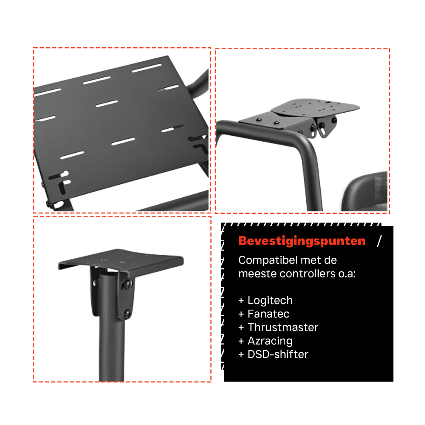 Creëer de ultieme race-ervaring met deze volledig zwarte cockpit. Ontworpen voor beginnende én gevorderde sim racers, met voorgeboorde montagepunten voor o.a. Logitech, Fanatec en Thrustmaster.