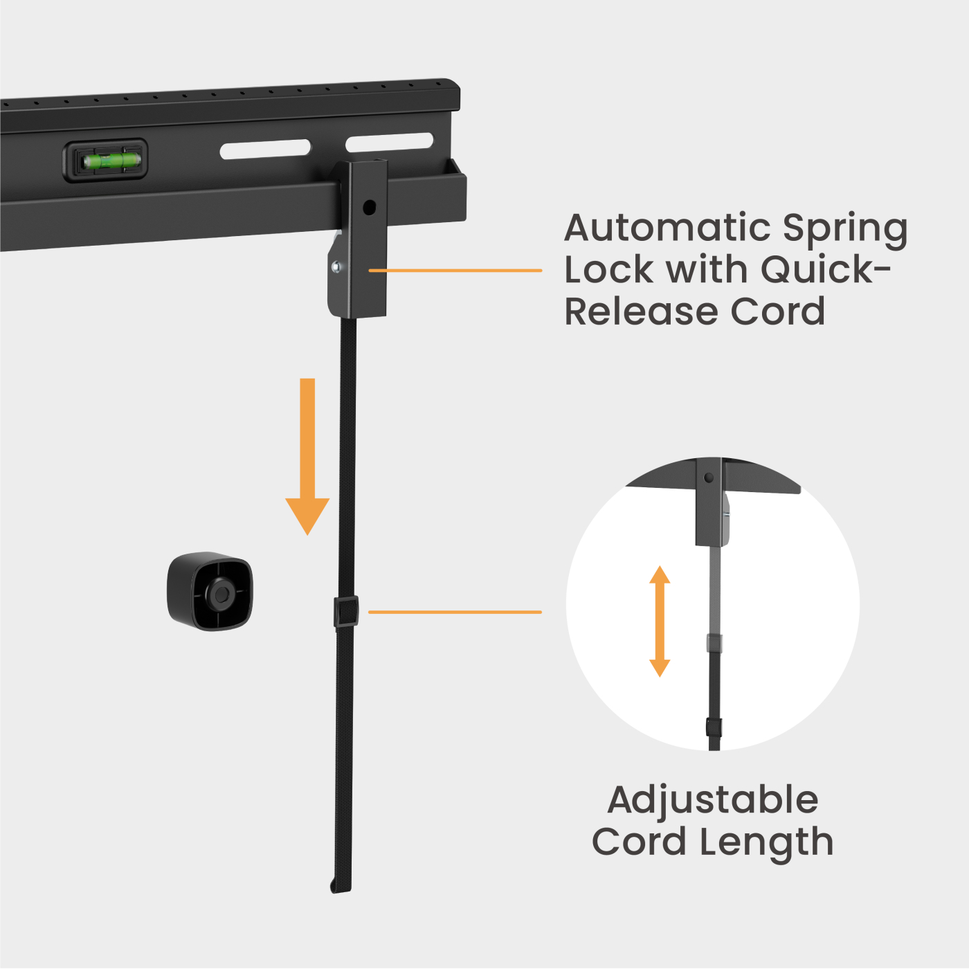 – Automatische veerslot: Zorgt voor een veilige montage, terwijl het snoer met snelsluiting het eenvoudig maakt om de tv te verwijderen.