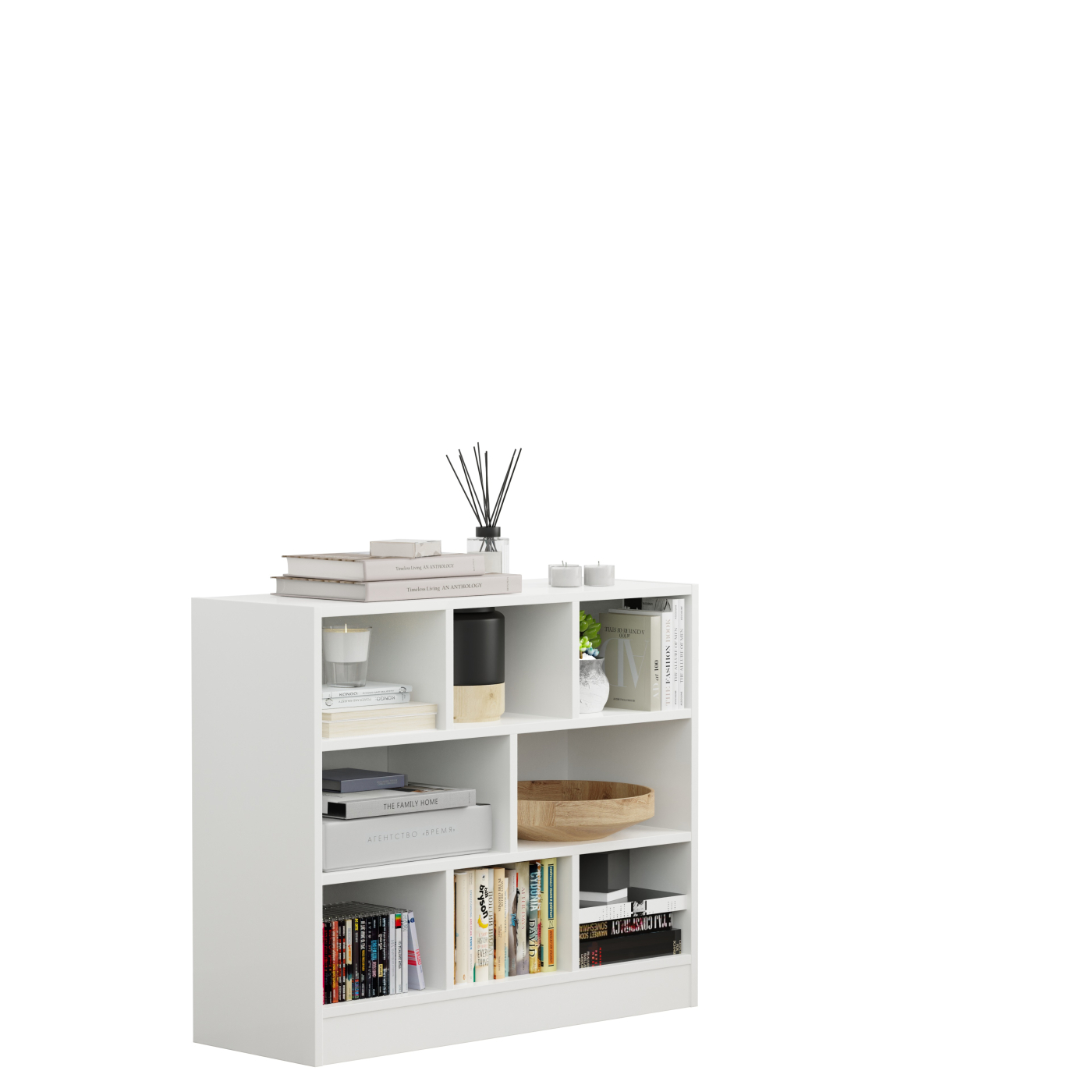 Een compacte maar brede opbergkast met 8 open vakken in een moderne witte afwerking. Dankzij de lage en brede vorm is deze kast ideaal voor onder ramen, schuine wanden of in kleinere ruimtes. Perfect voor het opbergen van boeken, speelgoed, ordners, decoratie en andere items, in elke ruimte van huis of kantoor.