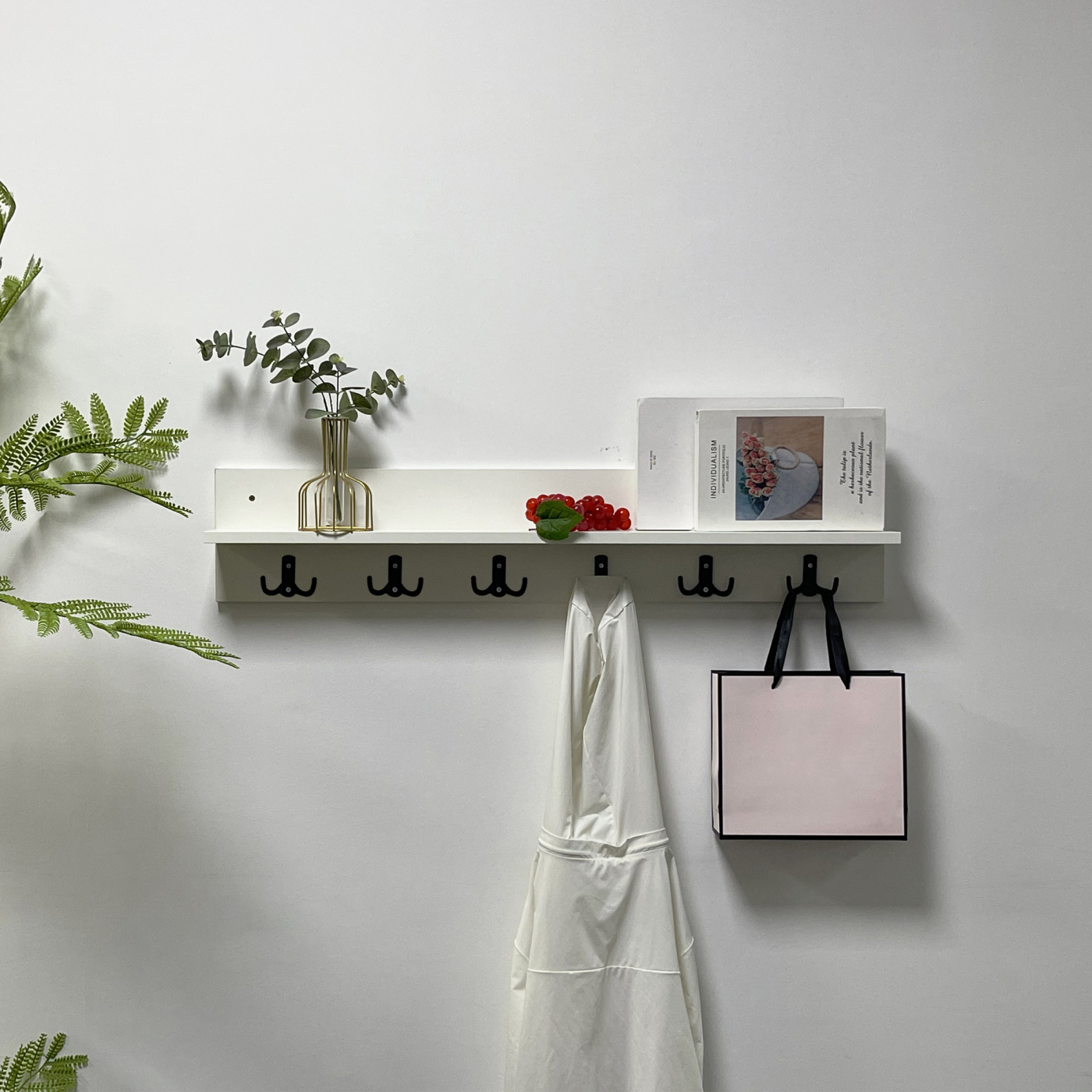 Deze witte wandkapstok combineert slimme opbergruimte met een strak design. Dankzij de praktische bovenplank en meerdere haken is er plek voor jassen, sjaals, tassen en accessoires. Perfect voor in de hal, gang of bijkeuken en eenvoudig aan de muur te monteren.