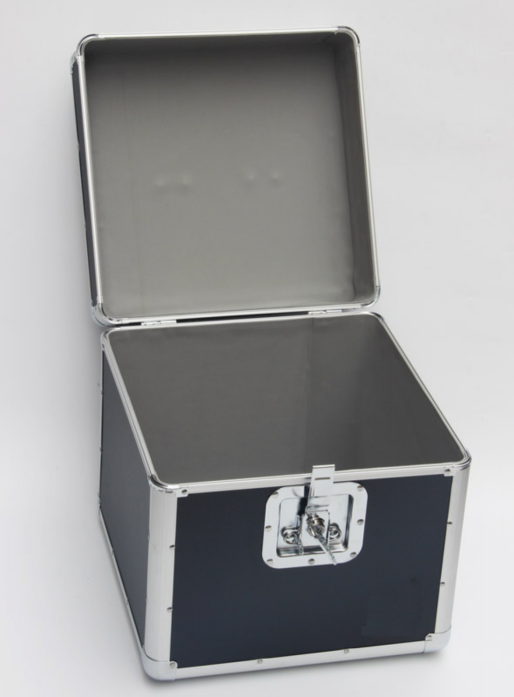 Aluminium DJ case geschikt voor het opbergen van 70 tot 100 LPs. Deze koffer biedt optimale bescherming aan uw kostbare platencollectie maar geeft ook een maximaal gebruiksgemak. Niet alleen is deze koffer comfortabel te vervoeren, hij is ook enorm handig in het gebruik. Het transport van uw platen gaat met deze platen flightcase heel gemakkelijk. Daar zorgt de handgreep wel voor en dankzij de hoekprofielen van verchroomd metaal aan de buitenkant en de beklede binnenkant is uw vinyl zeer goed beschermd. De deksel is separaat afneembaar zodat u door uw platencollectie kunt bladeren zonder dat alle platen uit de koffer moeten worden genomen. Kleur: zwart aluminium. Afmeting: 36 cm x 39 cm x 35 cm. De koffer is af te sluiten dmv een hangslotje. Deze is niet meegeleverd.