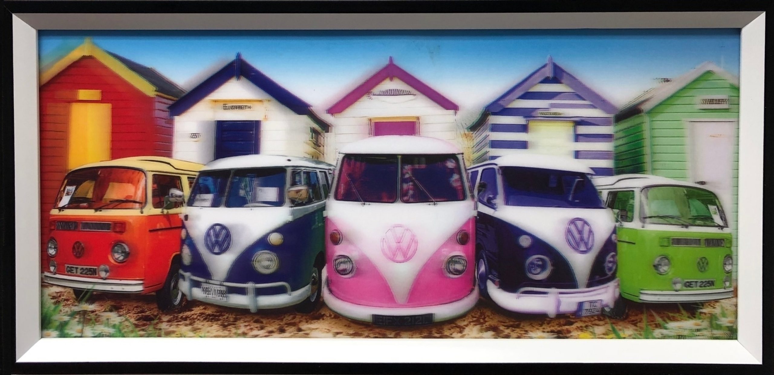 Beleef de ervaring van 3D met deze mooie unieke set van 2 verschillende holografische 3D prints posters met op elk holografisch poster 5 verschillende retro vintage volkswagen VW kever busjes. Elk aanzicht vanuit een andere hoek geeft een nieuwe unieke ervaring. Formaat beide lijsten: breed 53 cm x hoog 26 cm x diep 2 cm.
