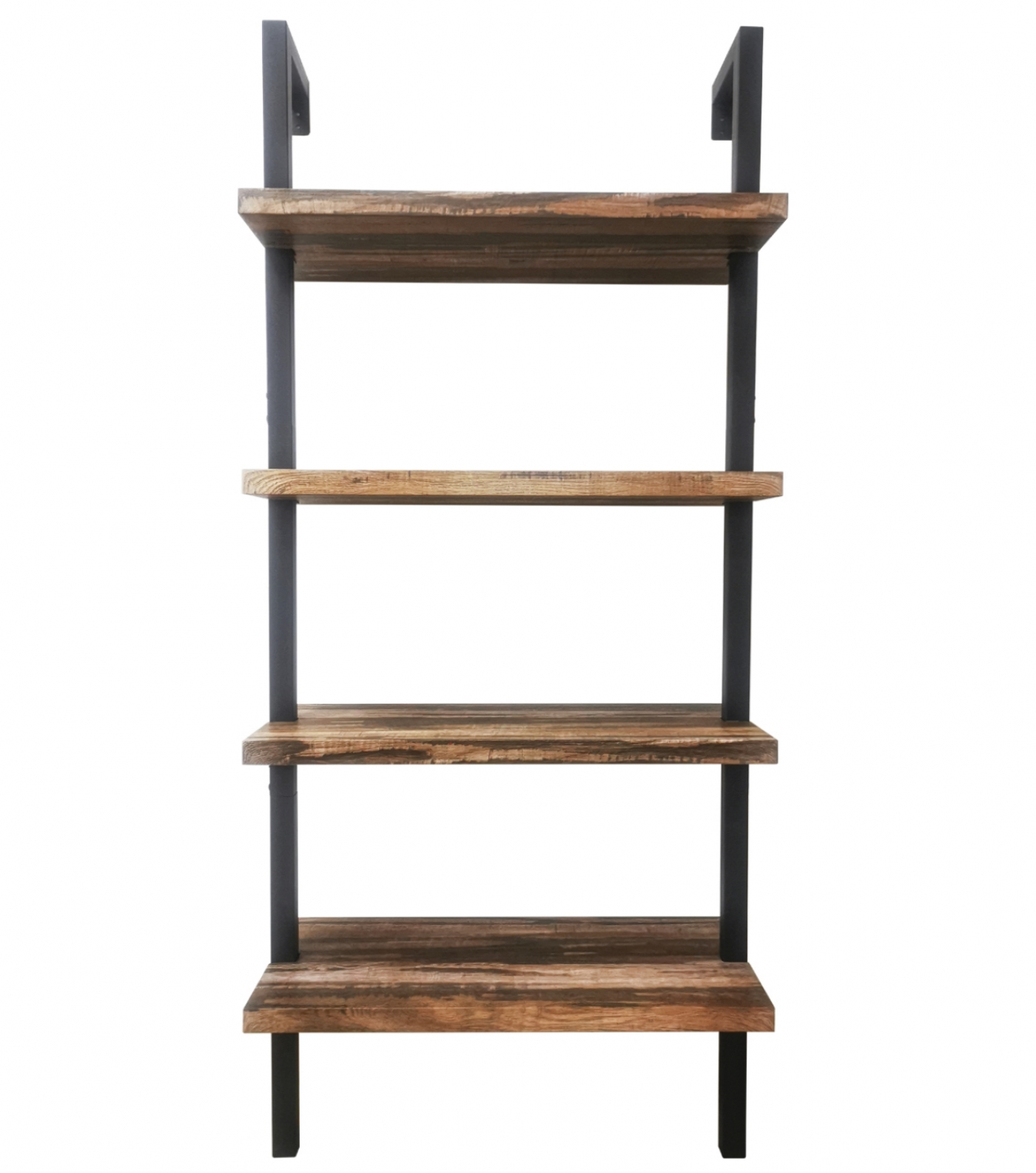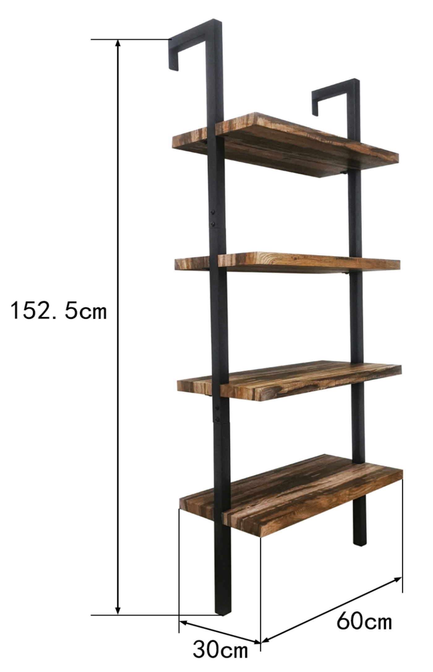 Een mooi ontworpen industriele metalen design wandrek open boekenkast in ladder vorm voor bevestiging aan de muur en geschikt voor elke ruimte in uw woning of kantoor. Het metalen frame met de 4 stuks houten 3 cm dikke legplanken geeft een speels en ruimtelijk karakter aan uw ruimte. Deze metalen industriele ladder decoratief wandrek met muurbevestiging is universeel te gebruiken als onder andere open wandrek boekenkast LP vinyl opbergkast, archiefkast of om uw decoratieve items verzamelingen auto’s treinen vliegtuigen beeldjes of elk andere object mooi te tonen. Het stevige metalen frame biedt maximale stabiliteit en stevigheid door de muur bevestiging met schroeven aan de bovenkant. Afmetingen: breed 60 cm x diep 30 cm x hoog 152 cm. Deze wandkasten Stoer zijn ook verkrijgbaar in de kleur wit en in andere formaten. Levering inclusief montage instructie en benodigde onderdelen.