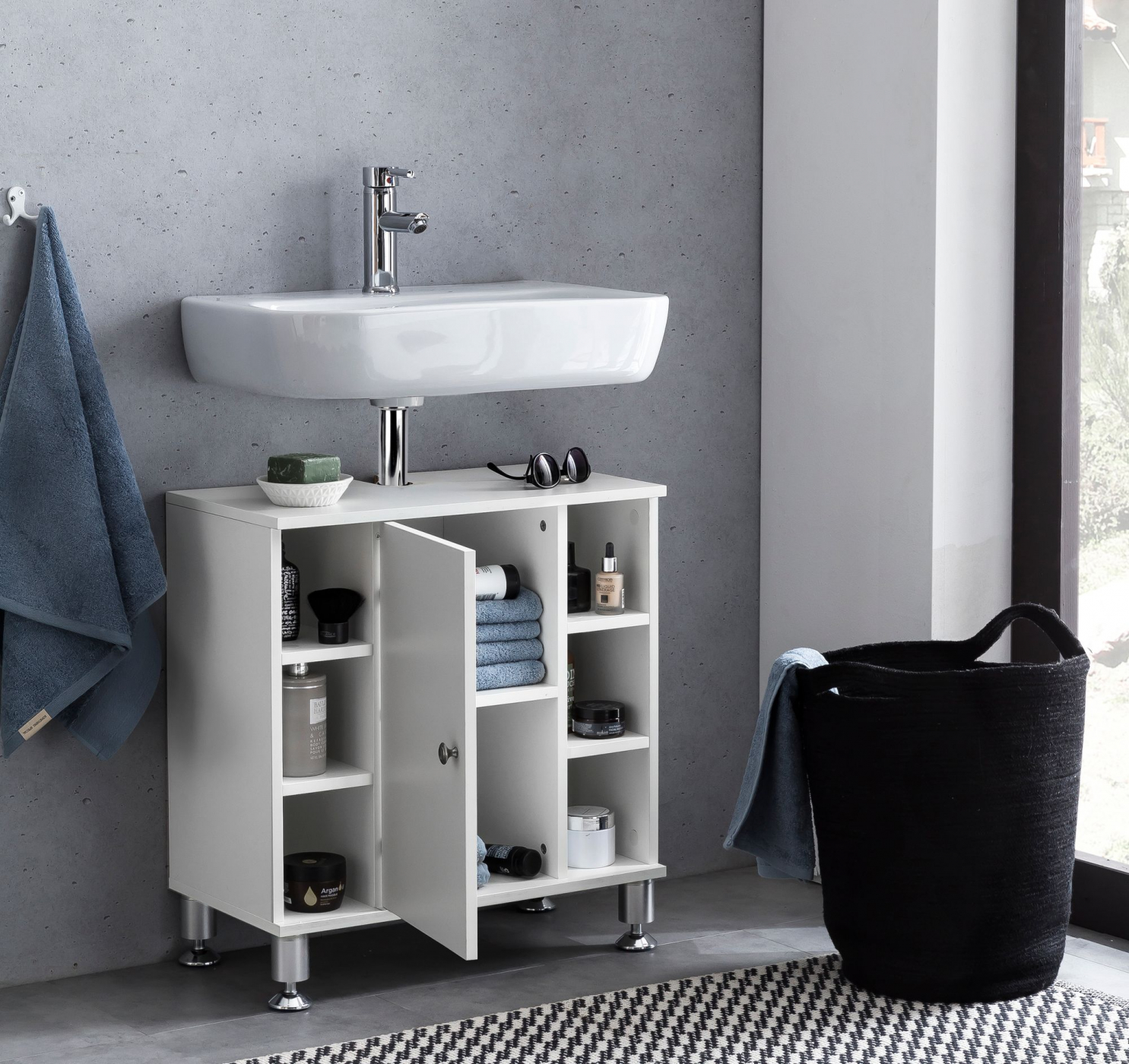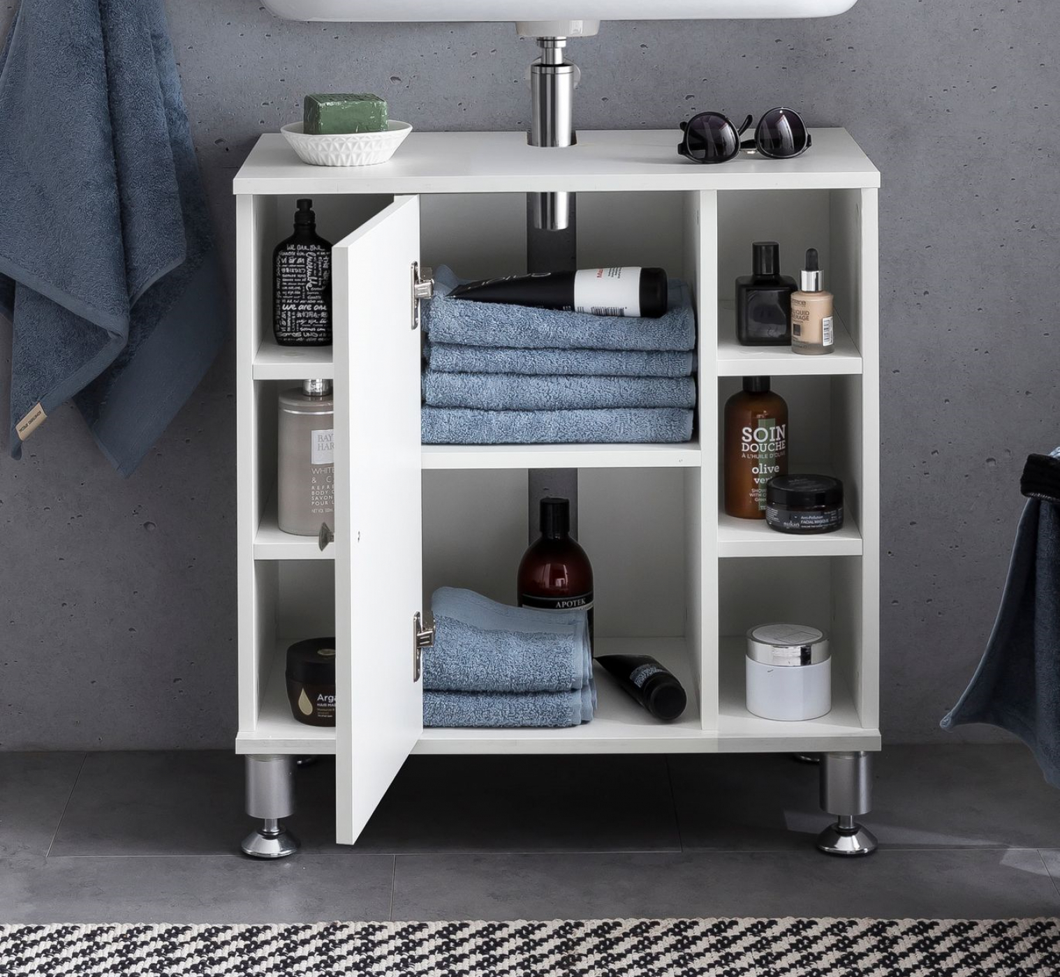 Deze onderkast voor onder de wastafel is ideaal voor elke badkamer. Het wastafel onderbouw meubel is ruimtebesparend en biedt voldoende opbergmogelijkheden zodat uw badkamer ordelijk blijft. De vier pootjes bieden de juiste stabiliteit. Het meubel heeft 6 kleine open opbergvakken, 3 rechts en 3 links en in het midden 1 groot opbergvak met 1 legplank die afgesloten kan worden door middel van een openslaande deur. Kleur: wit. Afmetingen: hoog 64 cm breed 60 cm diep 32 cm. Levering is inclusief handleiding en benodigde montagematerialen.