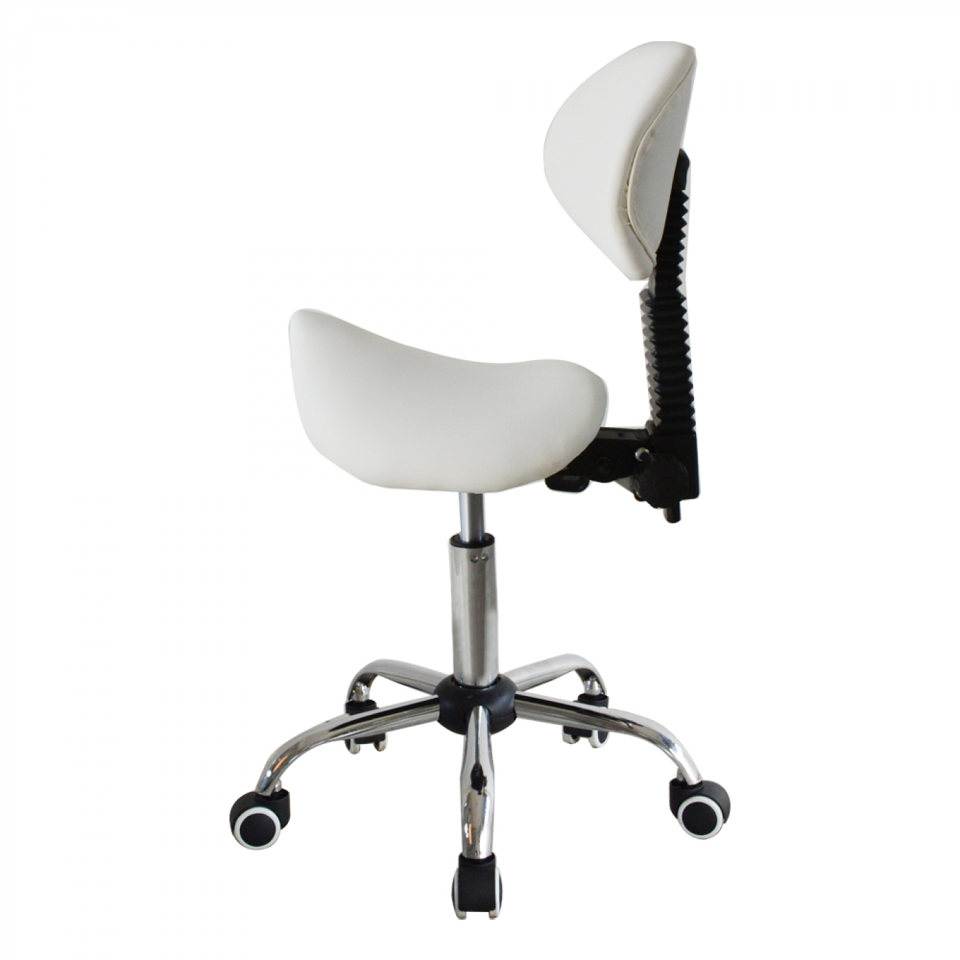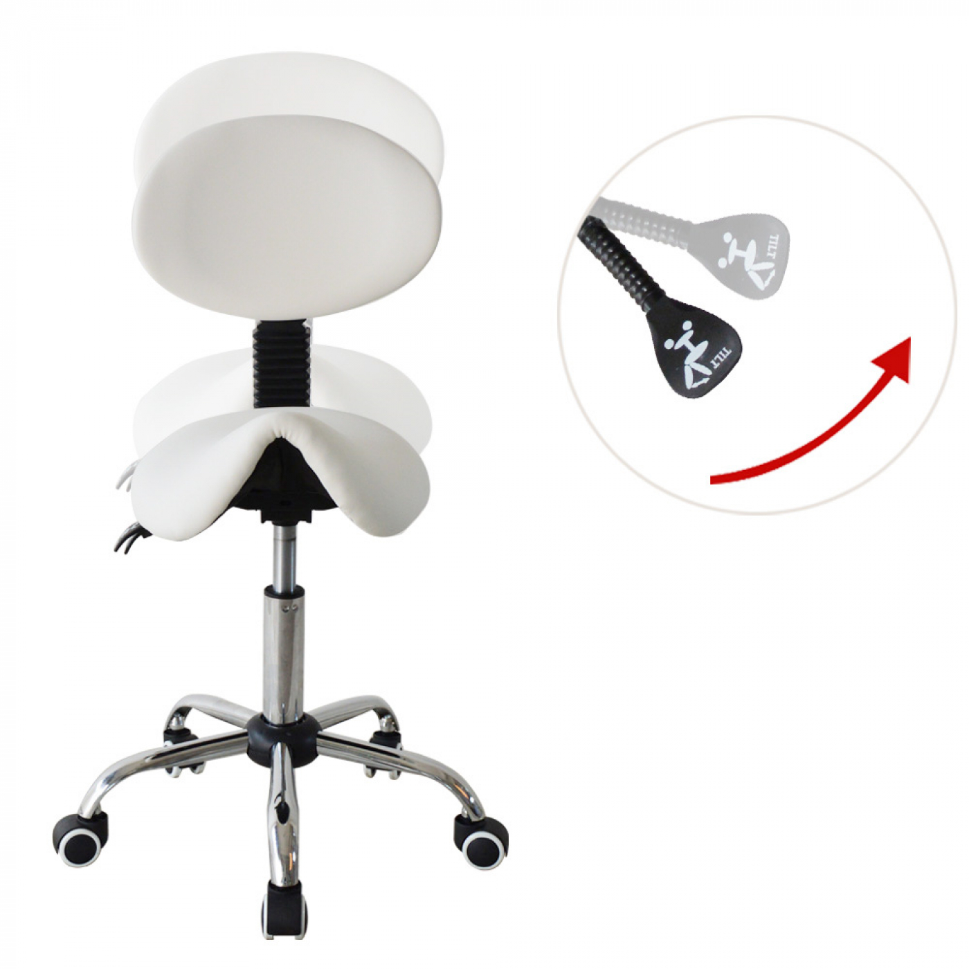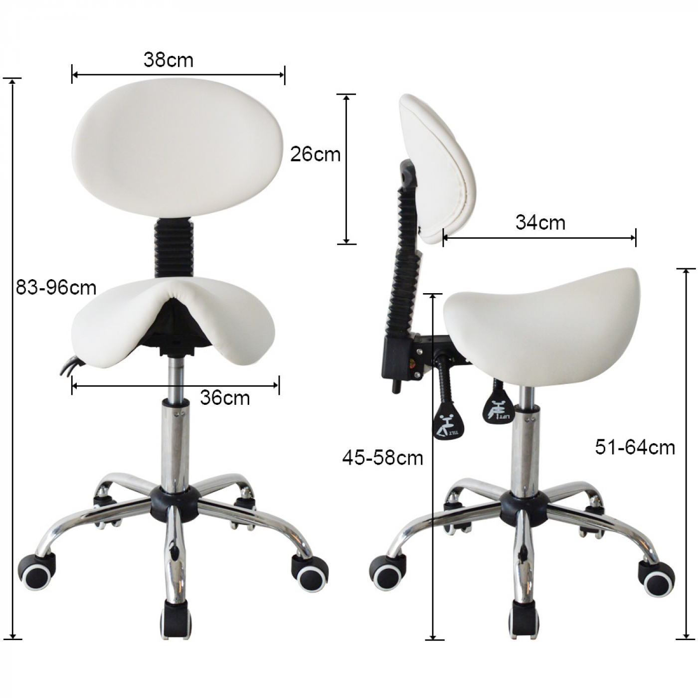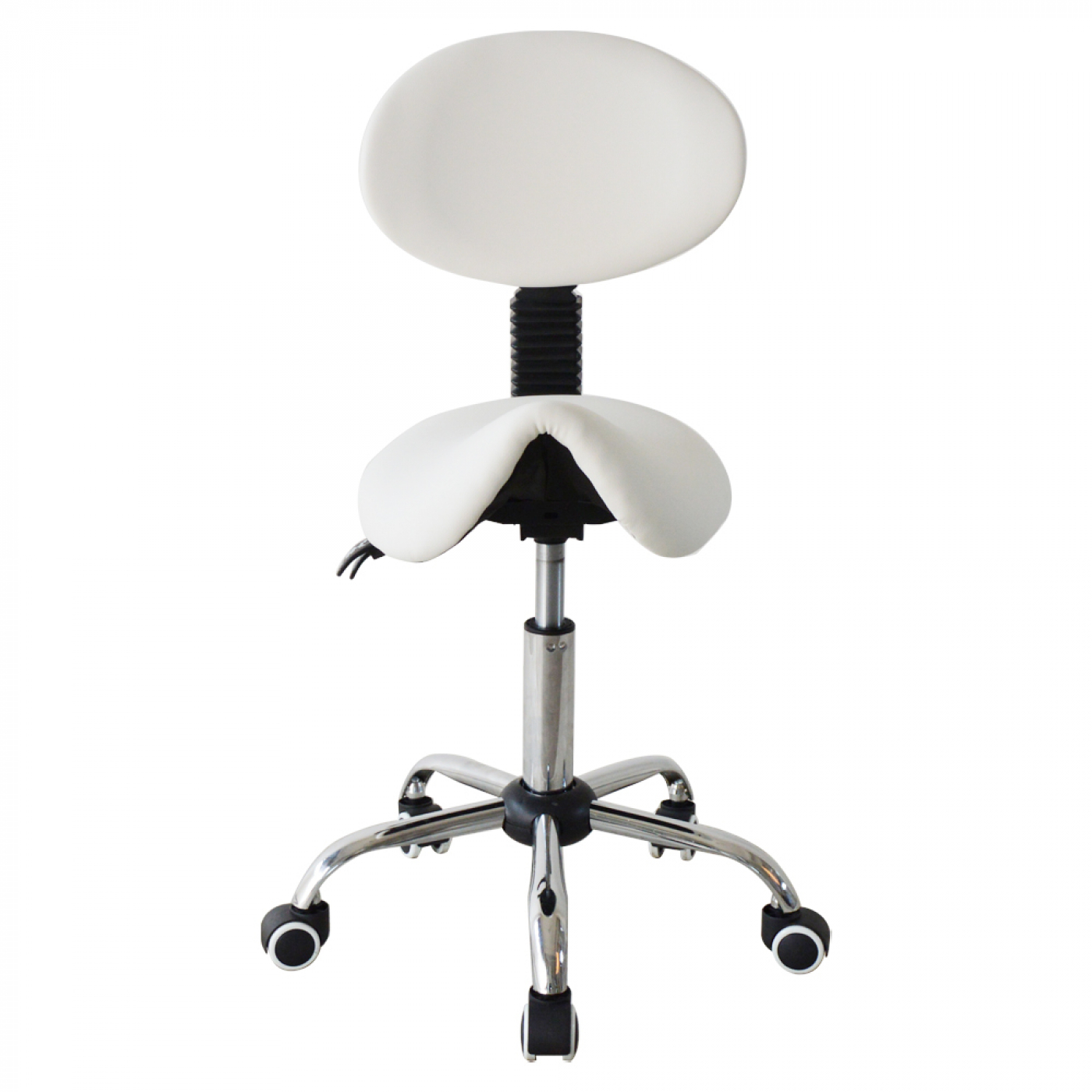 Personen die veelal staand werken en of regelmatig repeterende handelingen verrichten hebben een sterk verhoogde kans op gezondheidsklachten. Dankzij deze witte zadelstoel kapperskruk met ergonomische verstelbare zadelzitting en kantelbare rugleuning werkt u automatisch in een natuurlijke en actieve houding. De ergonomich gevormde zadelzitting met verstelbare rugleuning zorgen voor extra steun in de rug en voor een gezonde werkhouding. De kans op lichamelijke ongemakken verminderen hierdoor aanzienlijk. Deze zadelkruk is traploos in hoogte verstelbaar van 45 cm tot 58 cm waardoor uw ergonomische werkhoogte gegarandeerd is. De stabiliteit wordt gewaarborgd door een zeer sterk onderstel wat standaard voorzien is van een klasse 3 gaslift en soepel lopende zwenkwielen voor grote bewegingsvrijheid op uw werkplek. Een zadelkruk zadelstoel is een perfect hulpmiddel in huis bij huishoudelijke werkzaamheden of voor dagelijks intensief gebruik in een professionele werkomgeving. Voor totale specifieke afmetingen zie specificatie foto.