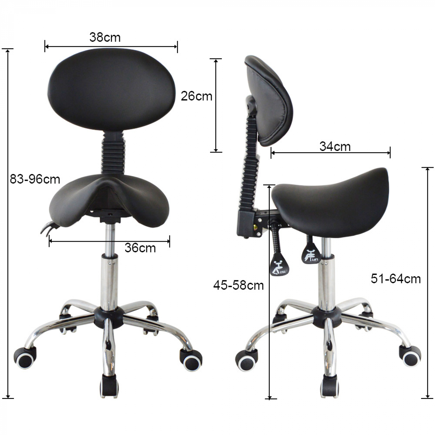 Personen die veelal staand werken en of regelmatig repeterende handelingen verrichten hebben een sterk verhoogde kans op gezondheidsklachten. Dankzij deze zwarte kapperskruk zadelstoel met ergonomische verstelbare zadelzitting en kantelbare rugleuning werkt u automatisch in een natuurlijke en actieve houding. De ergonomich gevormde zadelzitting met verstelbare rugleuning zorgen voor extra steun in de rug en voor een gezonde werkhouding. De kans op lichamelijke ongemakken verminderen hierdoor aanzienlijk. Deze zadelkruk tabouret is traploos in hoogte verstelbaar van 45 cm tot 58 cm waardoor uw ergonomische werkhoogte gegarandeerd is. De stabiliteit wordt gewaarborgd door een zeer sterk onderstel wat standaard voorzien is van een klasse 3 gaslift en soepel lopende zwenkwielen voor grote bewegingsvrijheid op uw werkplek. Een zadelkruk zadelstoel is een perfect hulpmiddel in huis bij huishoudelijke werkzaamheden of voor dagelijks intensief gebruik in een professionele werkomgeving. Voor alle specifieke afmetingen zie specificatie foto.