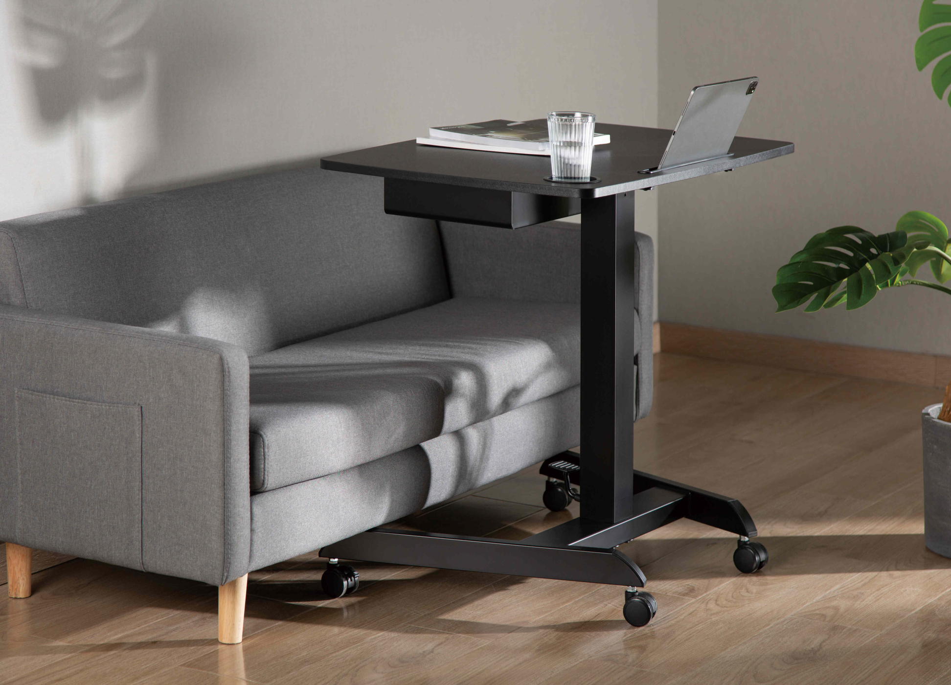 Een verrijdbaar zwart zit-sta bureau werkstation, in hoogte verstelbaar van 76 cm tot 113 cm. Perfect voor flexibel werken: kies eenvoudig of je wilt zitten of staan tijdens vergaderingen, presentaties of thuiswerken. Het ruime bureaublad van 80 cm breed en 58 cm diep, met een dikte van 16 mm, biedt voldoende werkruimte. Inclusief een praktische houder voor tablets en telefoons, en een ingebouwde bekerhouder om morsen te voorkomen. Het werkstation is uitgerust met een open lade onder het werkblad voor extra opbergruimte. Dankzij de enkele kolom en de vier wielen verplaats je het bureau eenvoudig naar de gewenste locatie. Dit zit-sta bureau kan maximaal 10 kg dragen en is ideaal voor gebruik in zowel kantoor- als thuisomgevingen.